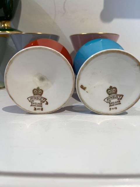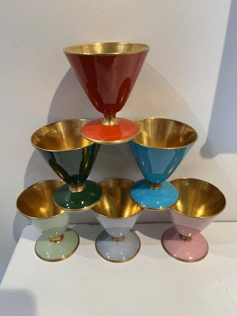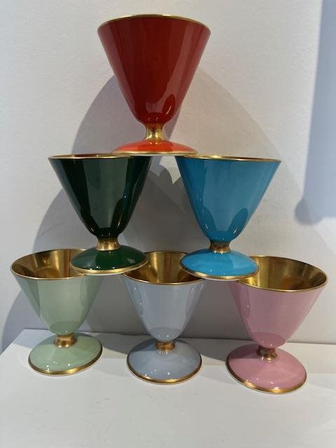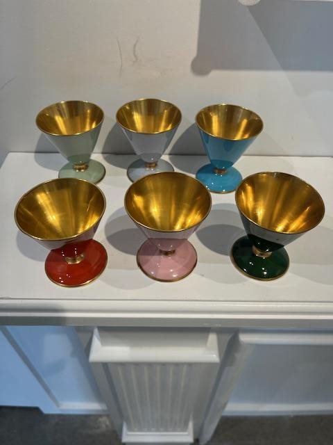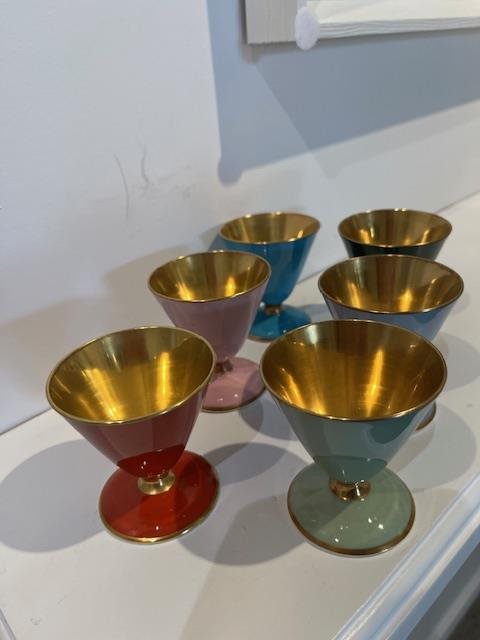 Beautiful bone china set of 6 bowls/cups. Suitable for a sweet dessert or even a special drink. Each has gilt interiors, stems and edges, and each are different colour, (burgandy, blue, green, pink,surf green, baby blue)