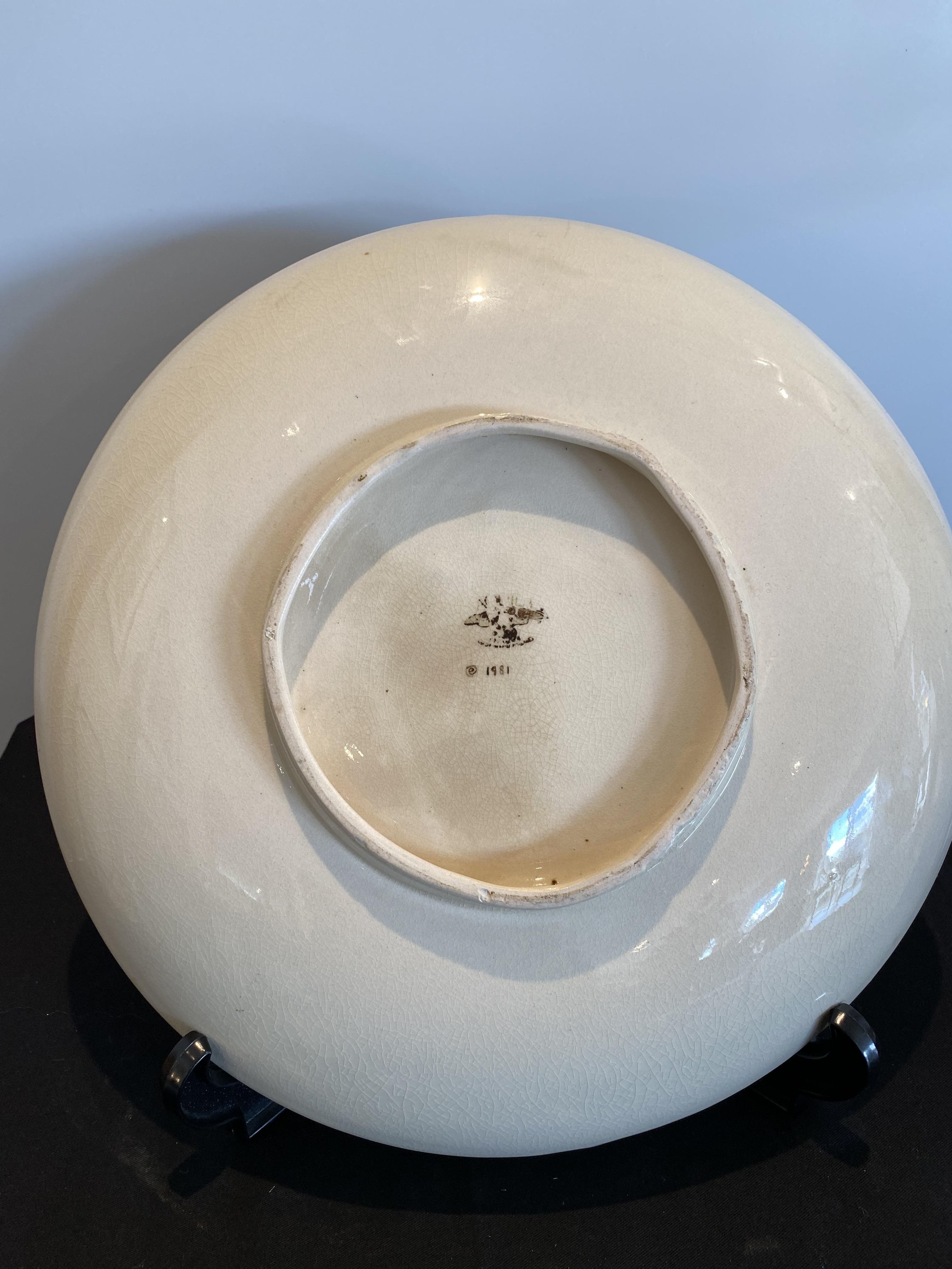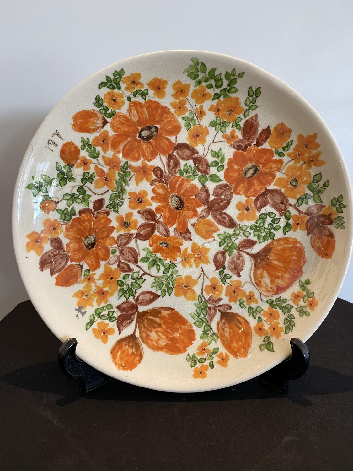A unique Aquila pottery charger by Ana Burt, painted with a flower head and leaf design on a cream ground, signed. Aquila, (NZ Pottery), factory stamp to the base. Diameter 360mm