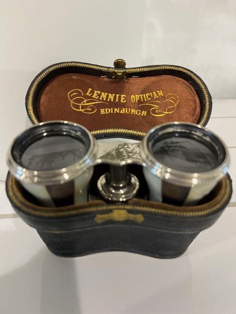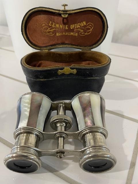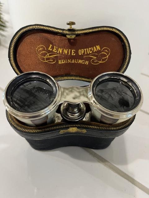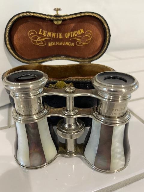 Beautiful pair of opera glasses in Mother of Pearl. Lennie Optician, Princes street, Edinburgh.