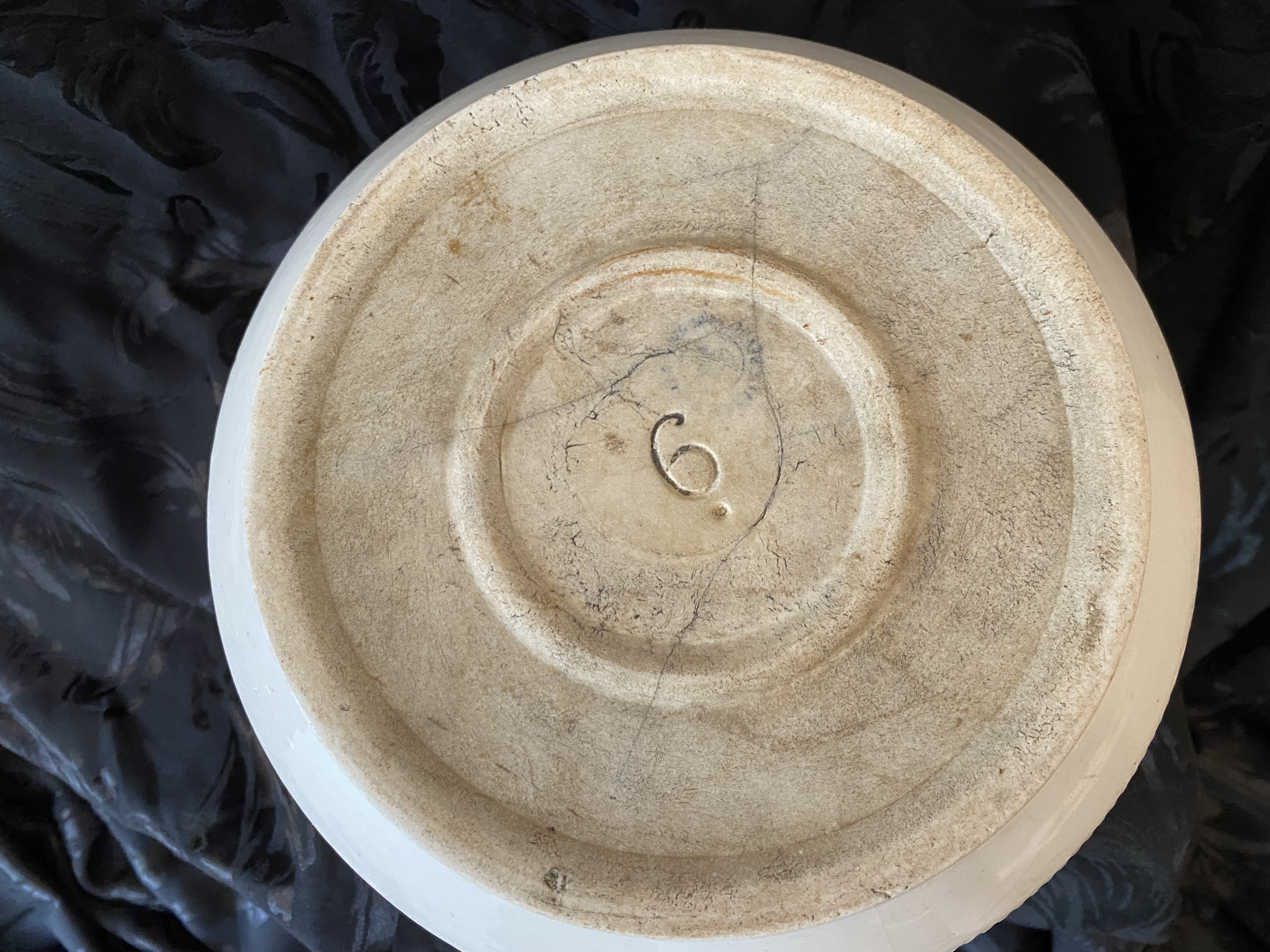 Lovely old French stonewear baking dish with handles. Blue and black decoration in the form a a fruit. Marked "6" to base.