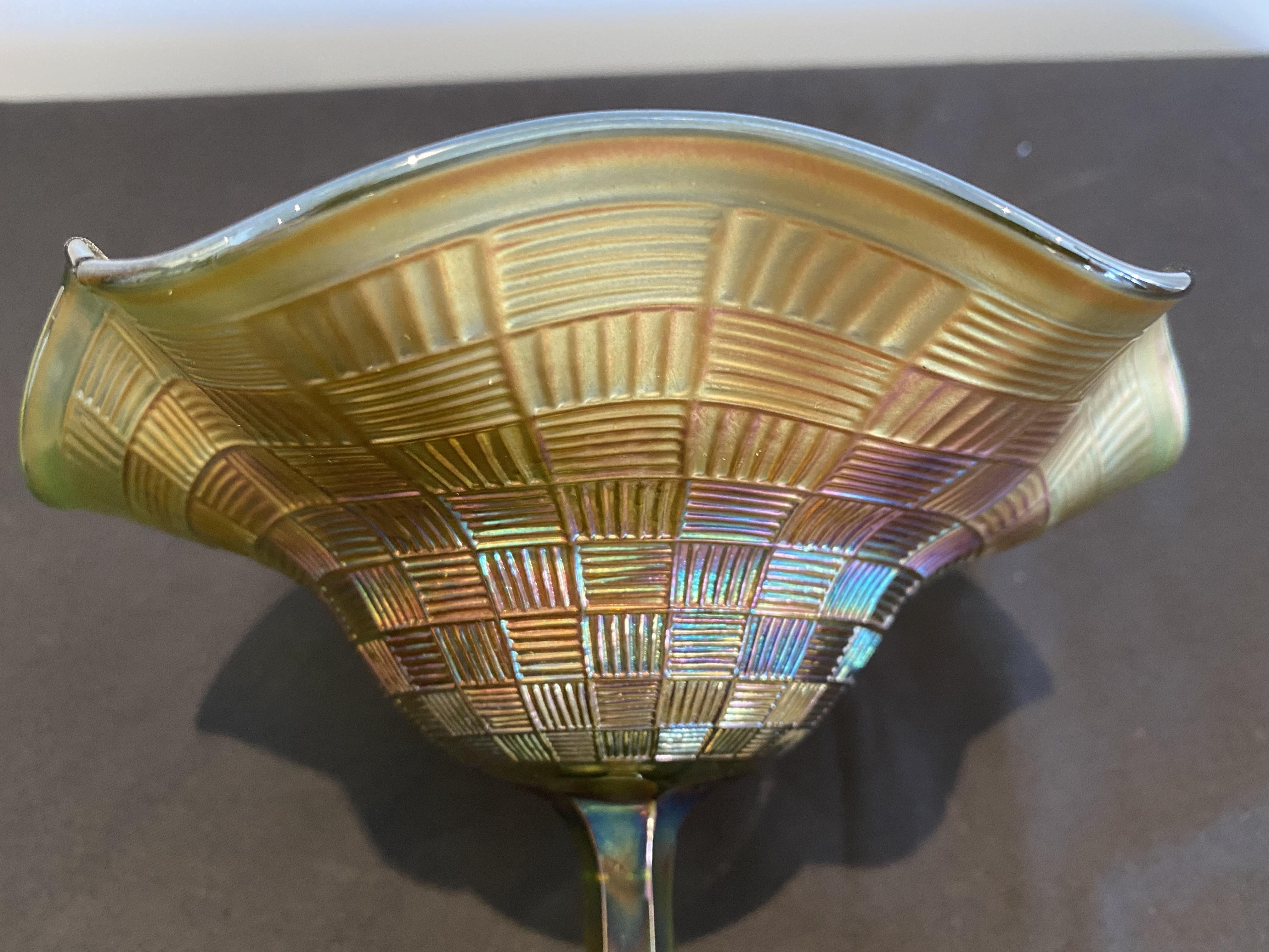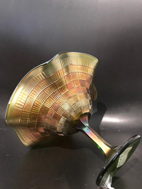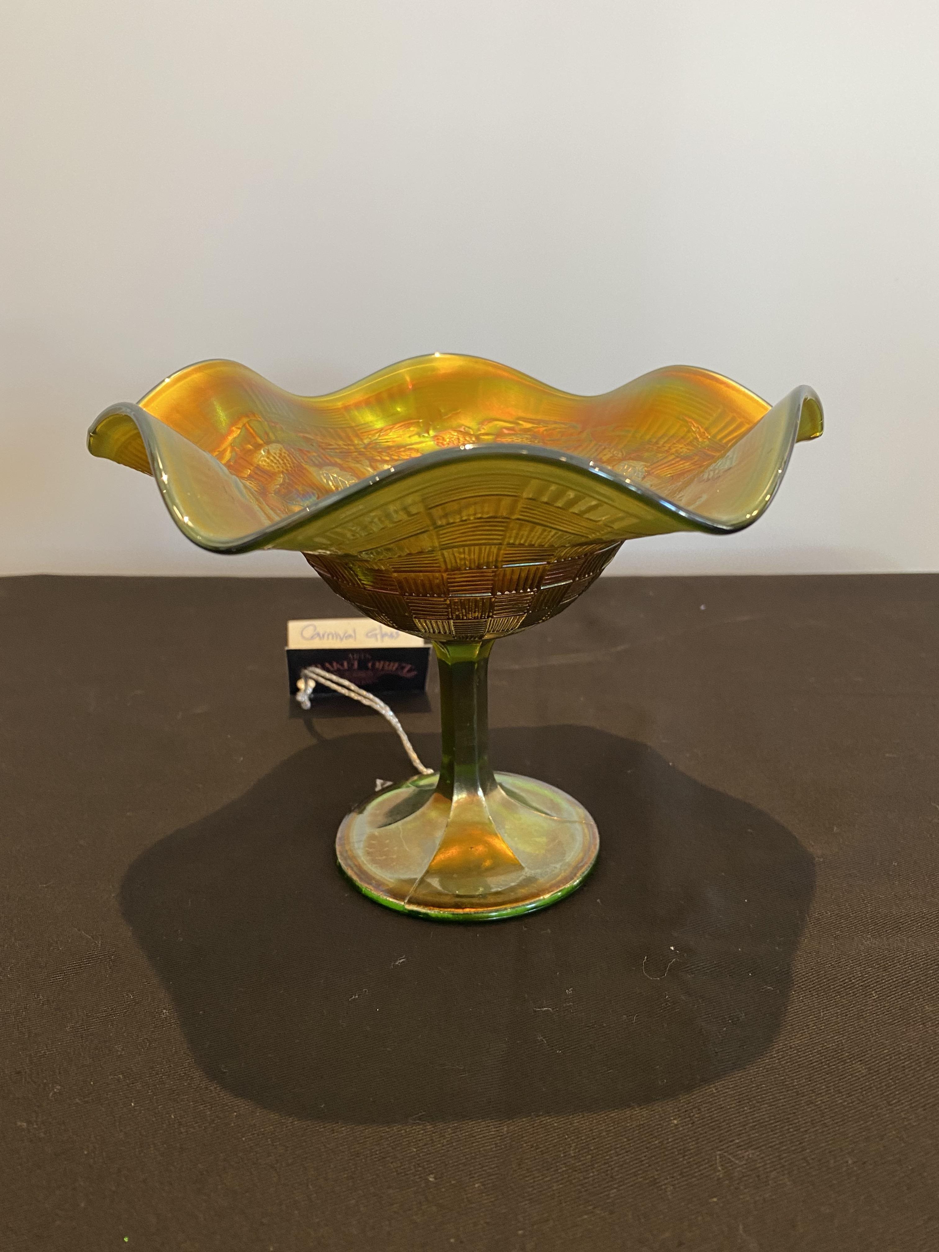 Carnival glass has been known by many other names in the past: aurora glass, dope glass, rainbow glass, taffeta glass, and disparagingly as 'poor man's Tiffany'. Its current name was adopted by collectors in the 1950s from the fact that it was sometimes given as prizes at carnivals, fetes, and fairgrounds. However, that can be misleading as people tend to think that all of it was distributed in this way but evidence suggests that the vast majority of it was purchased[1] by the housewife to brighten up the home at a time when only the well-off could afford bright electric lighting.