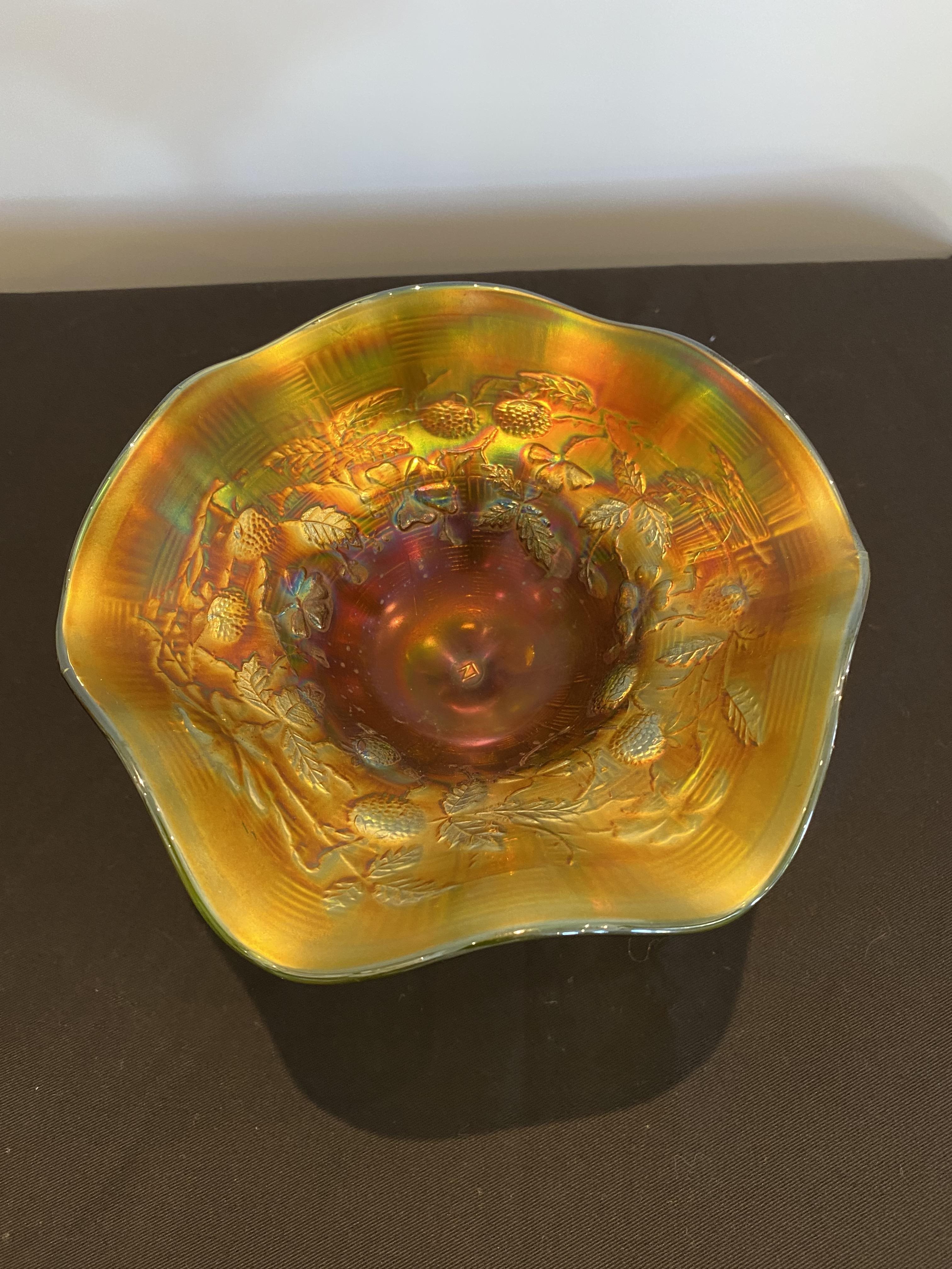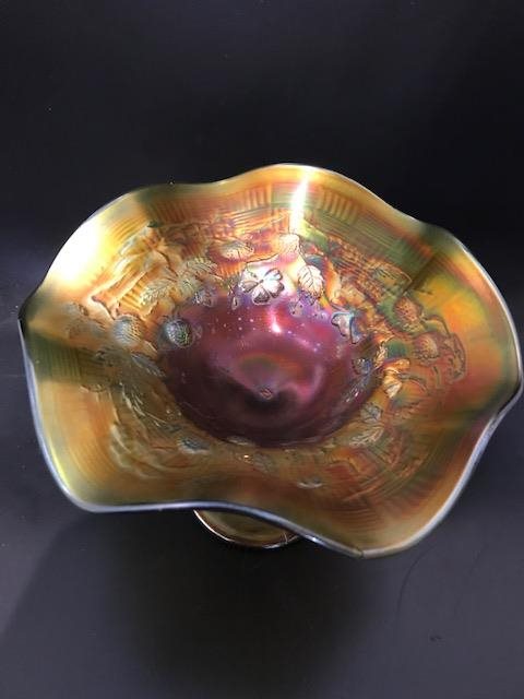 Carnival glass is moulded or pressed glass. It gets its iridescent sheen from the application of metallic salts while the glass is still hot from the pressing. A final firing of the glass brings out the iridescent properties of the salts, giving carnival glass the distinct shine it is known for.