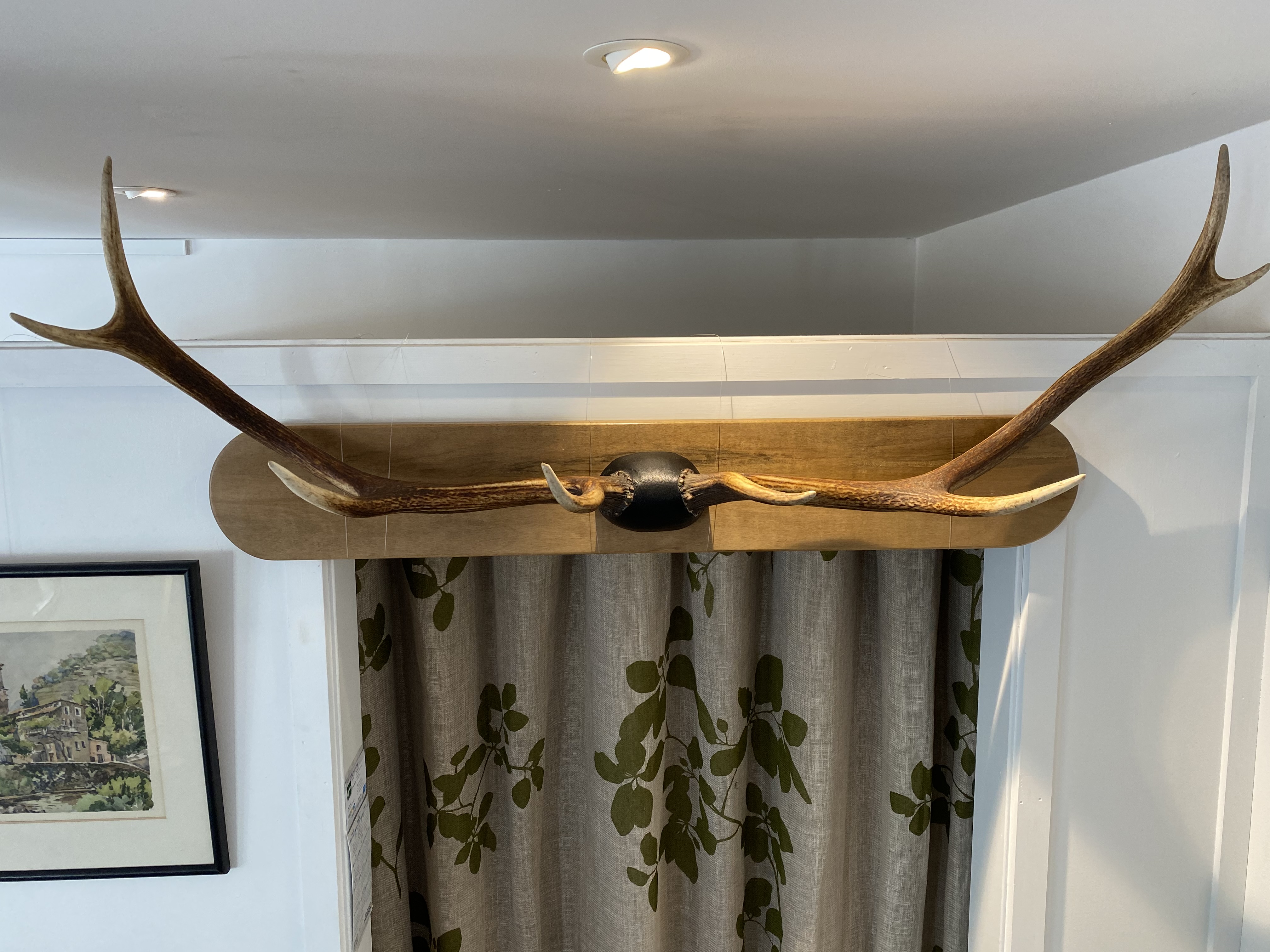 Beautifully crafted by a professional taxidermist, this pair of antlers are mounted on a hardwood backboard with genuine deer leather covering the coronet..