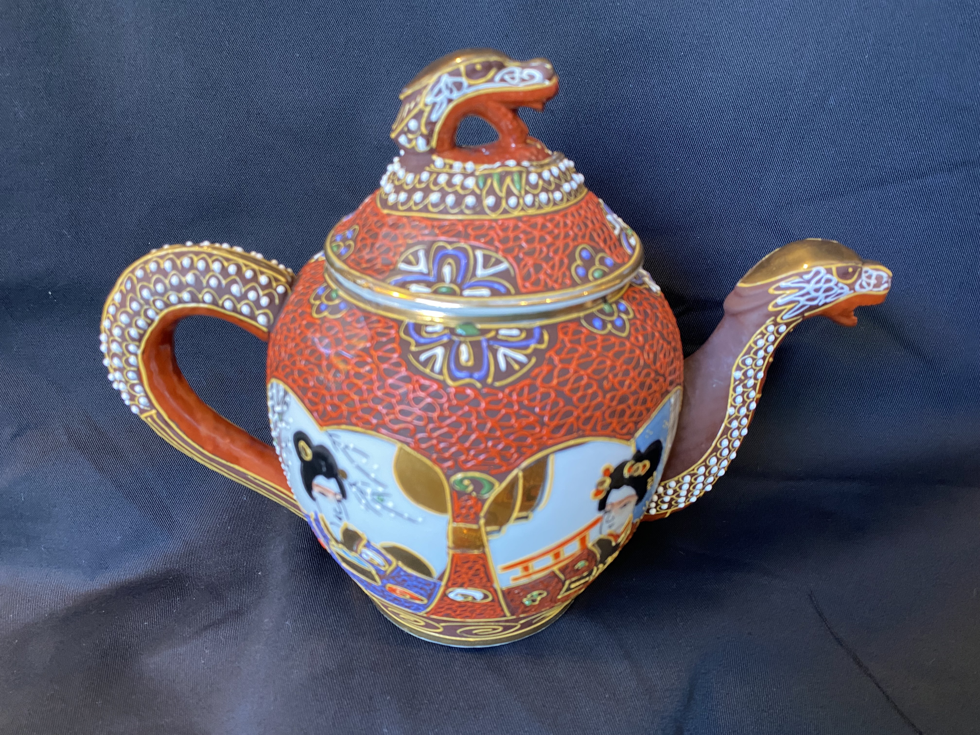 Glorious Japanese Satsuma Moriage Dragon Ware Tea set from the early 20th century. Comprising two Teapots,( or one creamer), Sugar bowl, and two trios of tea cups with saucers and side plates. Moriage is a slip decoration of raised enamels. It occurs on Satsuma wares as early as circa 1890. Moriage also seems to be limited to pieces made outside of the Satsuma domain while being typical for Kyoto Satsuma ware.