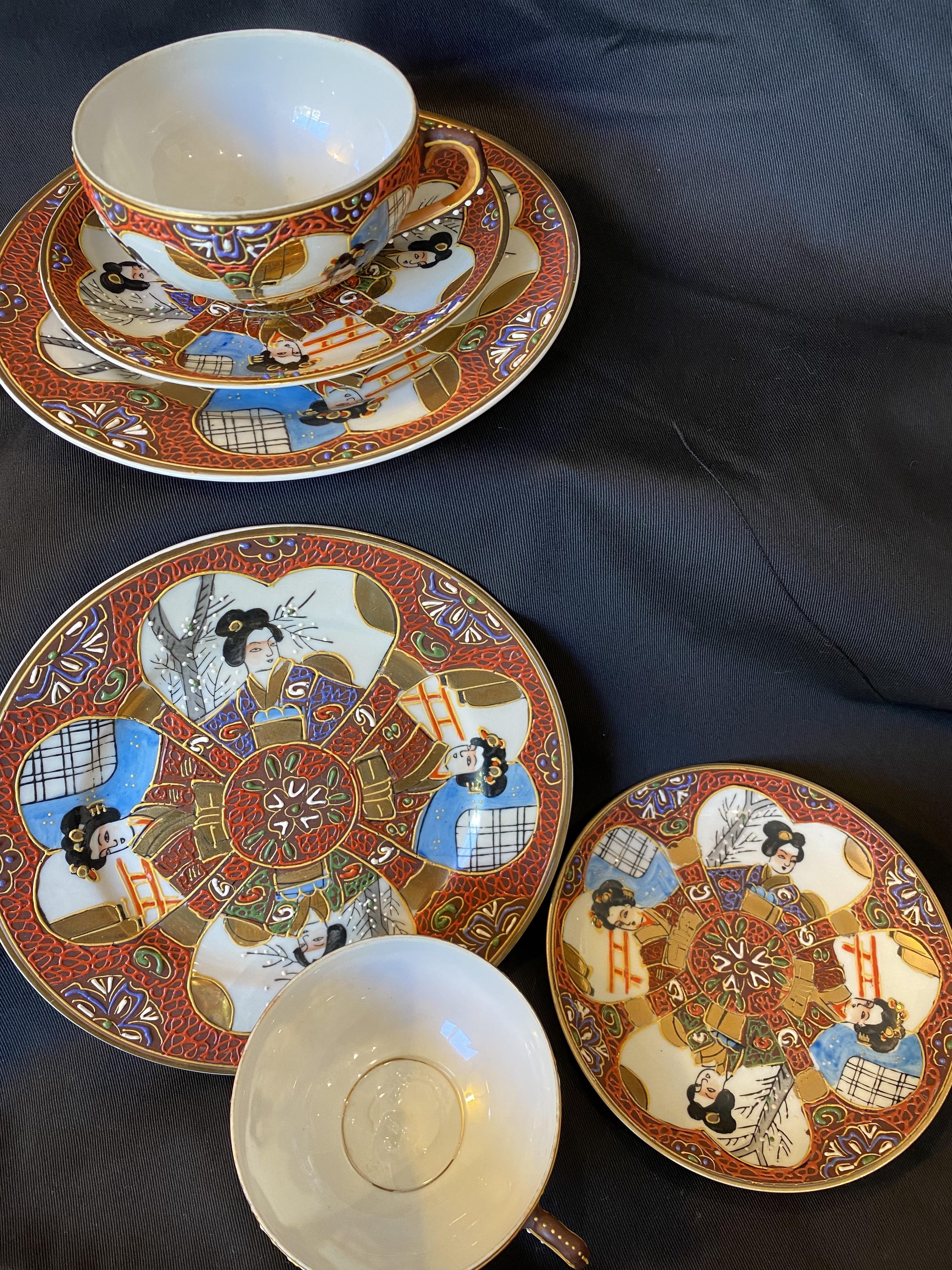 Teacups have lithopane bases where images of Geishas are visable when held up to the light.