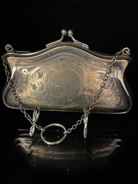 Late 19th or early 20th century silver plate, (EPNS), ladies evening purse. Beautifully engraved decoration.