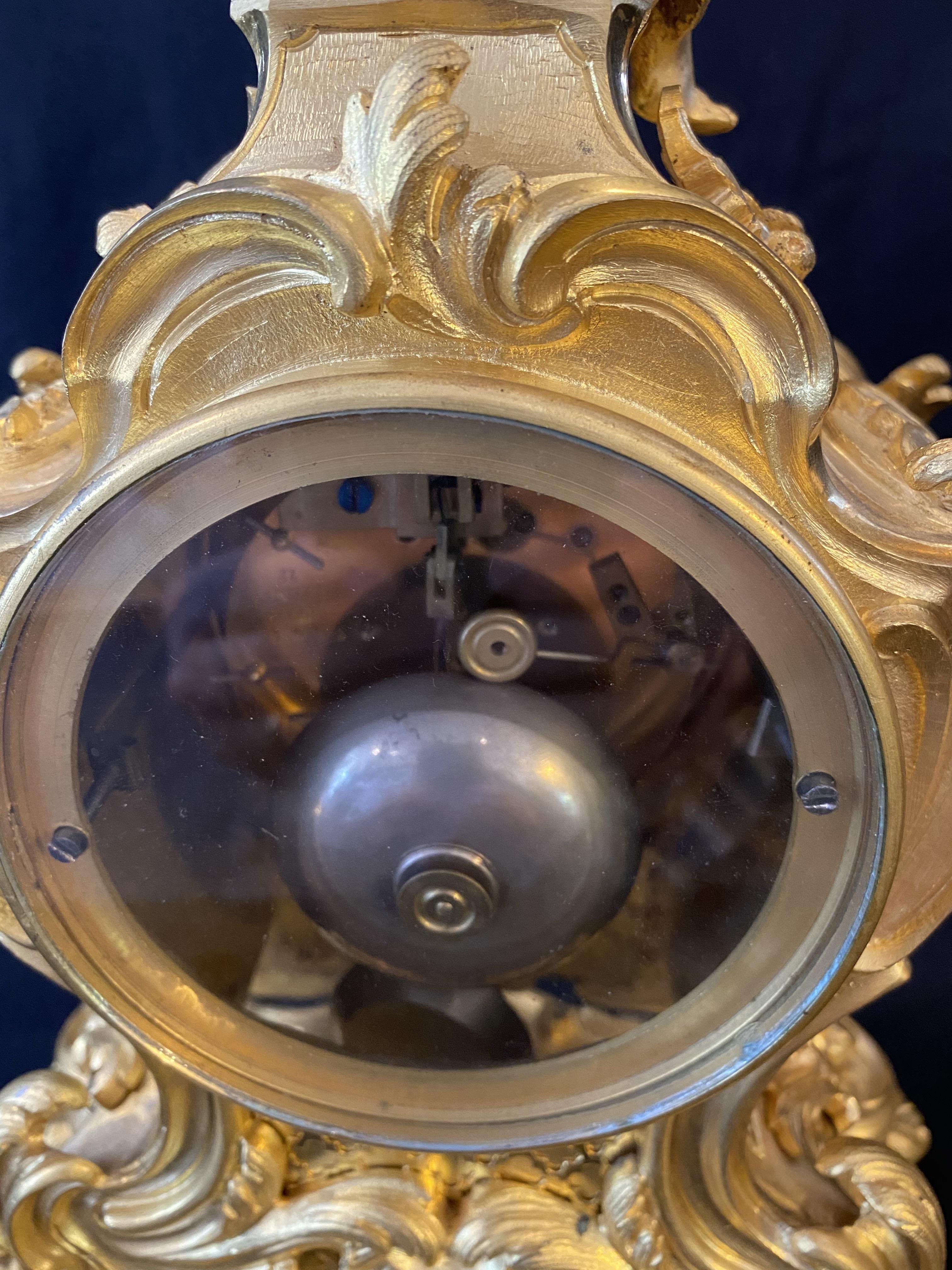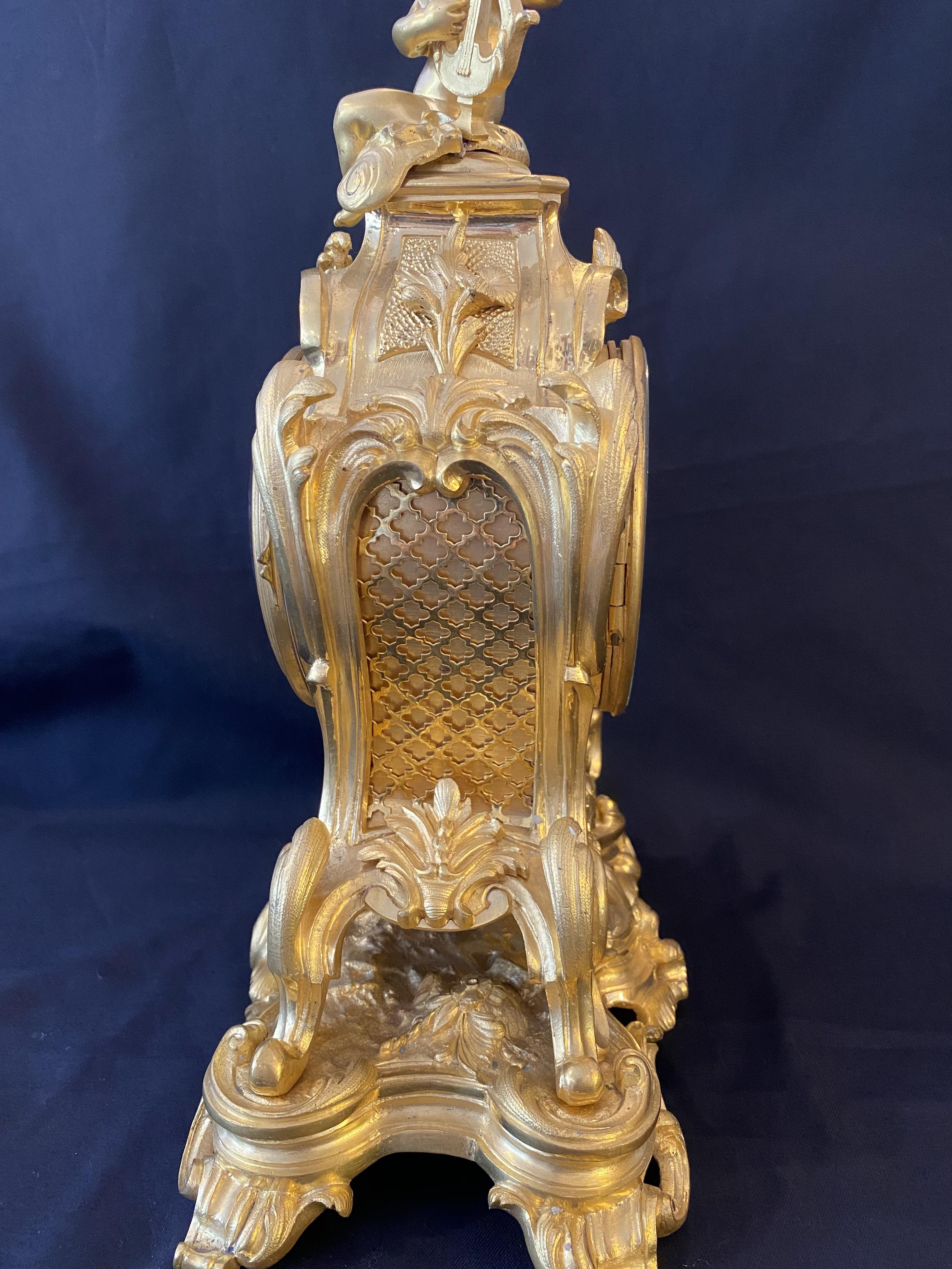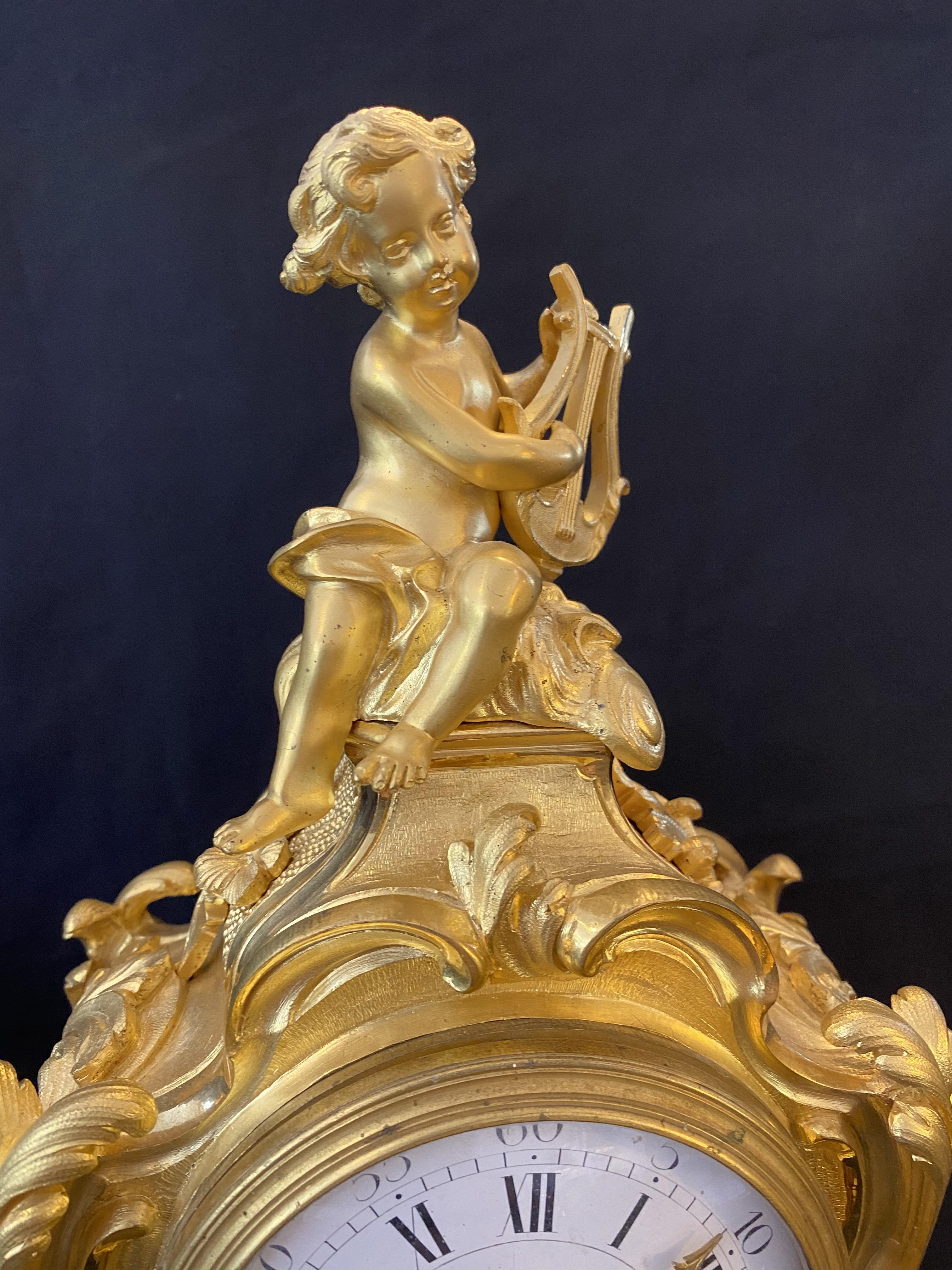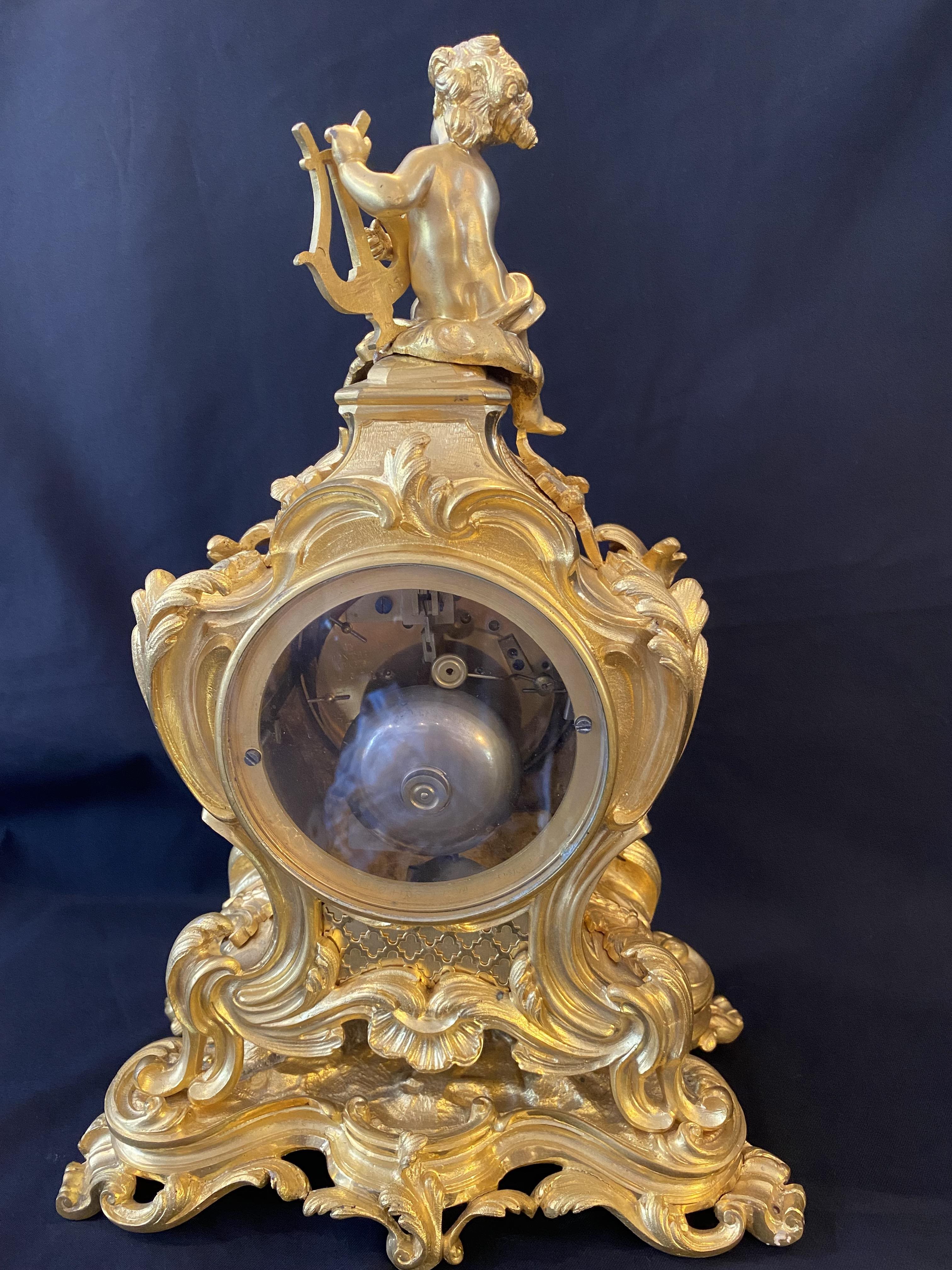 This is a stunning mantel clock in excellent condition. Fire guilded in gold and surmounted with a cherub playing a lyre. Cica 1870.