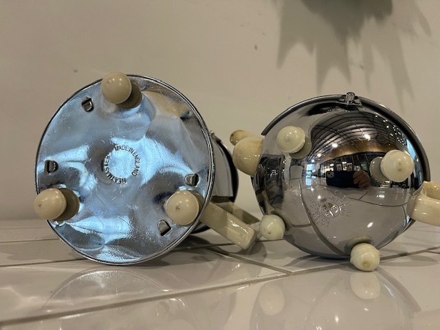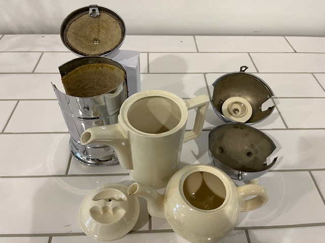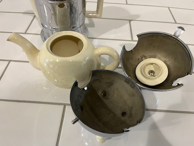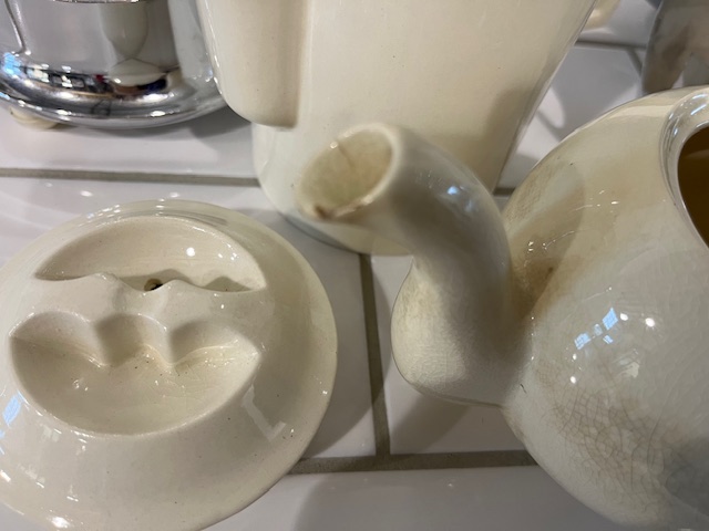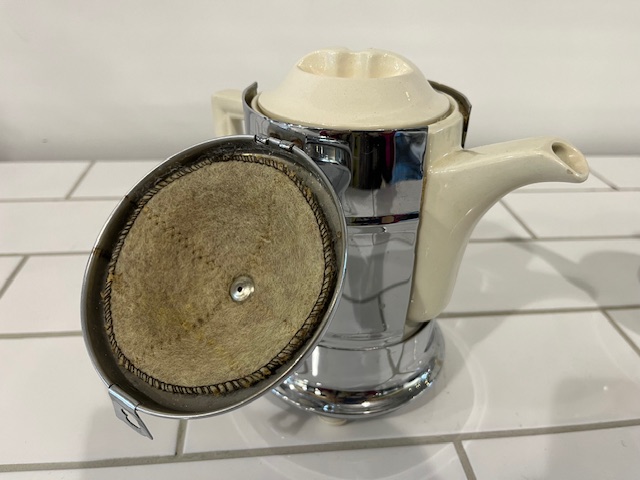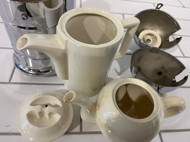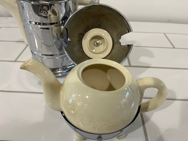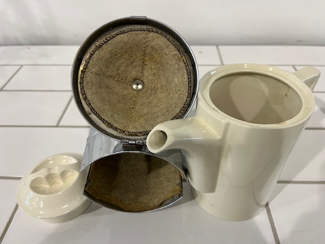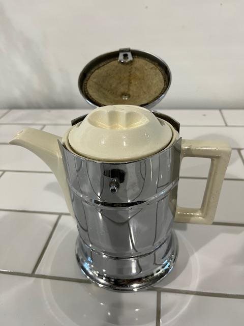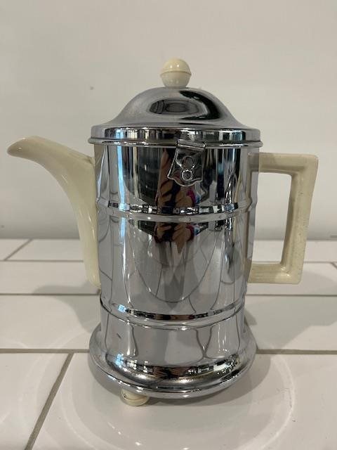 Classic 1930's design. This English set is ceramic but sheathed in chromed metal for insulation.