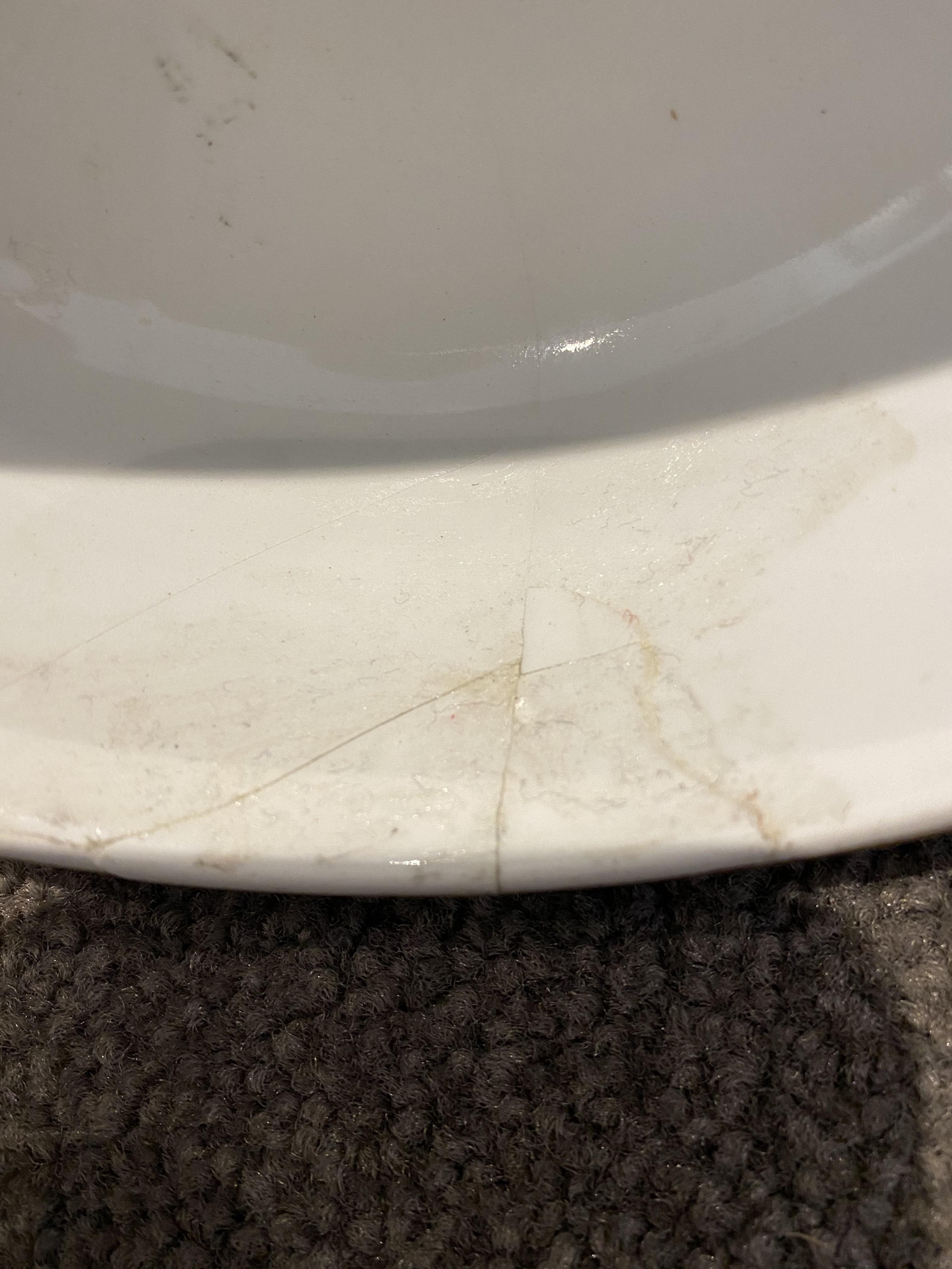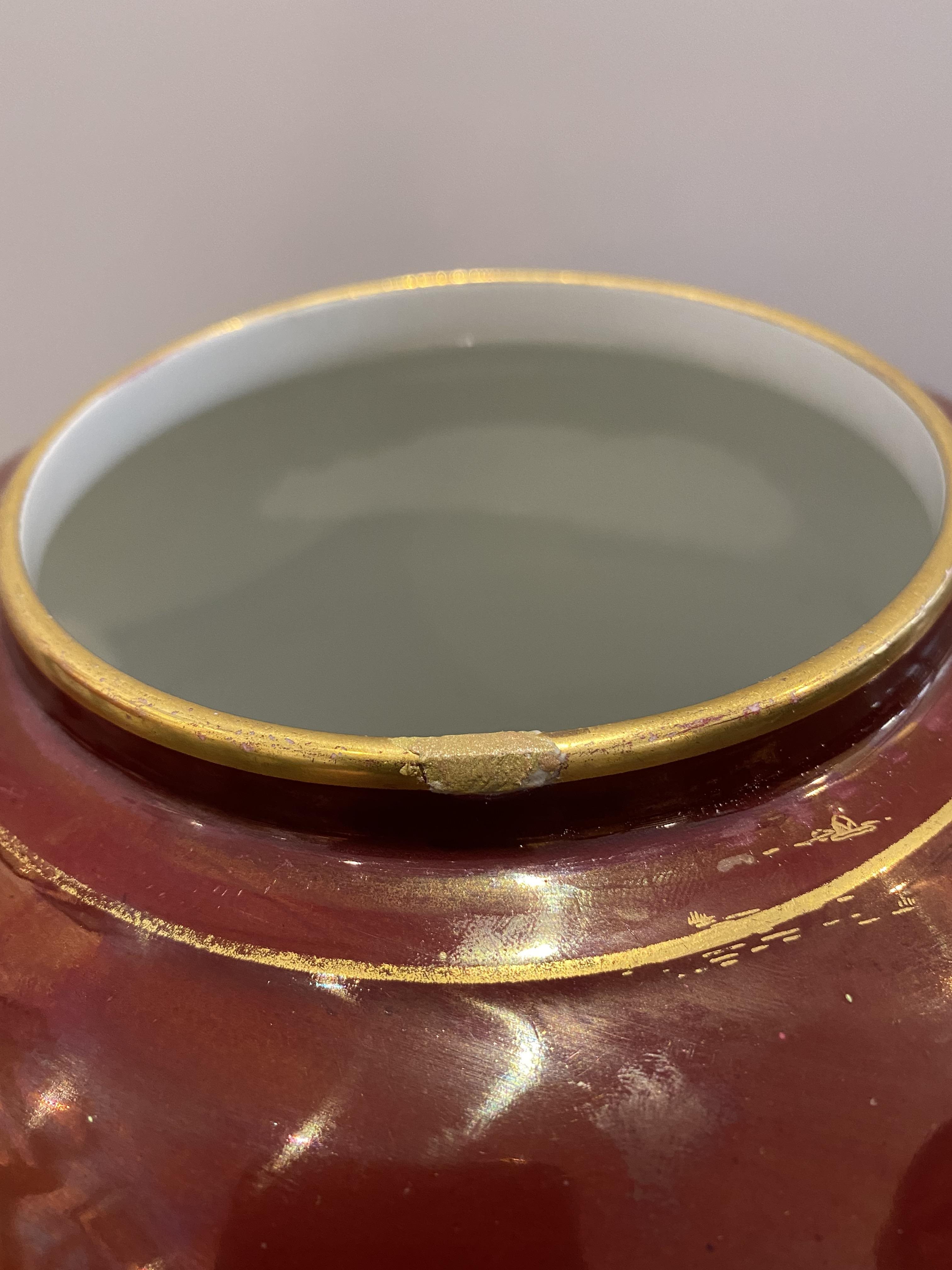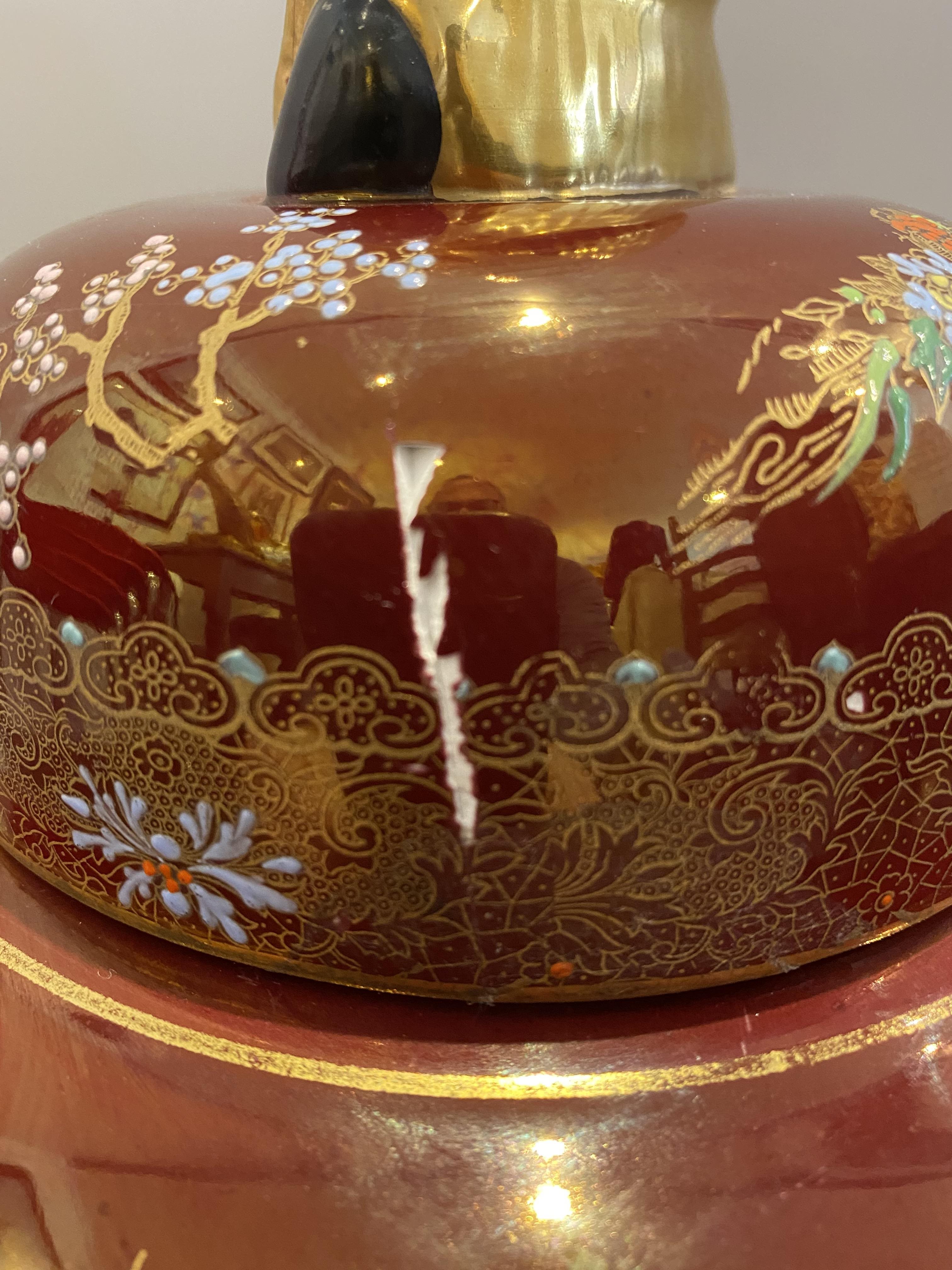 There is a repair to the lid and also a repaired chip to the rim of the jar.
