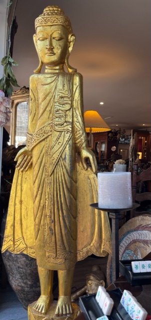 Spectacular large carved wooden standing Budda. He is standing as he has reached Nirvana and is ready to teach. His palms open and pointing downwards denoting generosity.