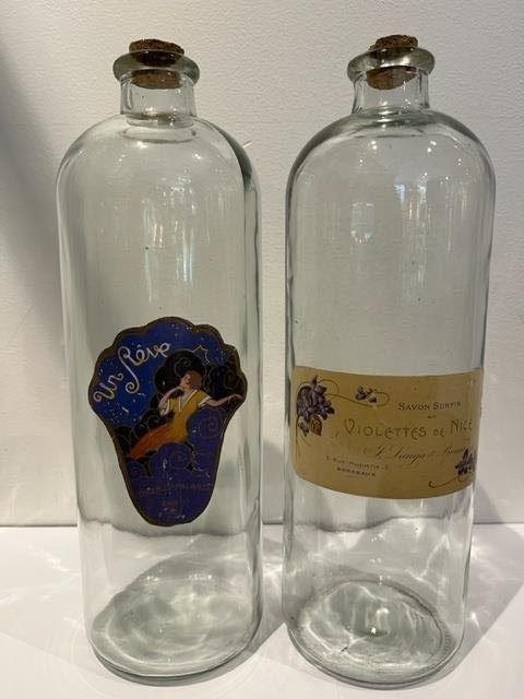These old French Perfume Bottles with cork stoppers date from the early 20th century and would have contained bulk fragrance for decanting into smaller bottles. Labels read "Violettes De Nice", (circa 1915), and "Un Reve",(a dream), by Lorenzy-Palanca, Paris, (circa 1920)