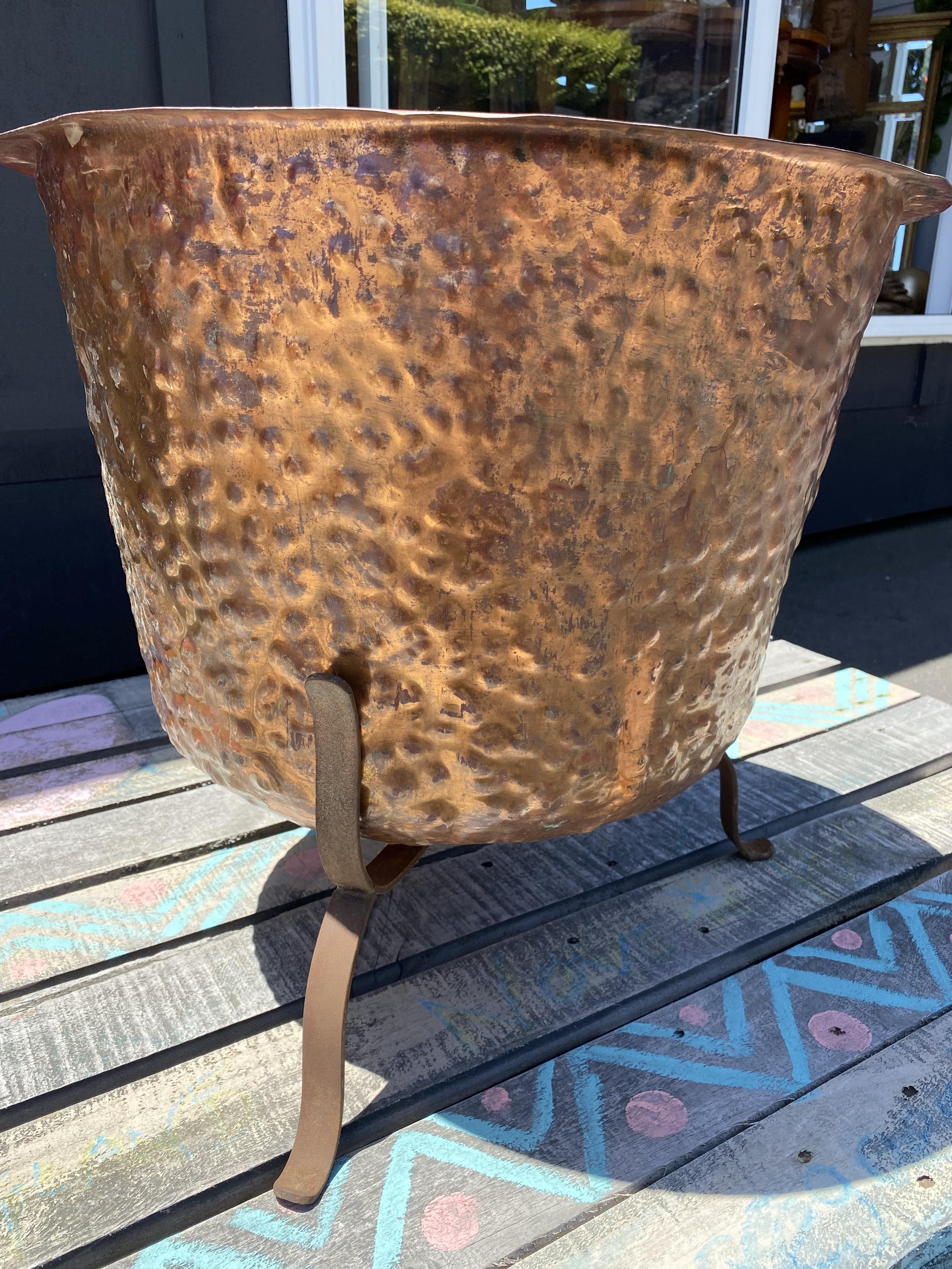 This example has a beaten finish and measures 570 mm in diamter. Height 390 mm. Includes stand.