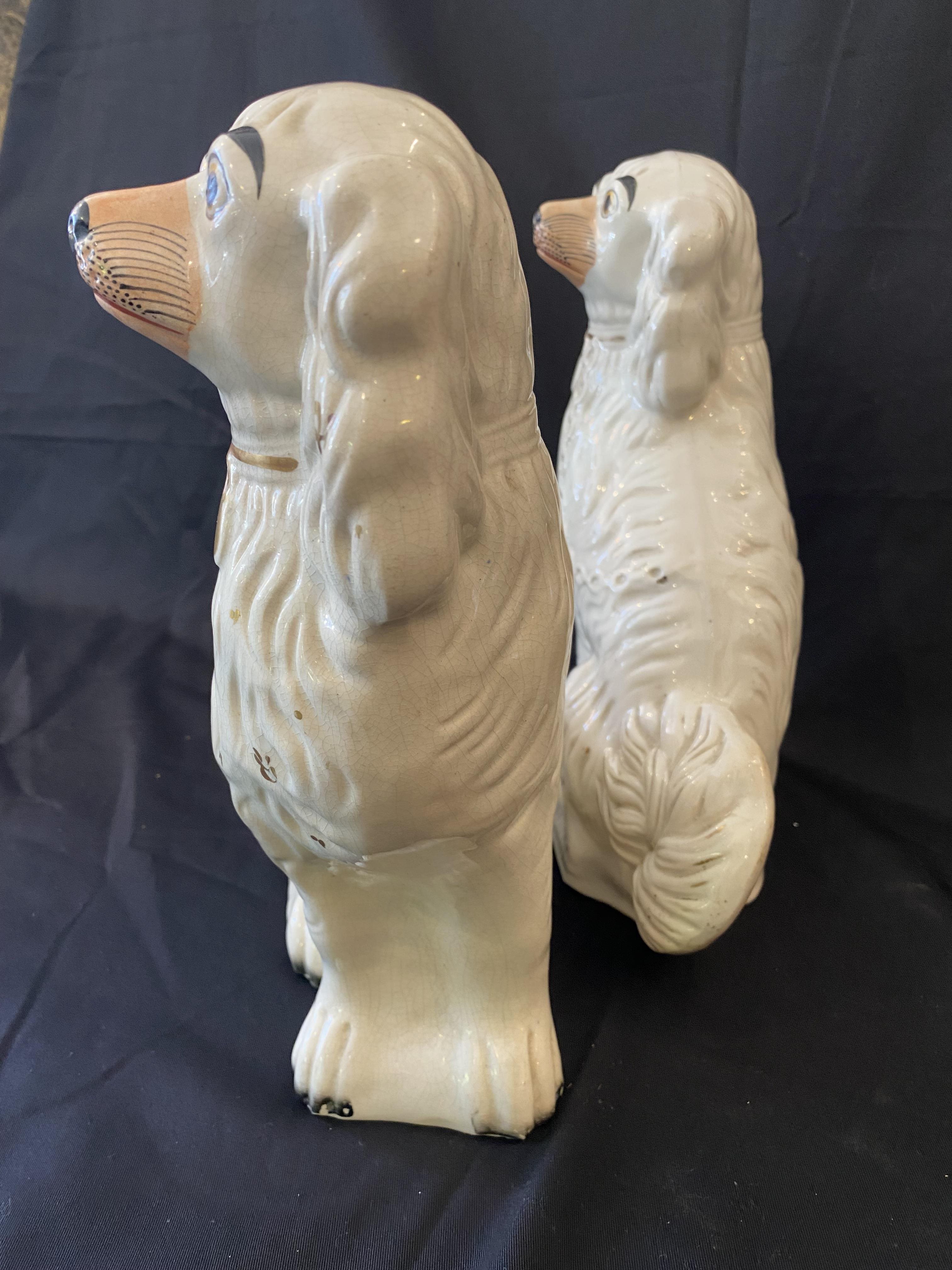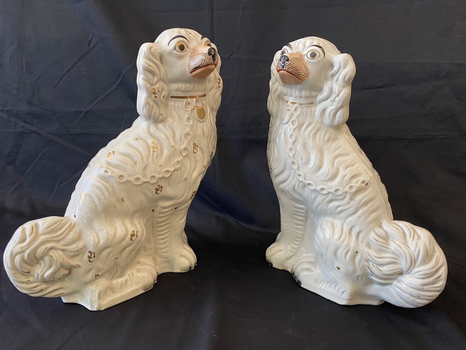 Standing 330 mm tall, these are a large pair of Dogs in the traditional white glaze with pink muzzels. Staffordshire Spaniels facial expressions vary but this pair has a very confident and slightly fierce expression although like the Mona Lisa its a bit hard to decipher. Much of the gold to the chain and lockets has now worn away but the pair is in lovely condition with no chips or breaks. Marked on the base is the name L.B.West and the model number "1". Good quality pairs like this are becoming harder to find.