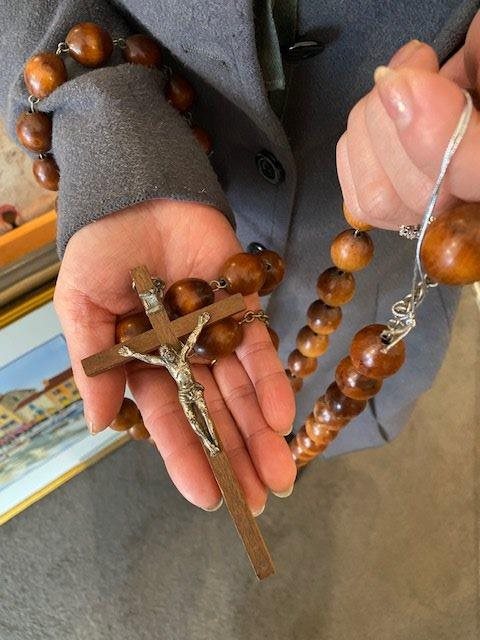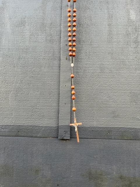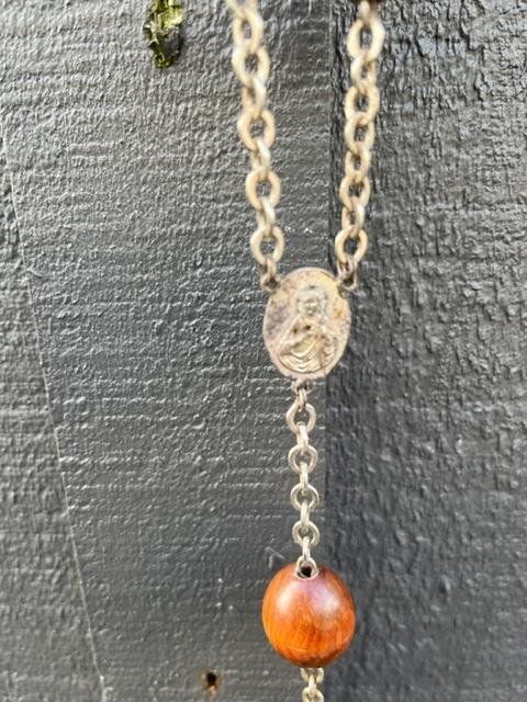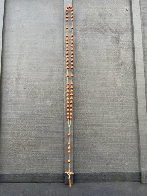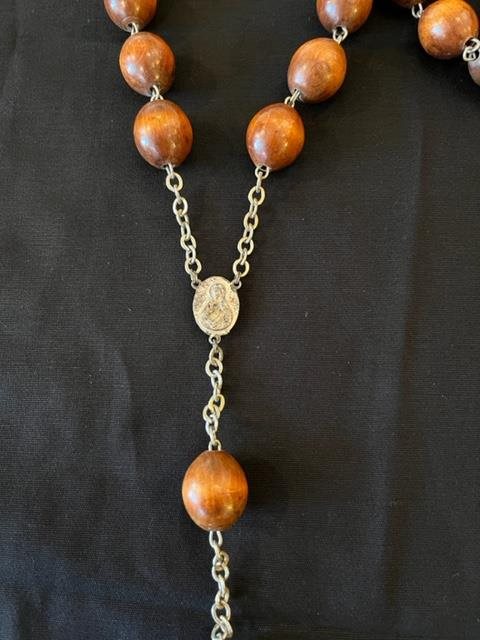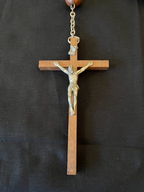 This beautiful Rosary is approximately 1430 mm long with beads 17mm in diameter. The wooden cross with cast metal Christ is 170 mm long.