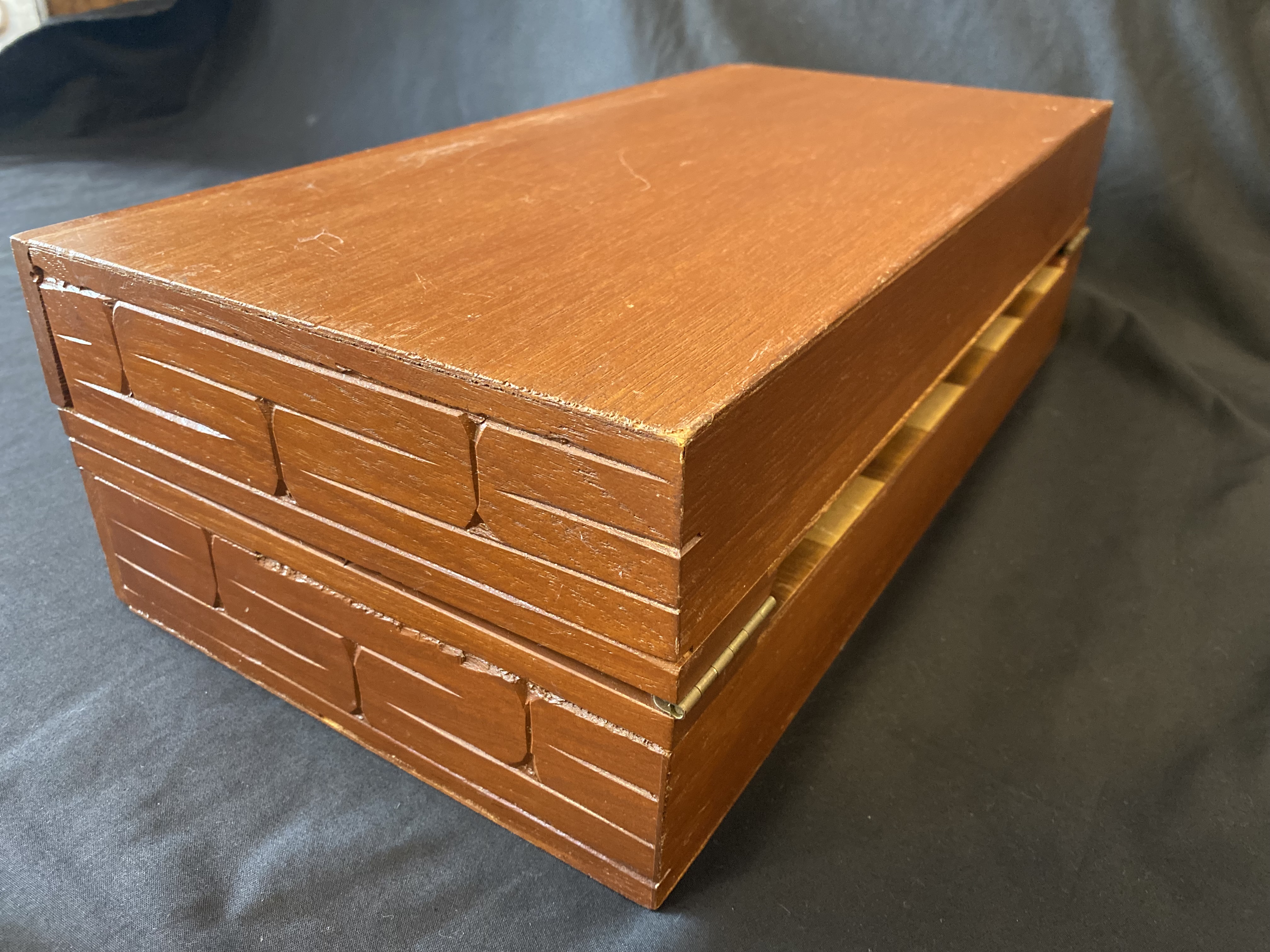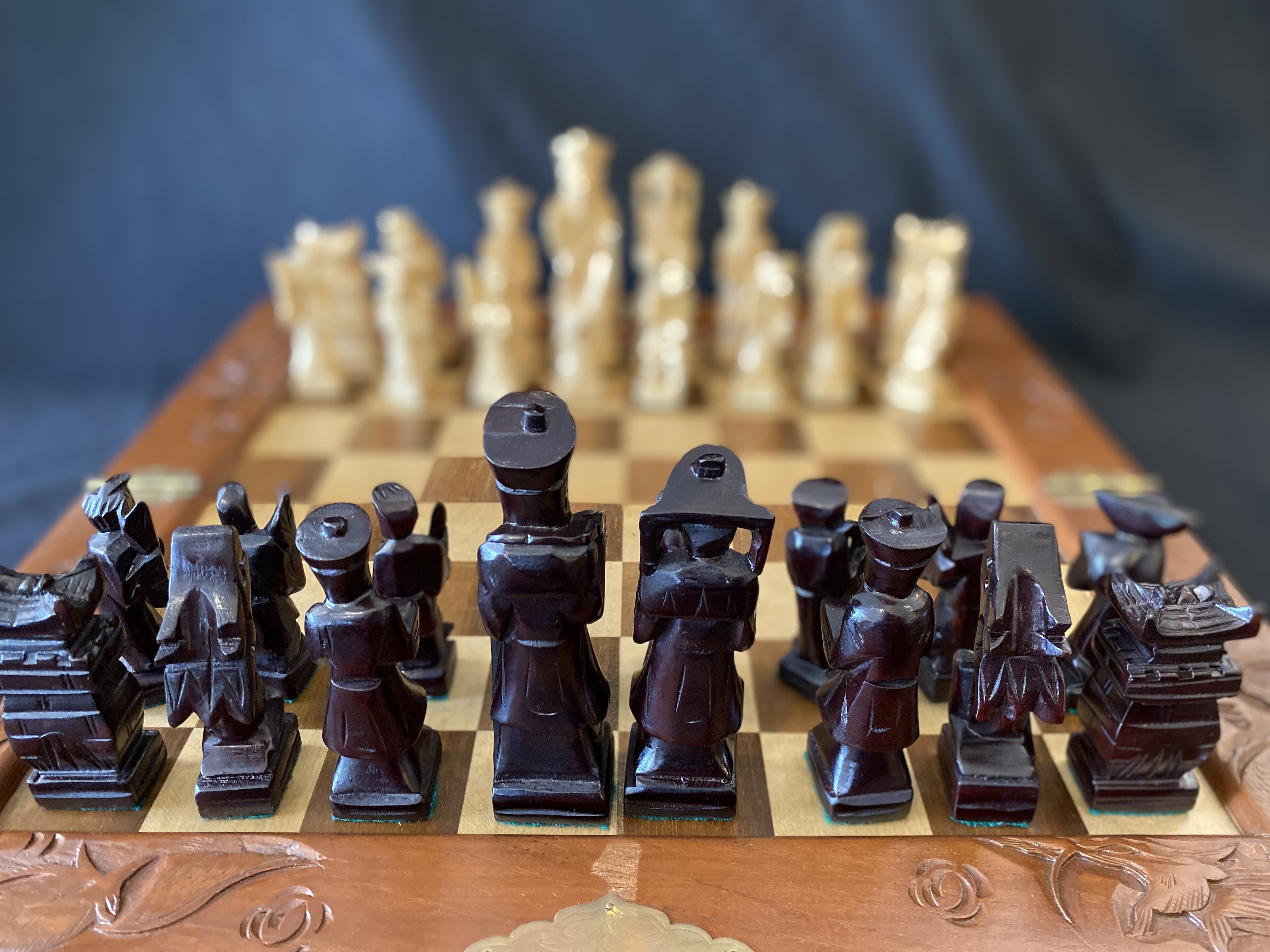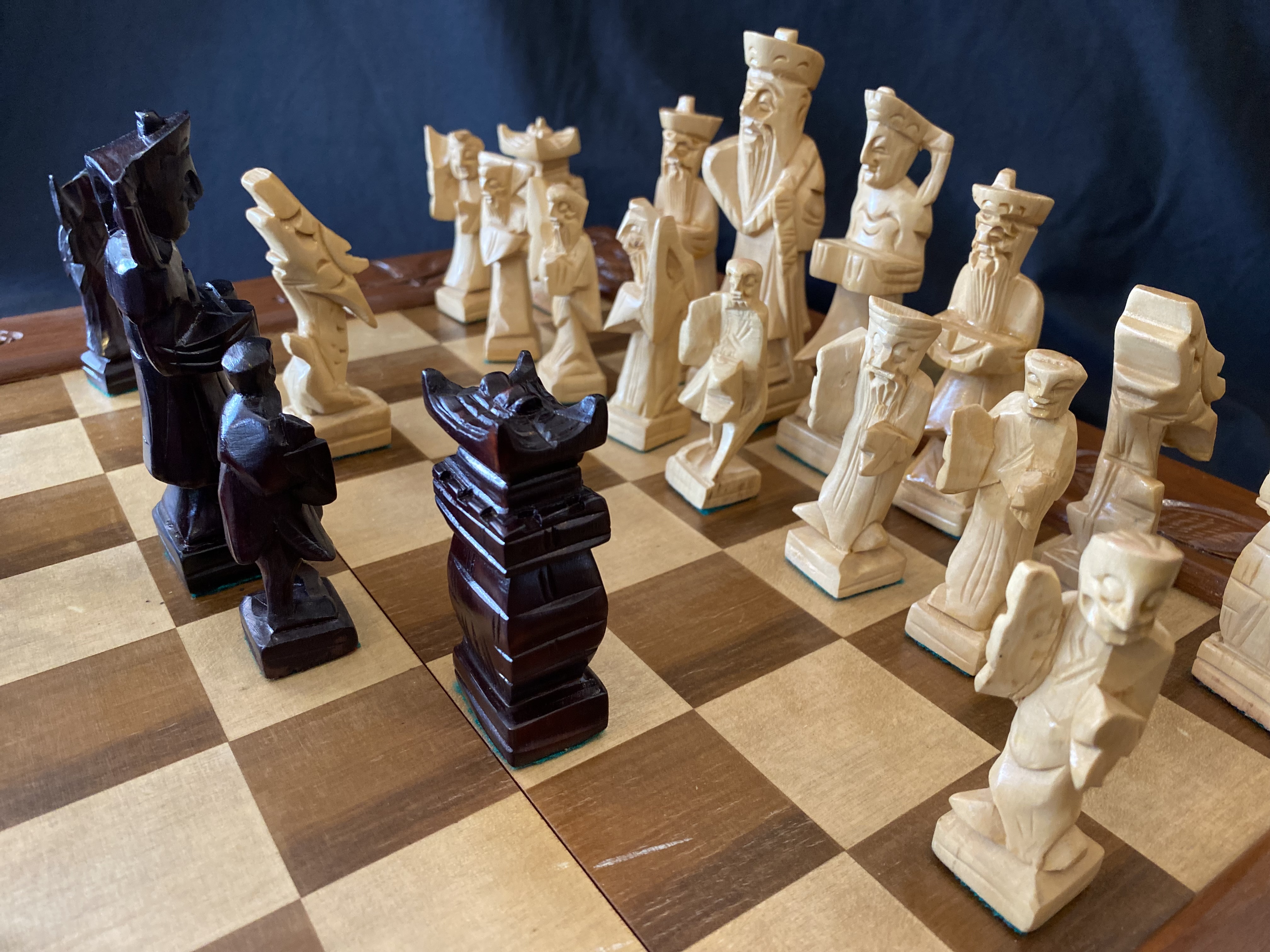 The board measures 470 mm square and folds in half. It has brass carry handles and two red baizes lined drawers to store the wooden pieces. The board has carved decorations to the border. The pieces are hand carved in softwood as oriental figures. Pawn height is 70 mm and Kings 120 mm.