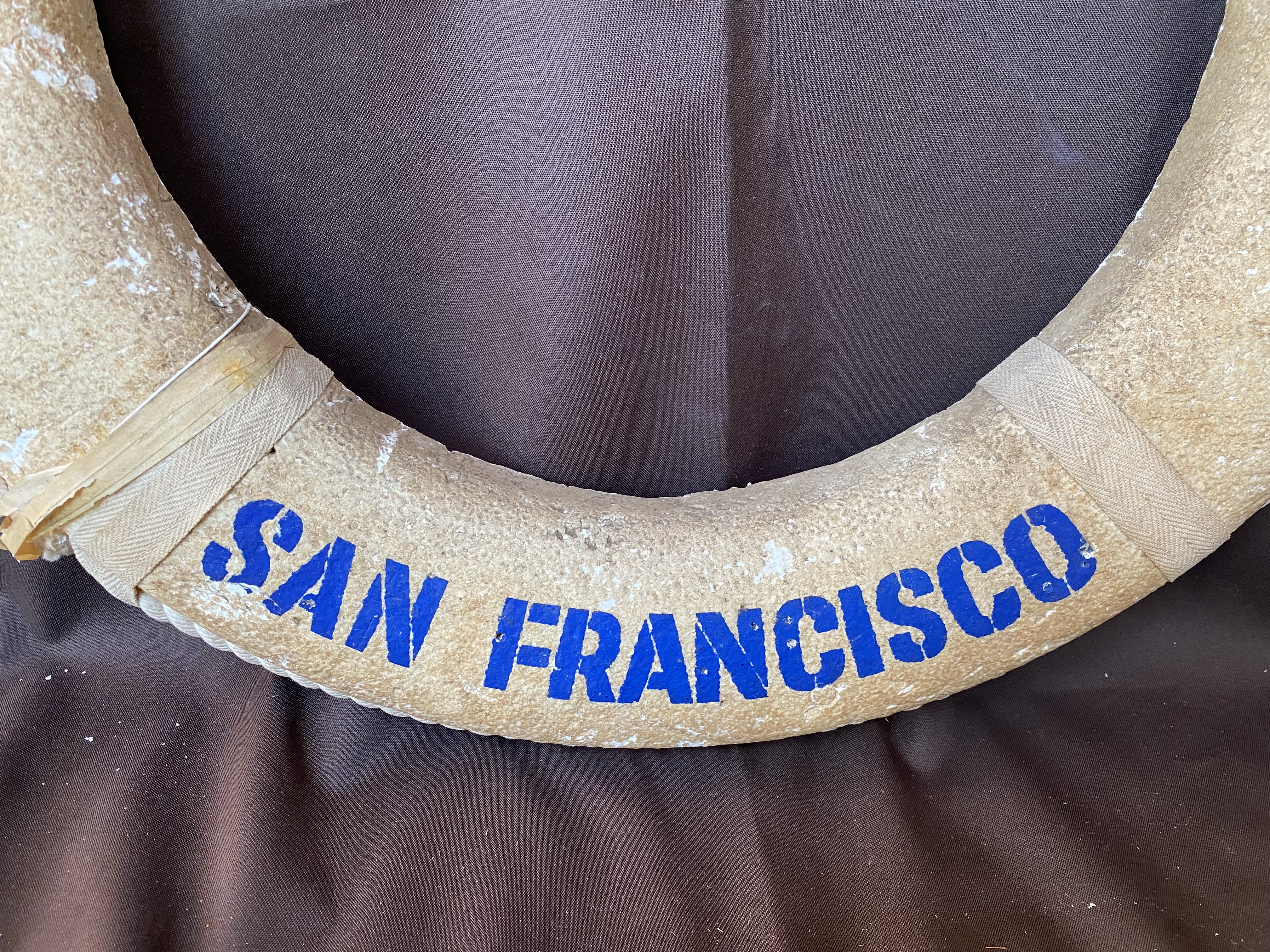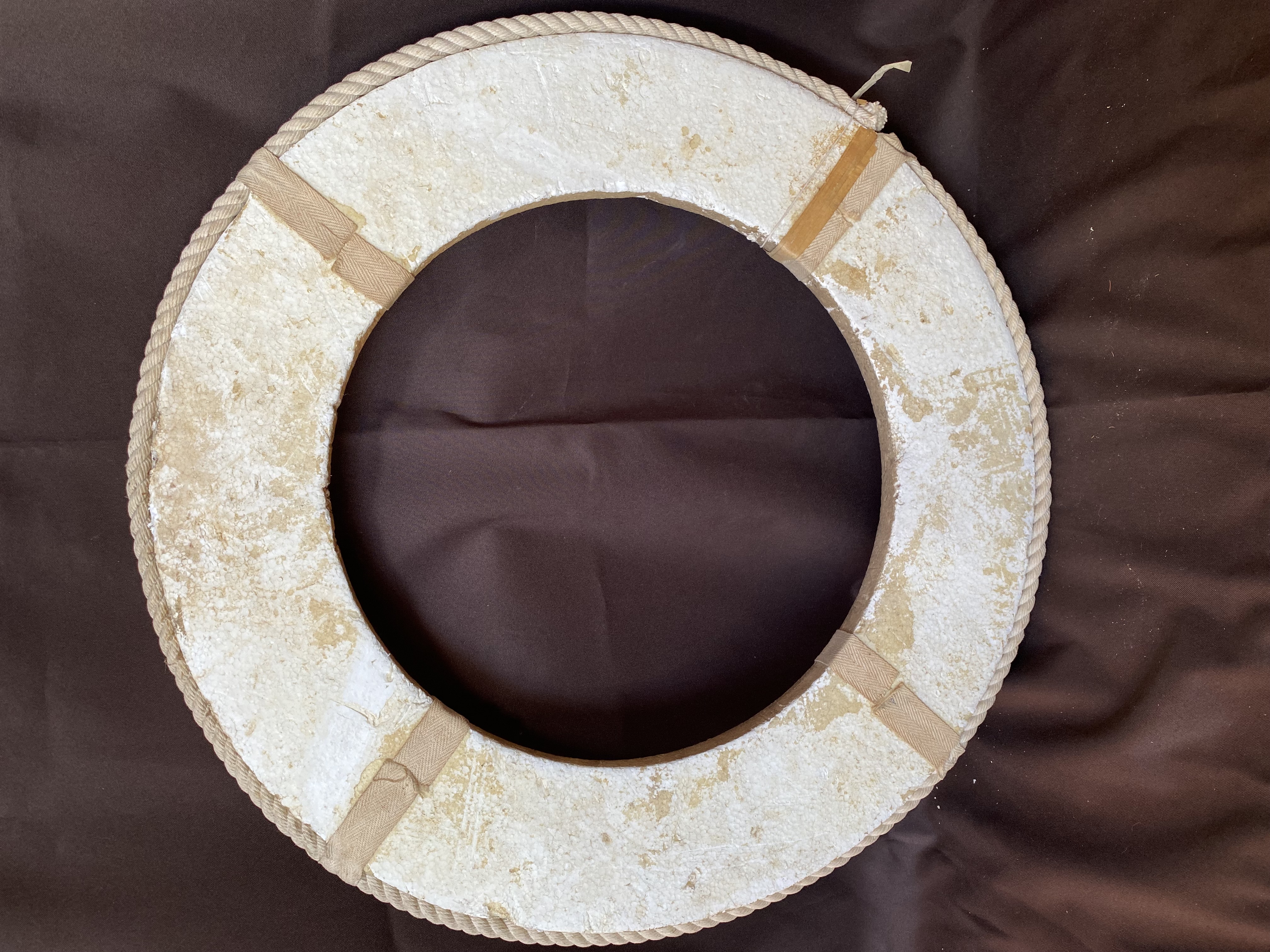 This is a great decorative object for the maritime enthusiast. Made of polystyrene, it is only the front half of the lifebuoy, possible seperated from the back in order to hang flat against a wall.
