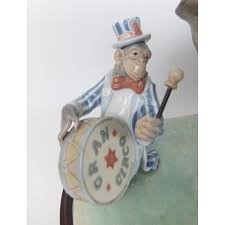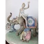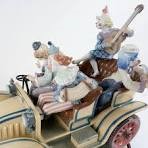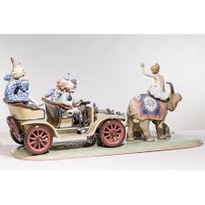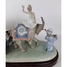 Limited Edition Lladro porcelain figurine group titled "Circus Parade", #1609. Figural depicts a ballerina riding an elephant with two monkeys playing musical instruments, leading a car filled with circus clowns on a naturalistic base, rests on a wooden base, #123/1000. Sculpture designed by Regino Torrijos, decorated by Vincente Navarro, introduced in 1989 and retired in 1998. Signed and numbered in black to the underside of the wooded base. Overall excellent condition.