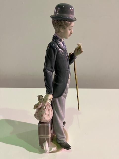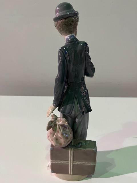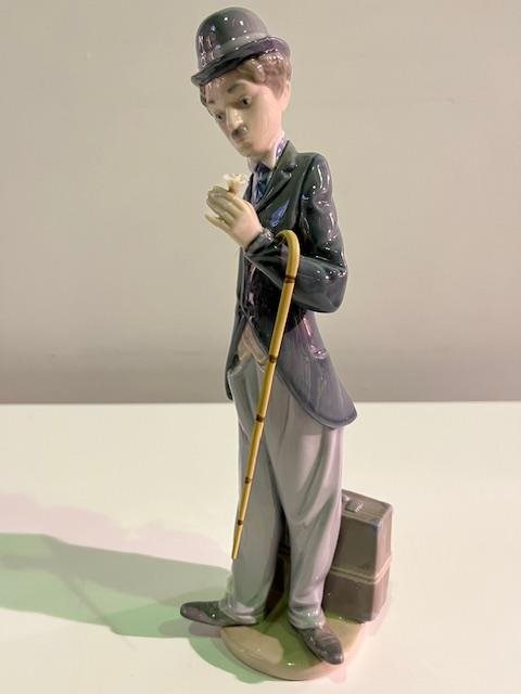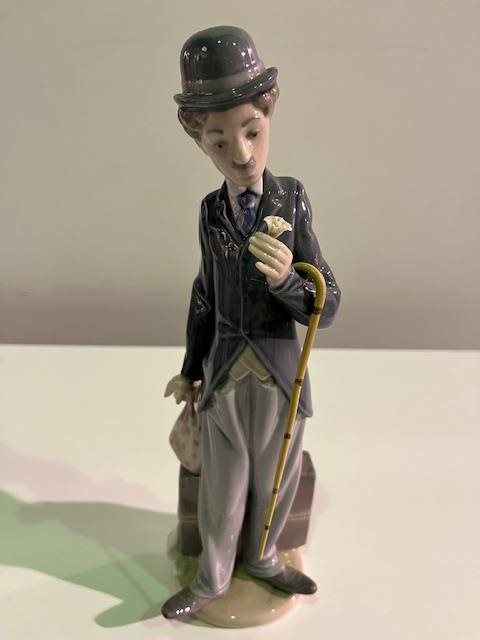 Lladro "Charlie (Chaplin) The Tramp" Figurine. Figurine was first produced in 1984 and retired in 1990. The World's Most Famous Clown: Charlie, in his baggy pants and derby hat holding a flower in his hand. Complete with Cane, (which is often missing after all these years)