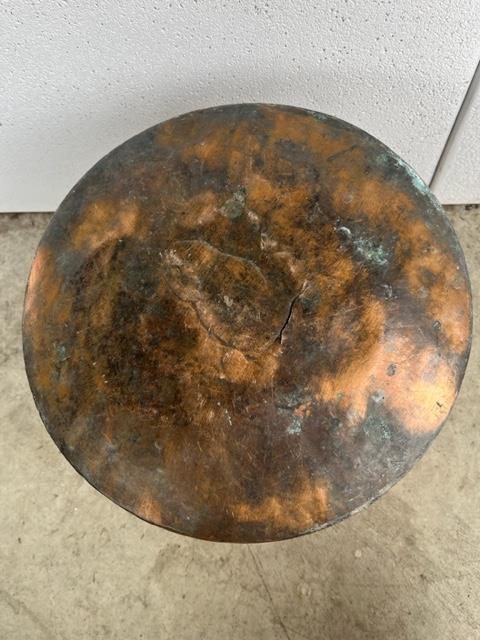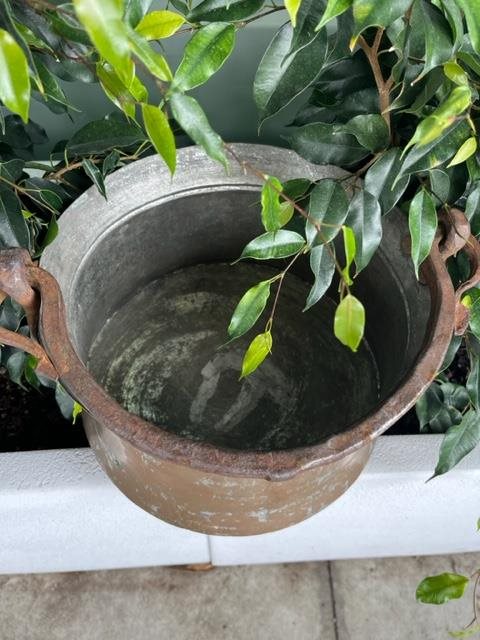 Old copper pot with solid cast iron handle.