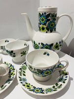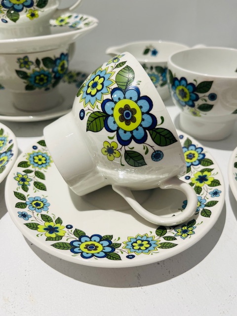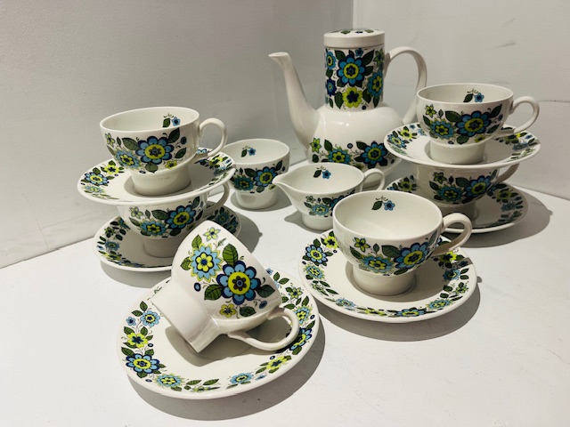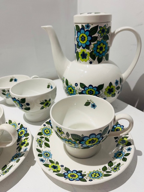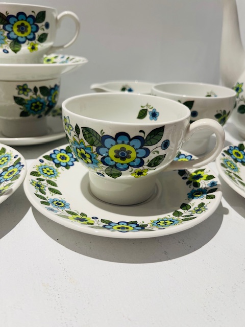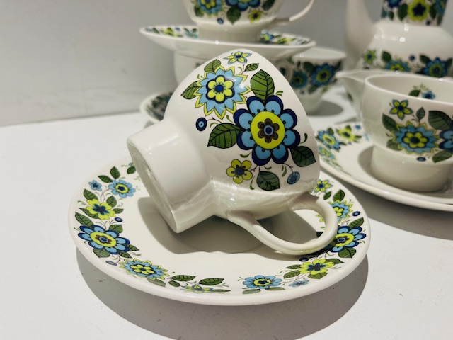 Set includes a teapot (approx. 20 cm high), sugar bowl, creamer, plus 6 cups and saucers. A standout vintage set for everyday use, display, or gifting, with that unmistakable 60s/70s British design charm.