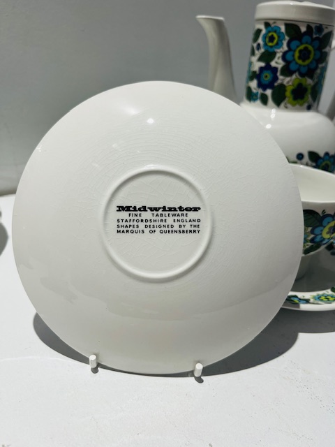 A cheerful mid-century Midwinter tea set in the iconic Country Garden pattern, made in Staffordshire, England. Produced on Midwinter’s celebrated Fine shape — marked “Shapes designed by the Marquis of Queensberry” — with stylised blue and green flowers on a crisp white ground.