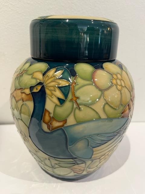 A Moorcroft Blackwell Ginger Jar with Peacock. Designed by Nicola Slaney (2008) Height 155mm. Original Retail price $1385.