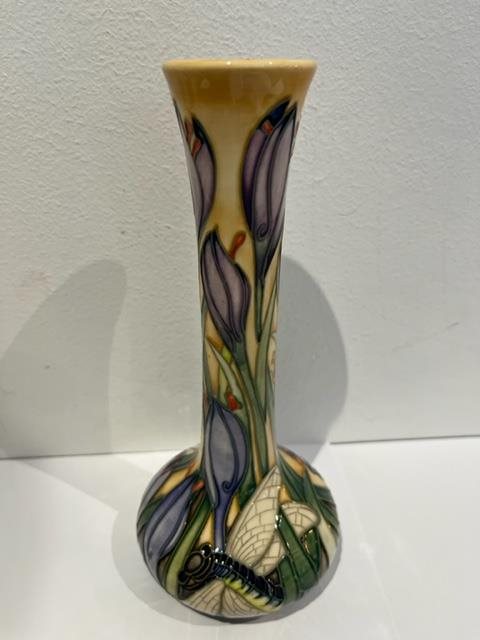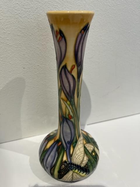 This vase is a beautiful display of colour in yellows, purples and greens, with flowers, foliage and a dragonfly.