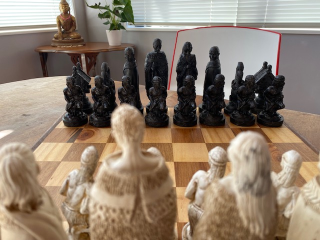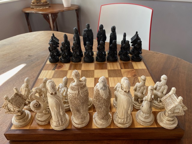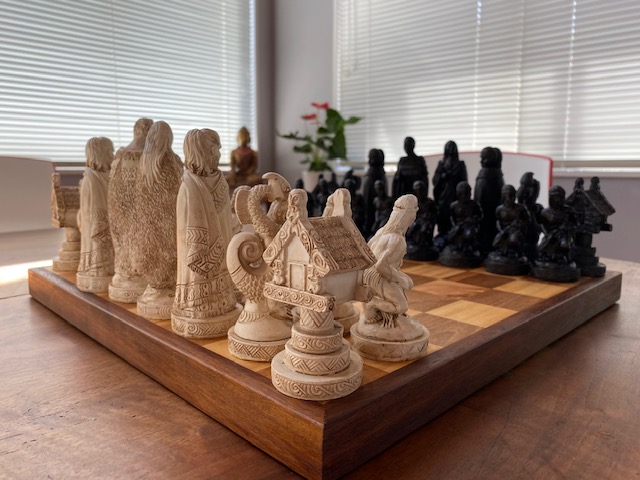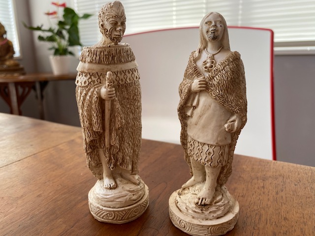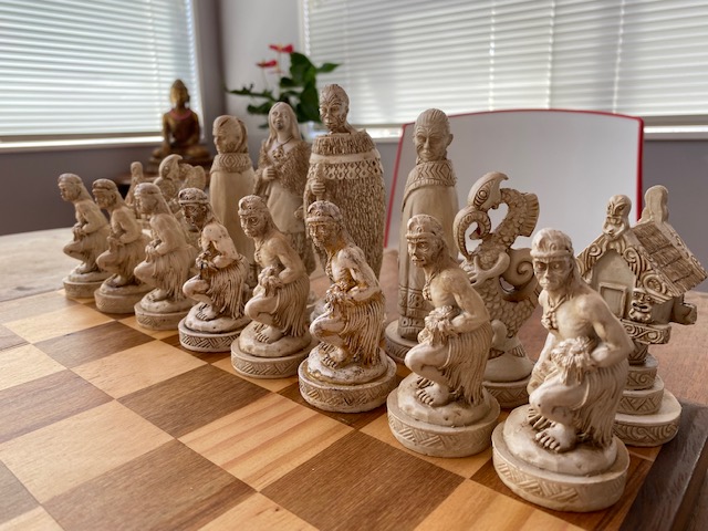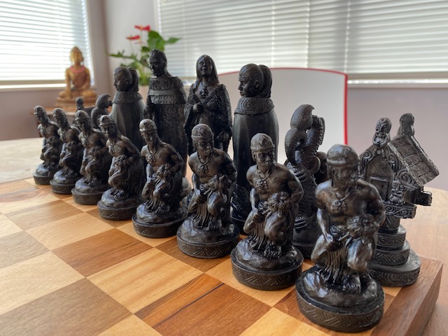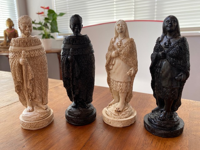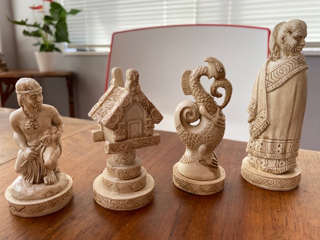 The Pawns are Maori Warriors, the Rook is a Whare, the Knight a mythical Maori creature called a Taniwha, and the Bishop is a cloaked Maori figure.