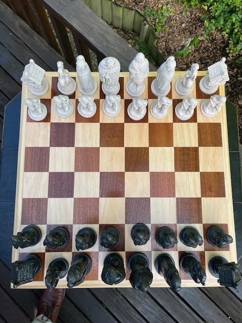 Large hand crafted wooden chess board, made of Rimu and Kauri. Chess pieces are made of solid resin and are very well modelled.