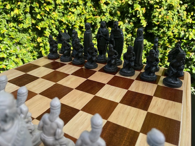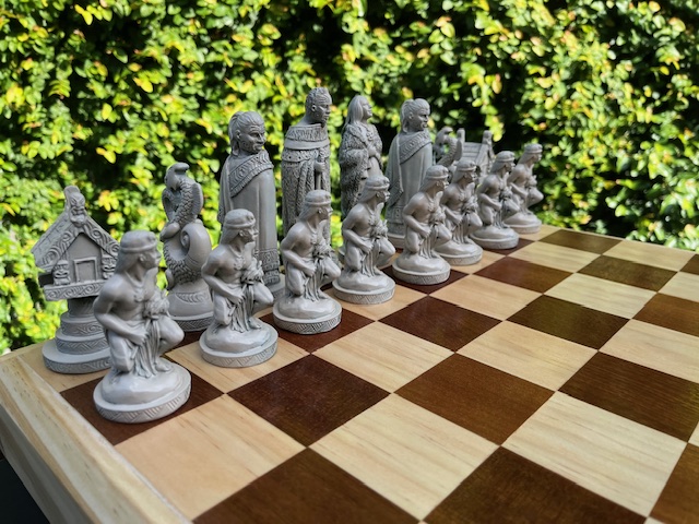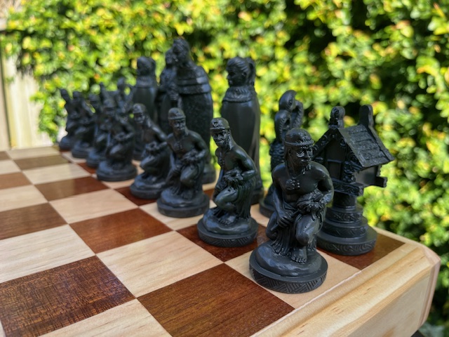 The Pawns are Maori Warriors, the Rook is a Whare, the Knight a mythical Maori creature called a Taniwha, and the Bishop is a cloaked Maori figure.