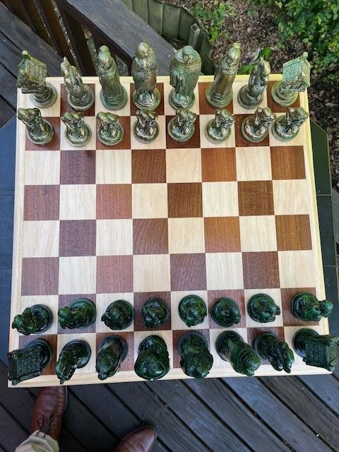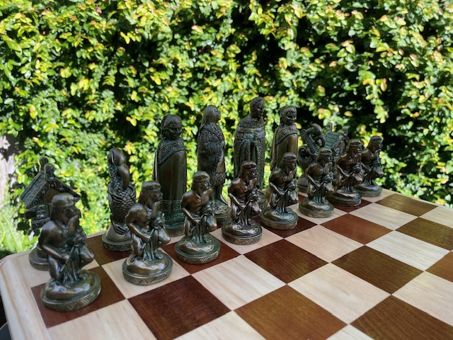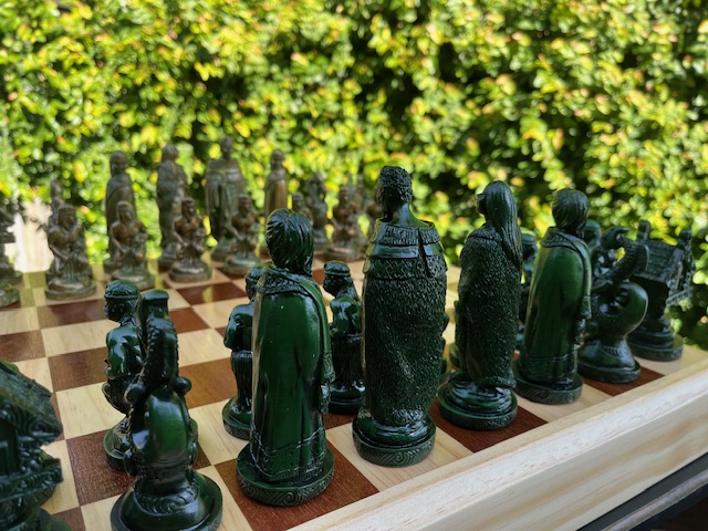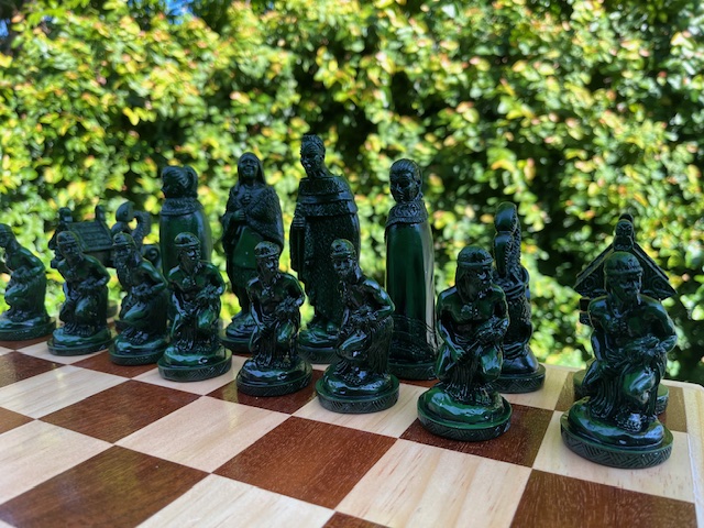 Large hand crafted wooden chess board, made of Rimu and Kauri. Chess pieces are made of solid resin and are very well modelled. This set has emerald green and green/gold pieces which is evocative of the traditional greenstone, or jade, which is known as Pounamu in Maori.