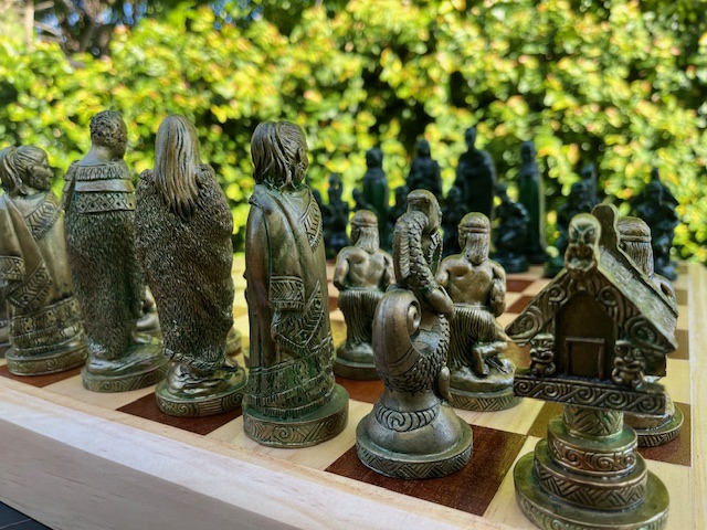 The Pawns are Maori Warriors, the Rook is a Whare, the Knight a mythical Maori creature called a Taniwha, and the Bishop is a cloaked Maori figure.