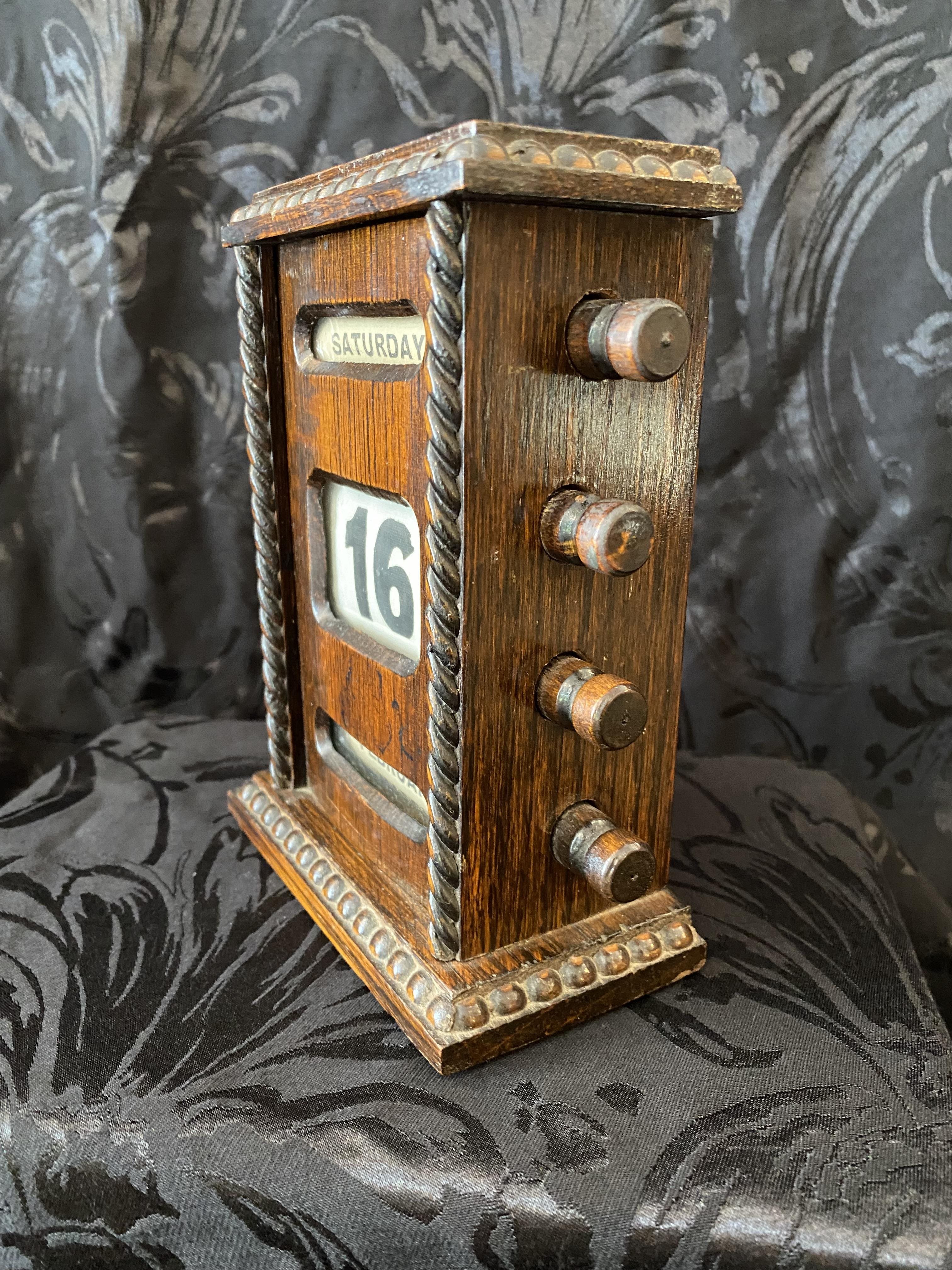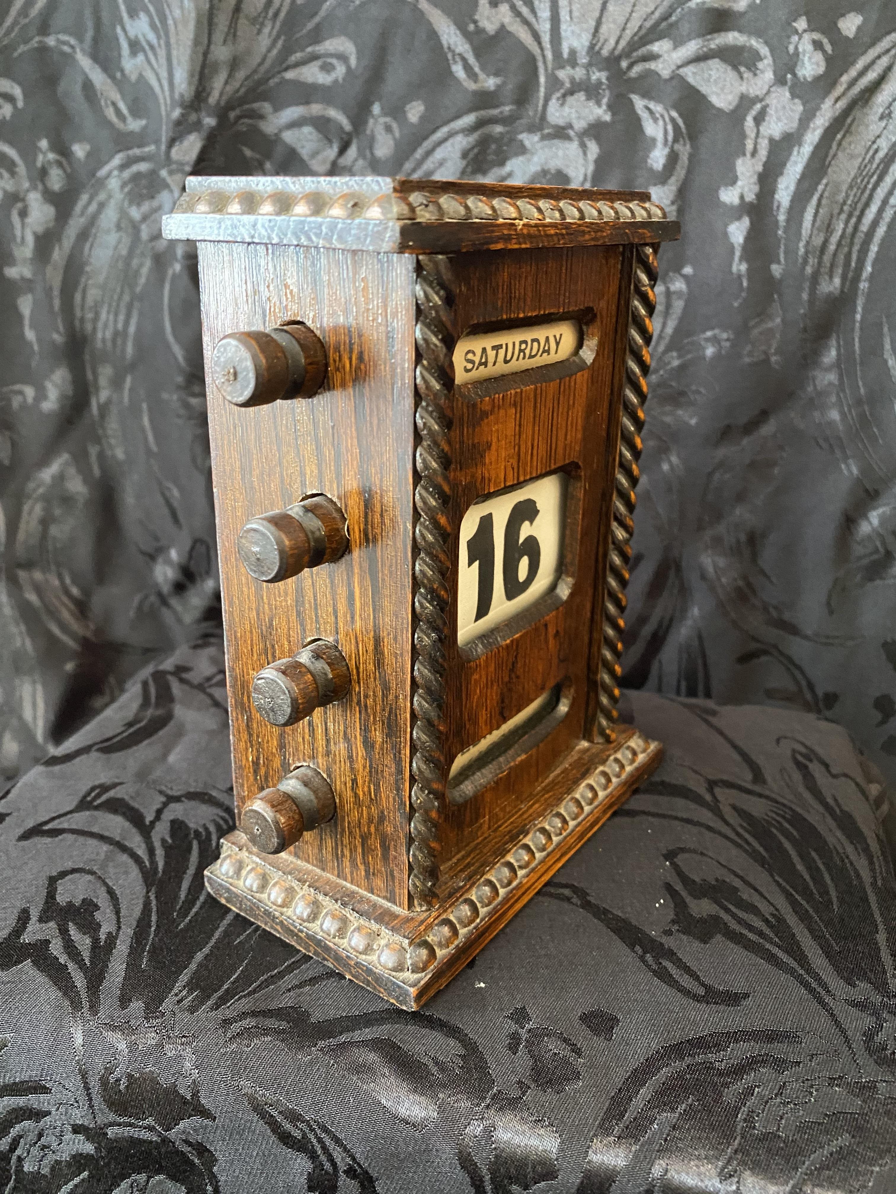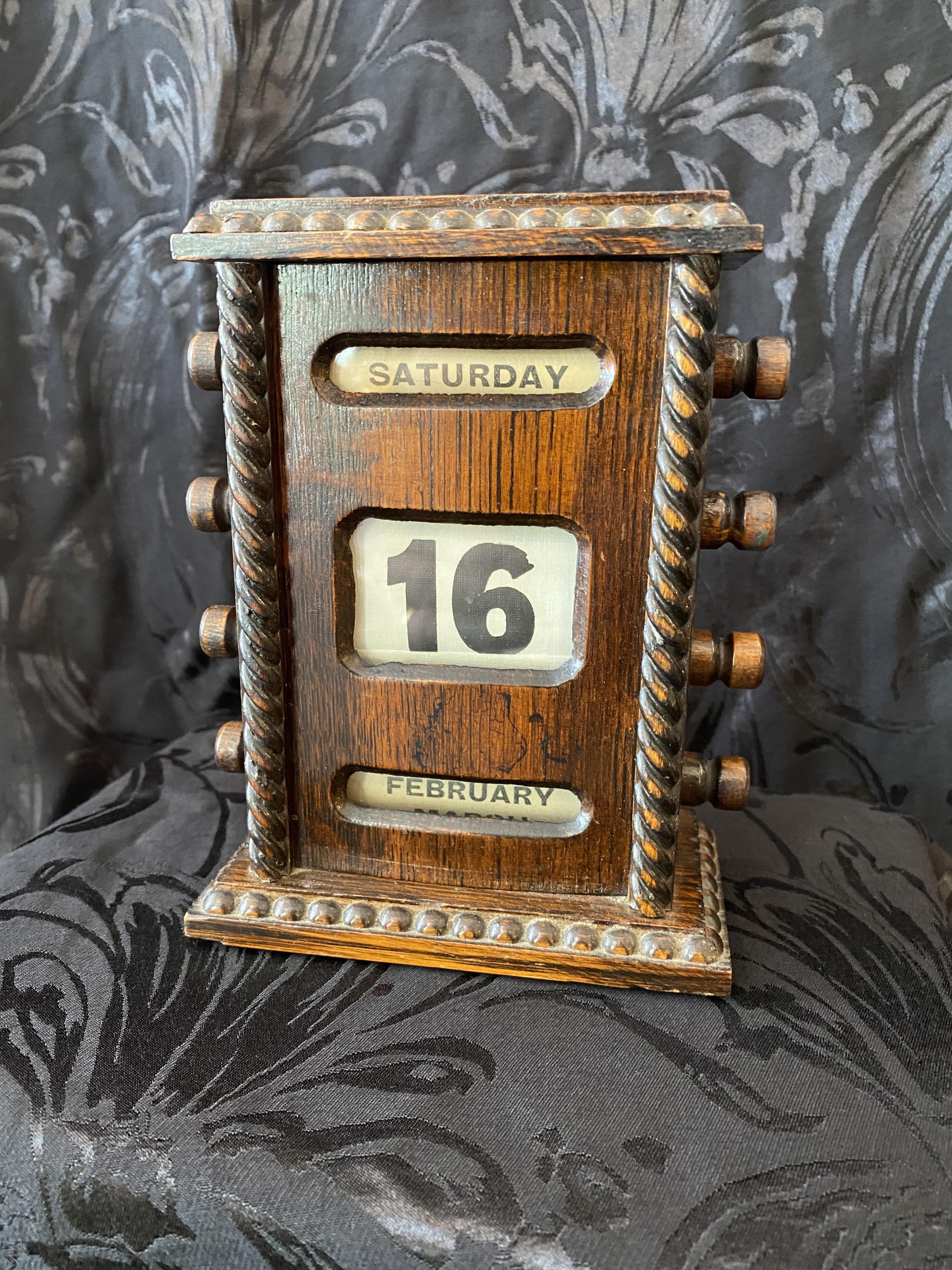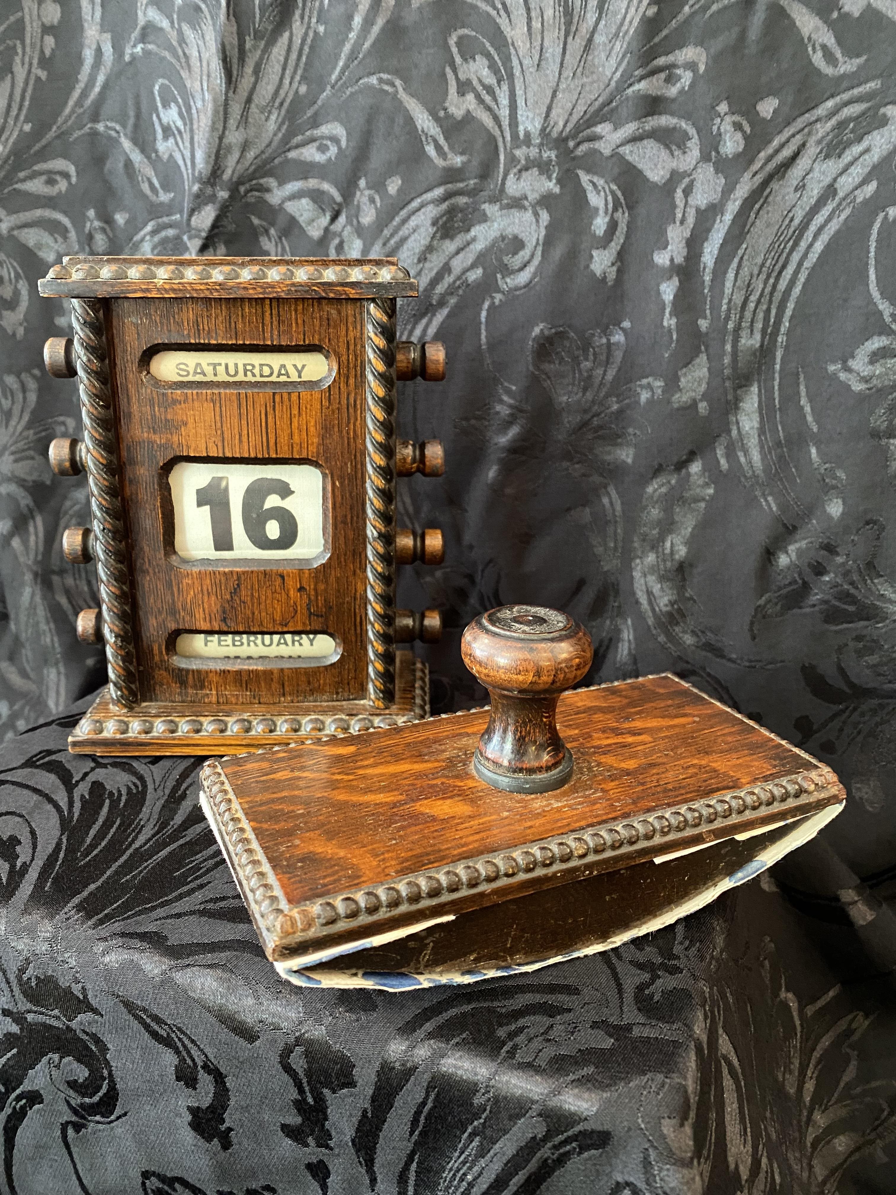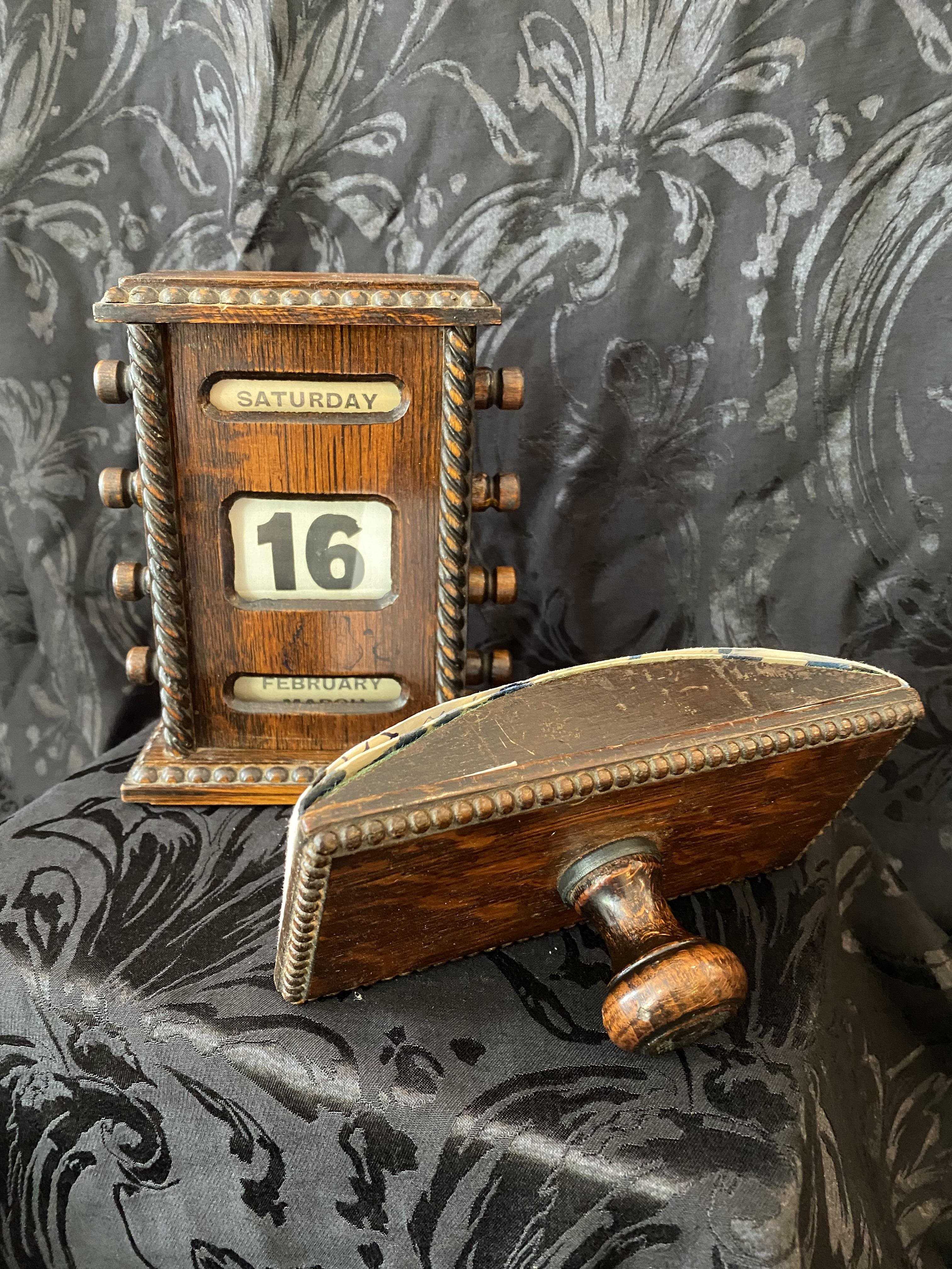 This perpetual desk calendar is in lovely condition and is paired with a matching rocking blotter. Made of oak, it dates from the early 20th century, (possibly Edwardian), and features decorative gadrooning to the body as well as turned handles.