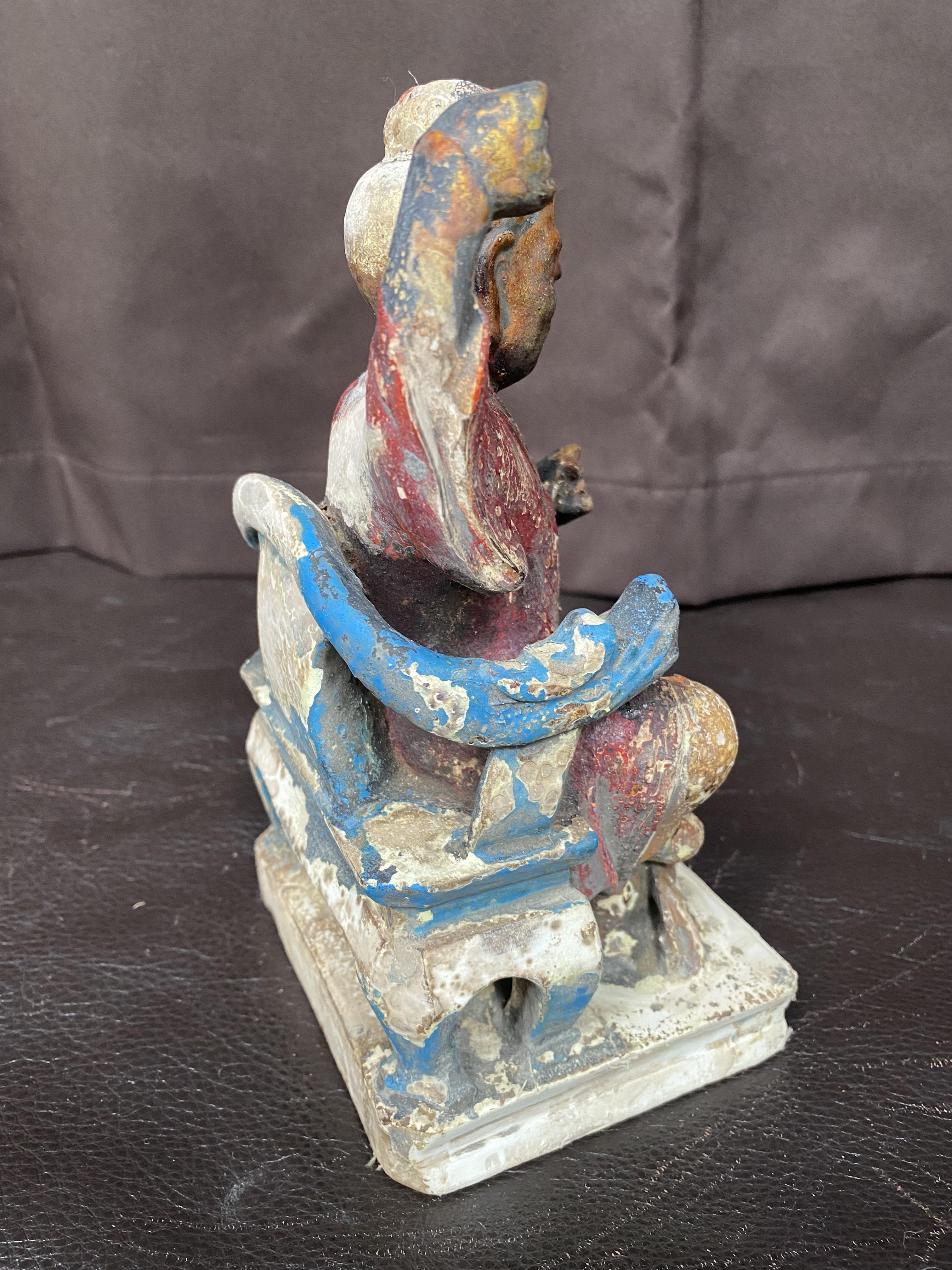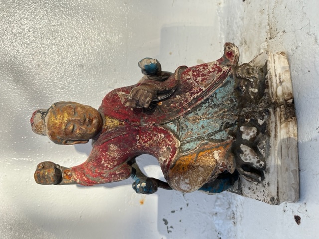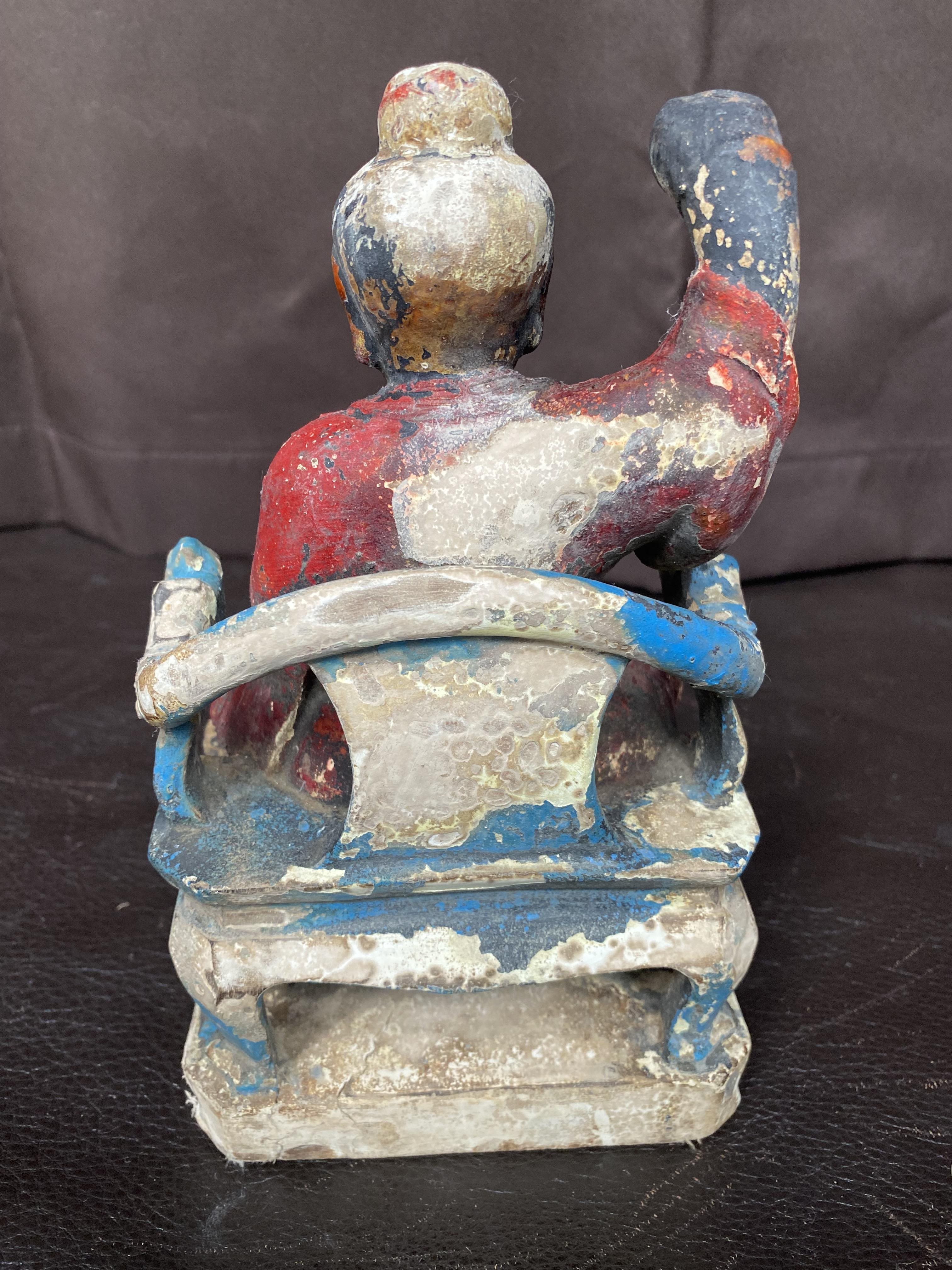 Holes in the closed hands shows that he originally held something, perhaps above his head. Ancient fabric is beneath the paint on the base, perhaps to reinforce it. There is a verticle crack running from the base to half way up however the stautue is structurally strong.