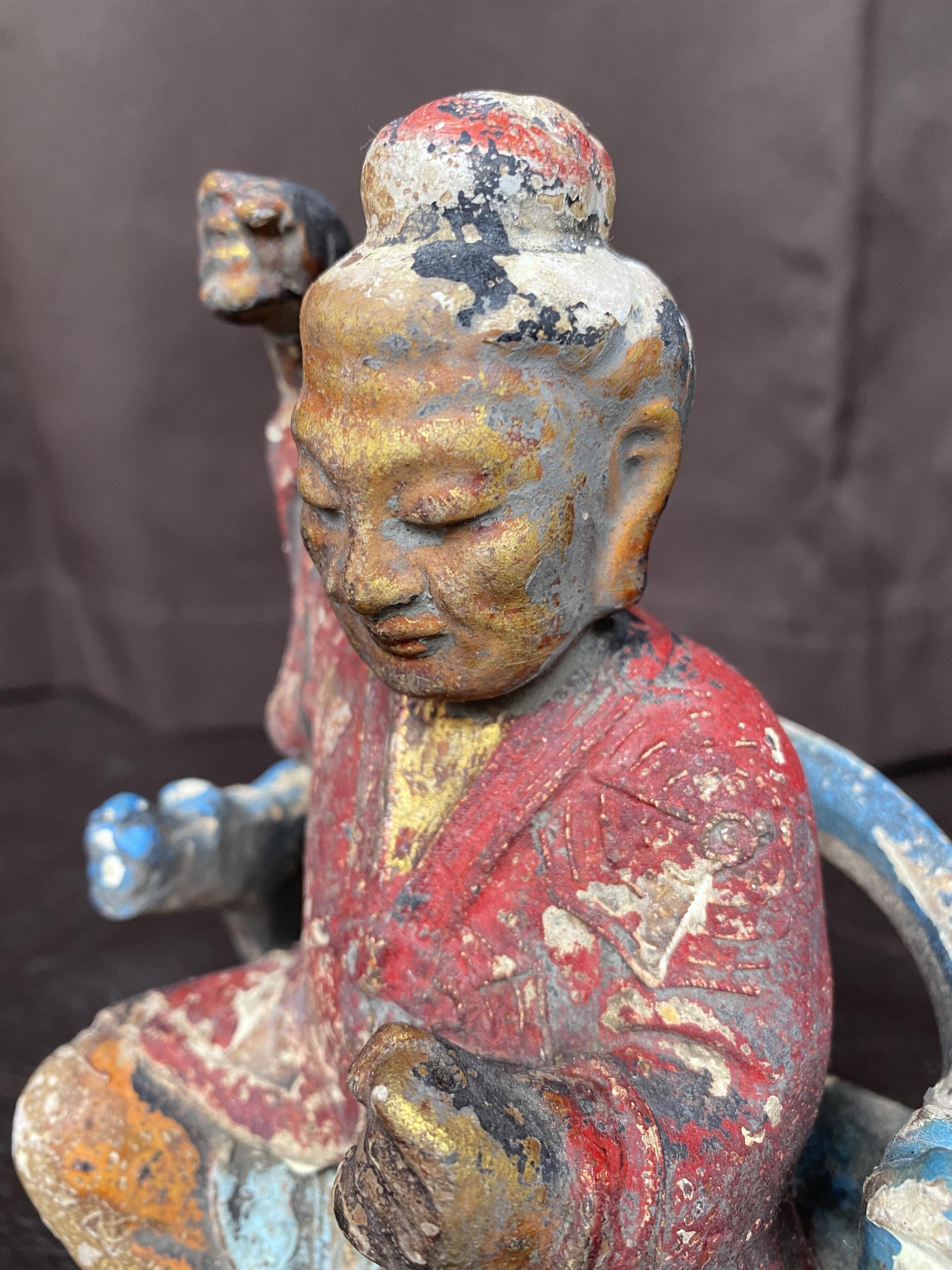 Carved and painted statue of a seated man on a blue throne. Beneath his feet is a recumbent animal, (cow?). His face and hands are painted gold and his garments are red and tourquise. Remnants of black, white and orange paint are also apparent. Carved decorative patterns in his robe.