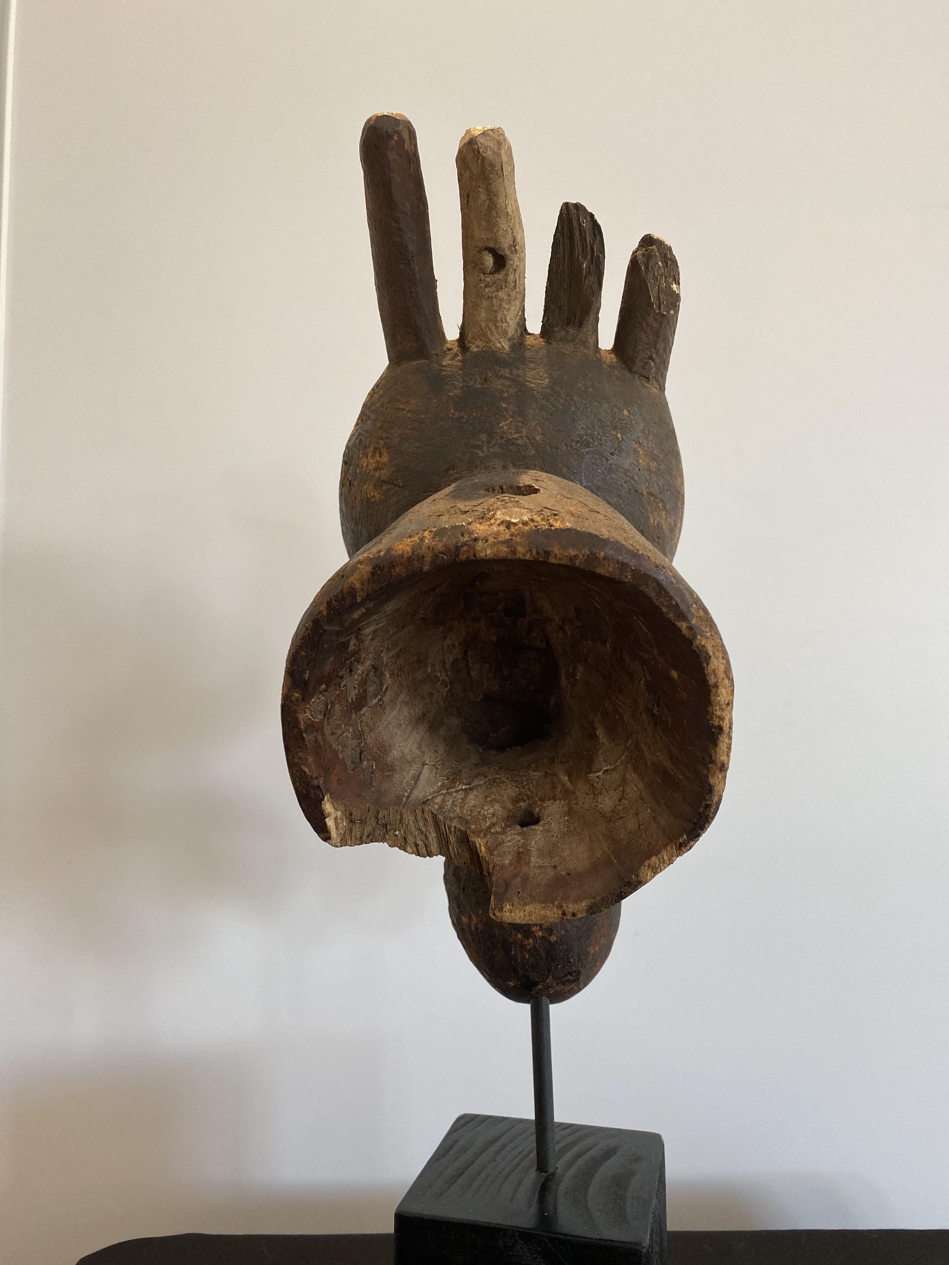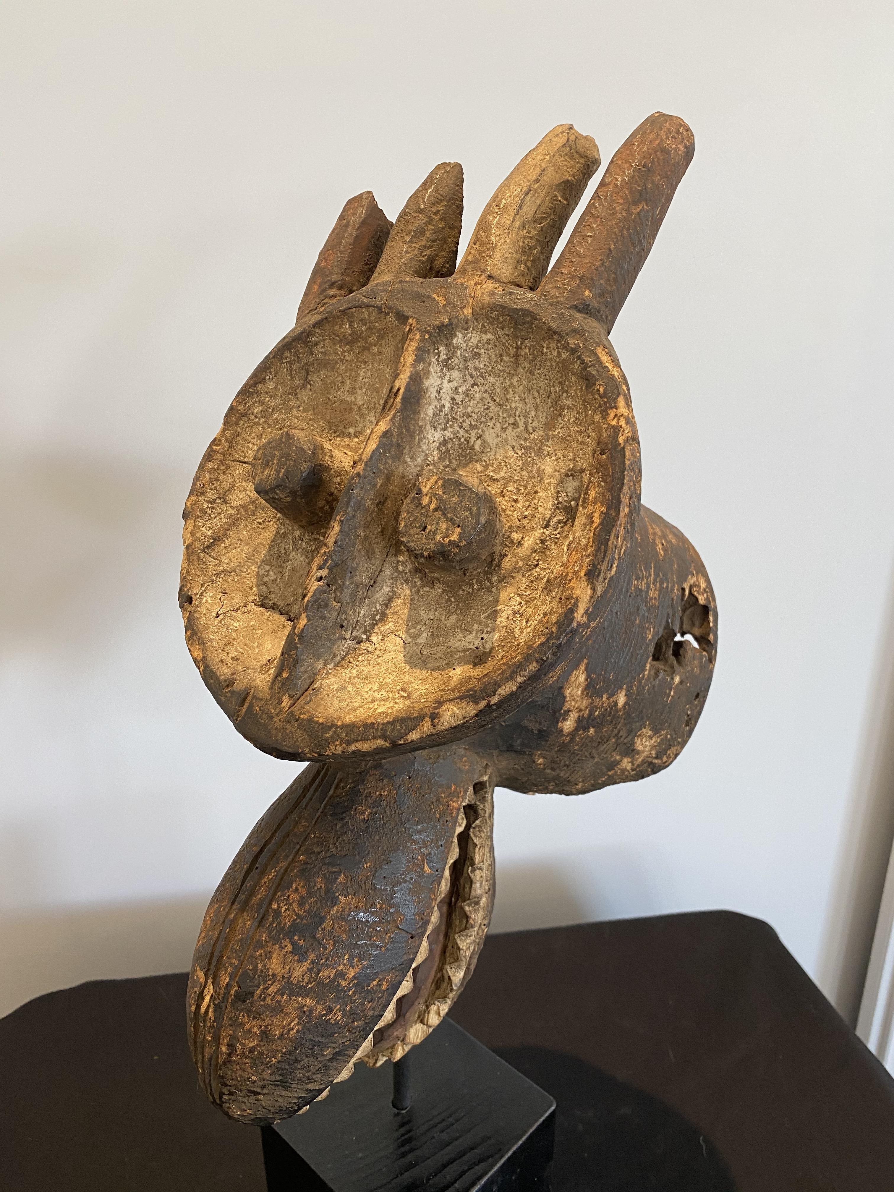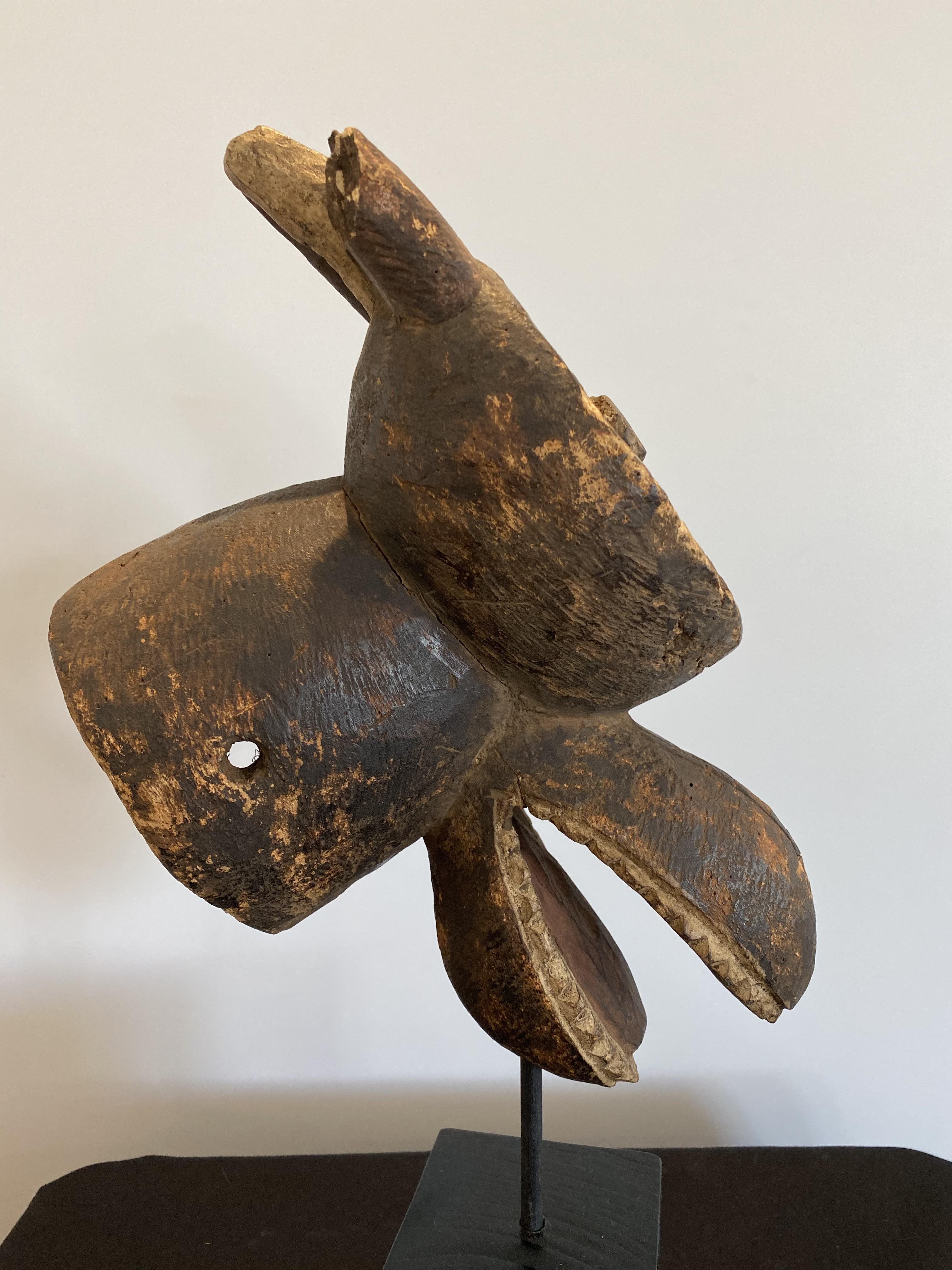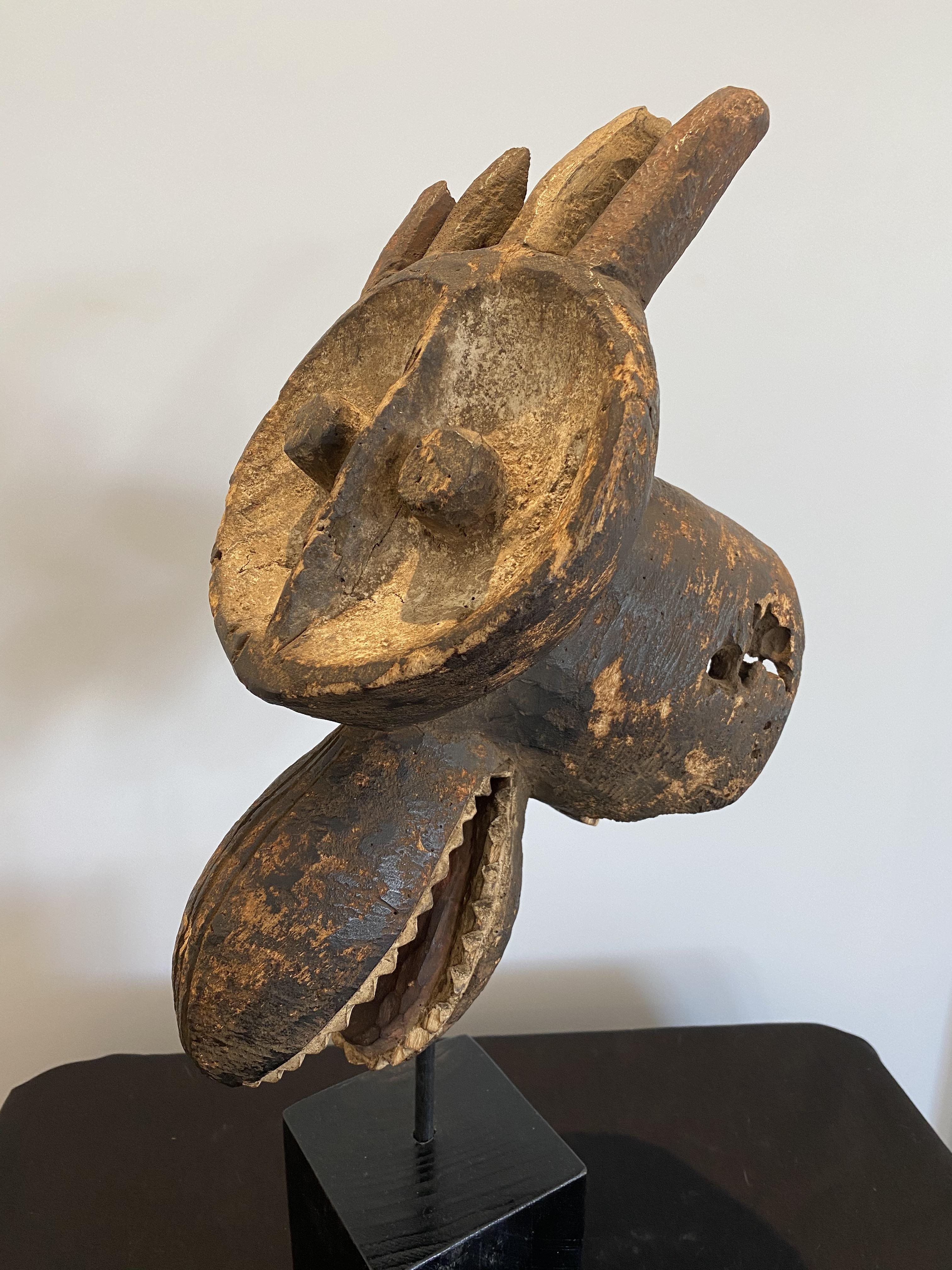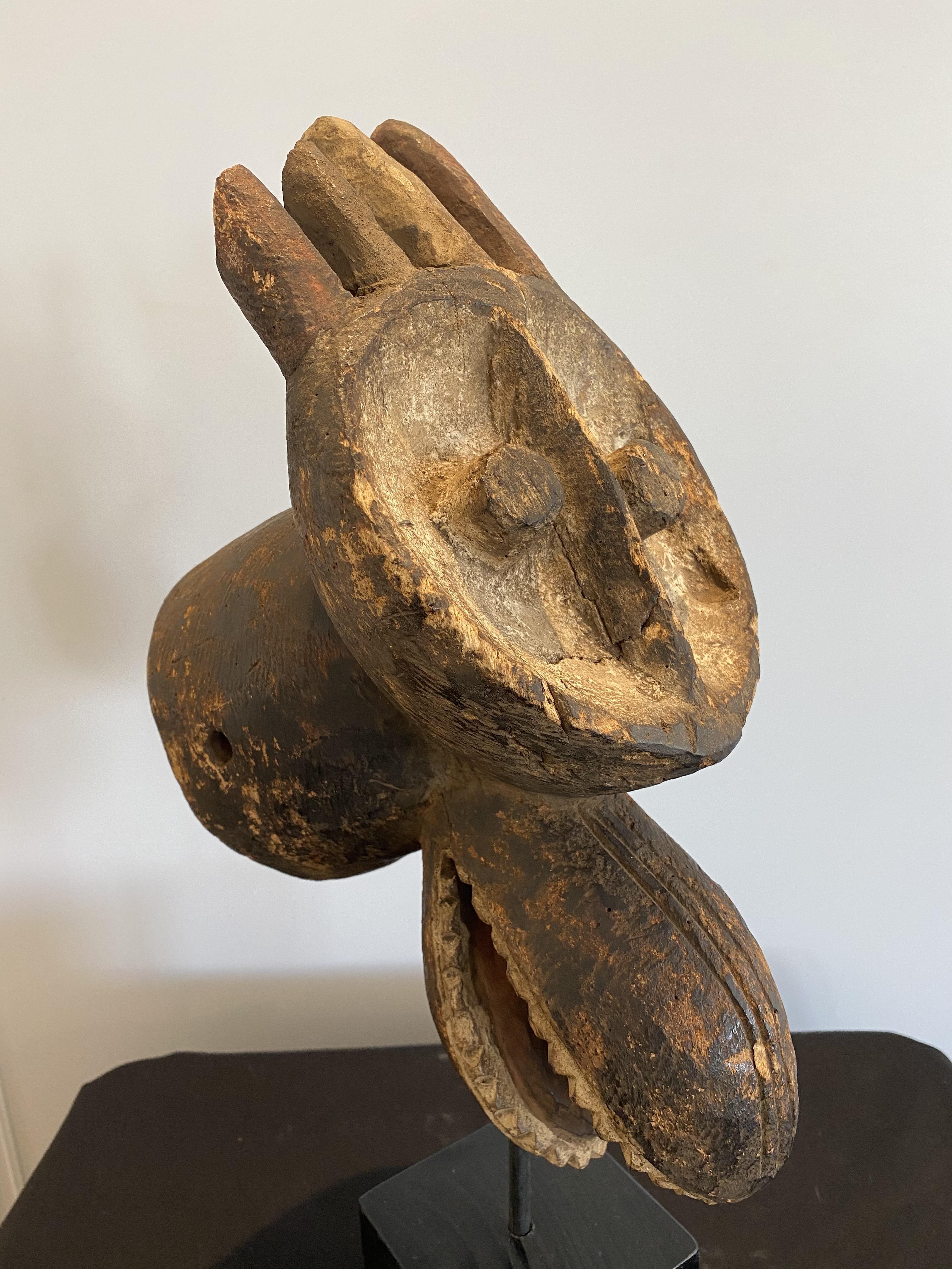 The Mambila Tribe of Northern Nigeria/Cameroon made these zoomorphic masks to be worn in dances with the dancer looking out between the open jaws.