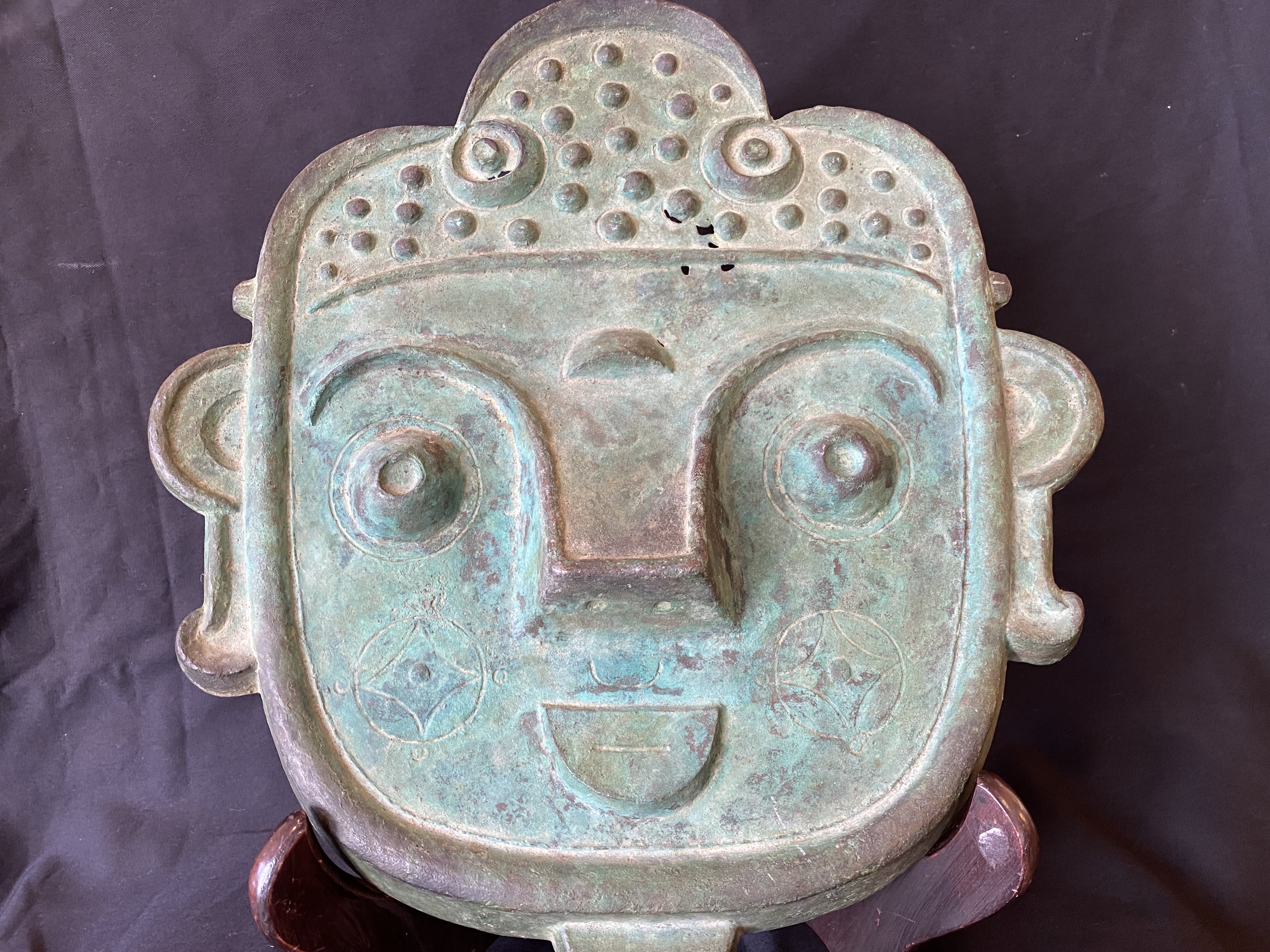 Intriguing stylized bronze face wall panel with some age and a magnificent patina of verdigris.