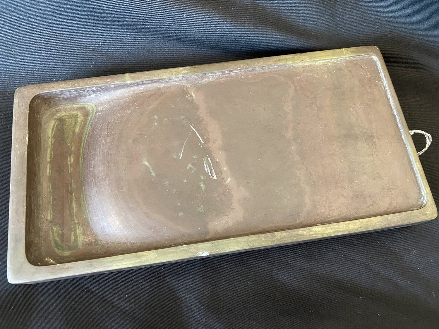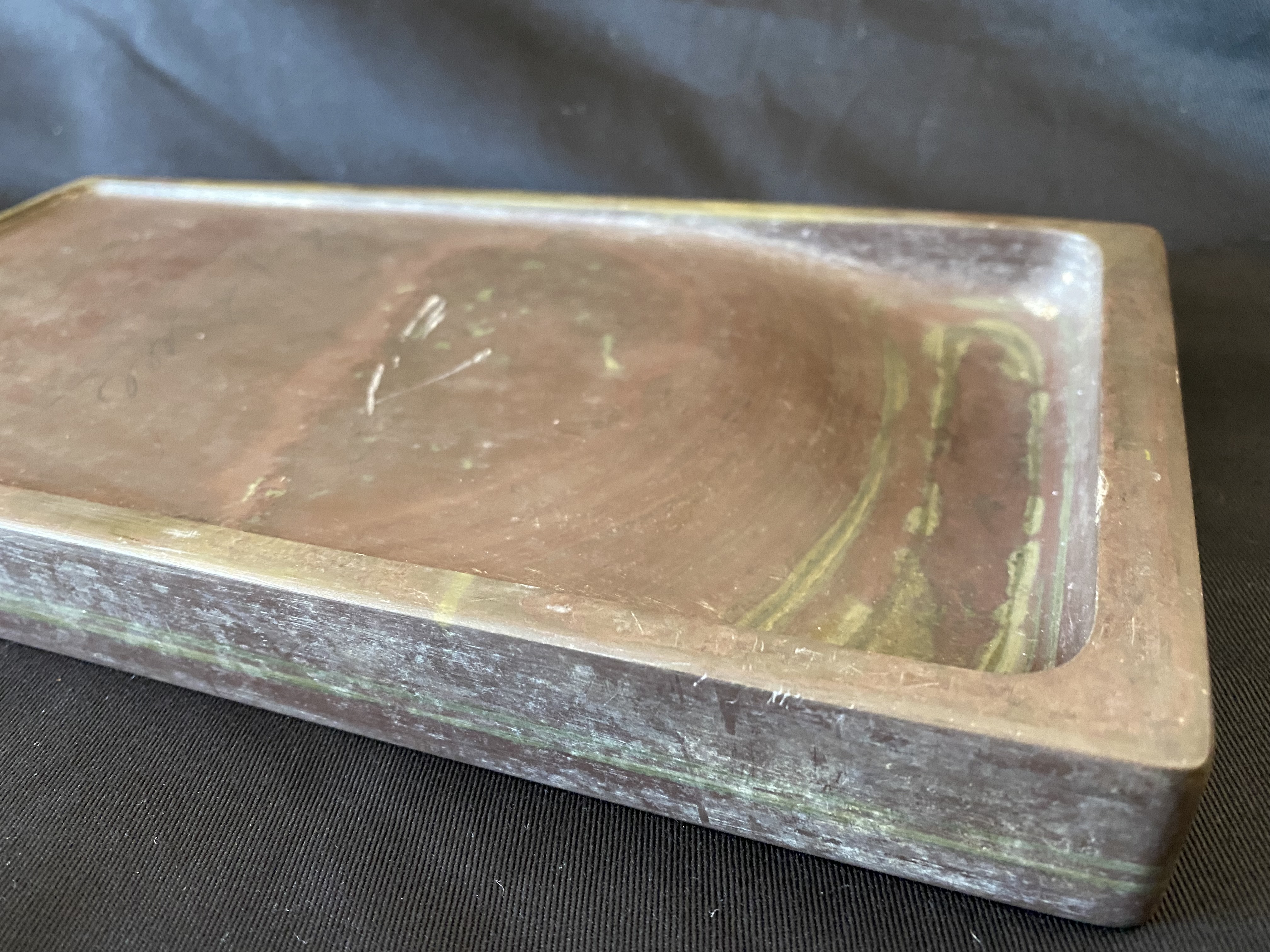 The device evolved from a rubbing tool used for rubbing dyes dating around 6000 to 7000 years ago.The earliest excavated inkstone is dated from the 3rd century BC, and was discovered in a tomb located in modern Yunmeng, Hubei. Usage of the inkstone was popularized during the Han Dynasty.