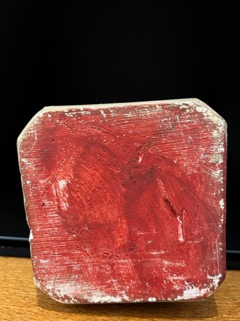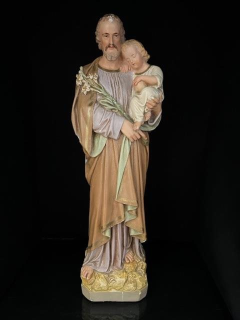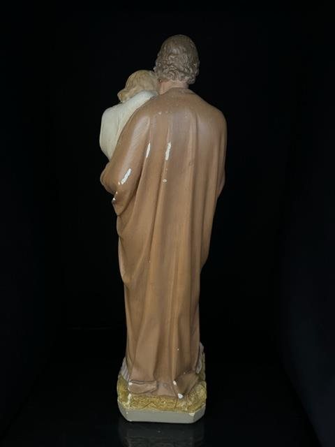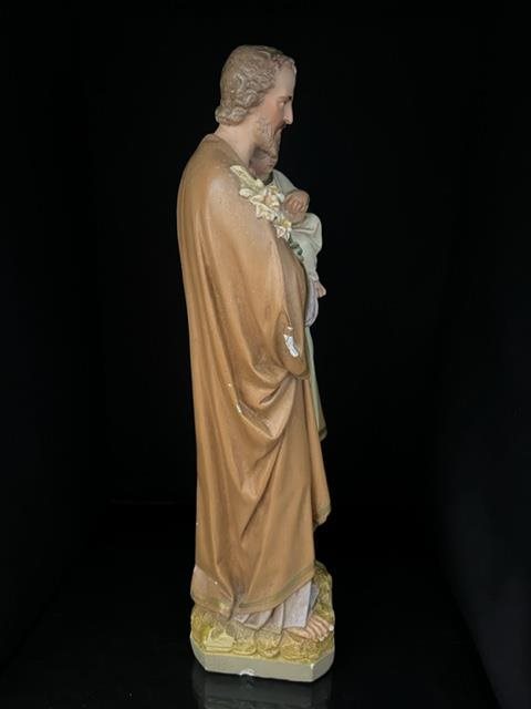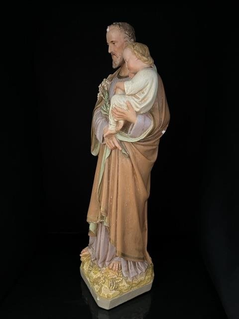 Old hand painted statue of Joseph carrying a young Jesus. Good colours with some chips and blemishes telling the story of its age.