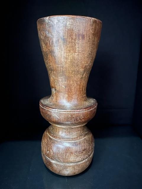 Lovely old turned wood candle holder with metal pricket to keep the candle in place.