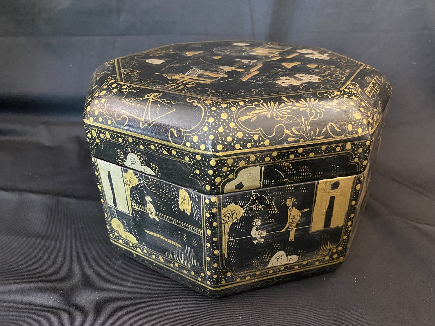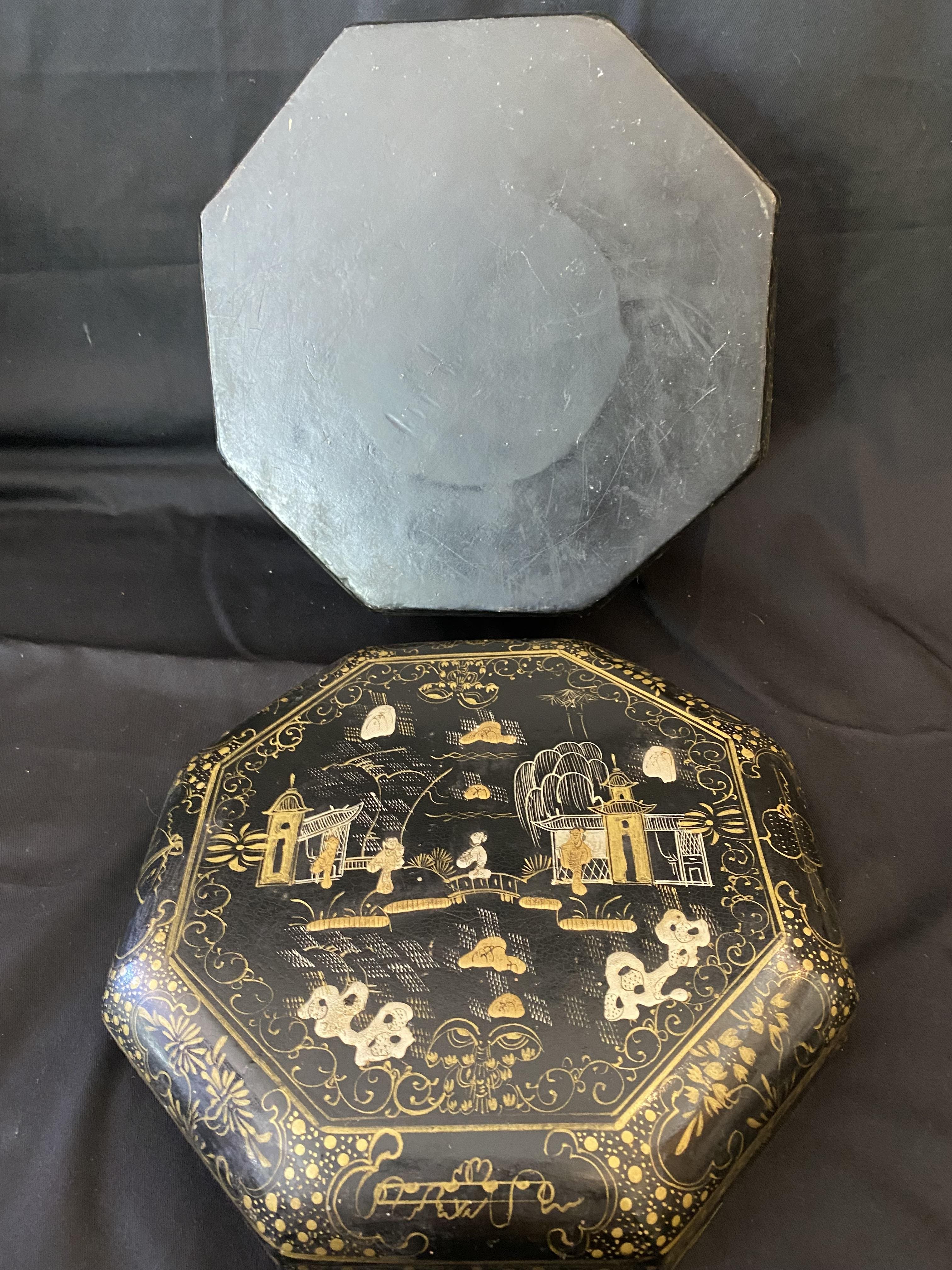 Lovely black and gold Chinese or Japanese octagonal box made of papier mache.