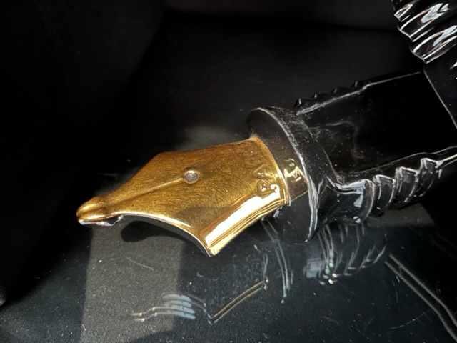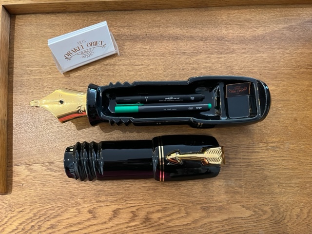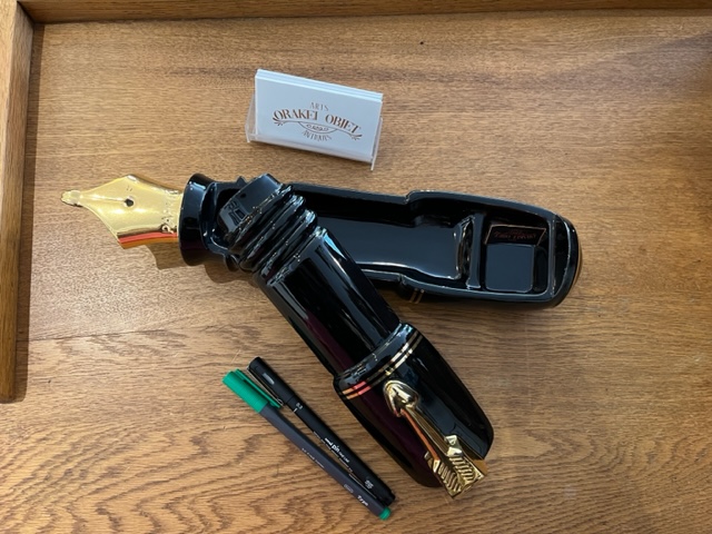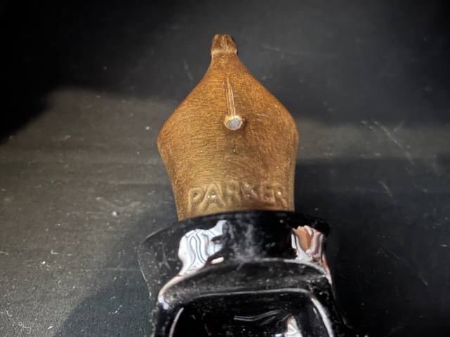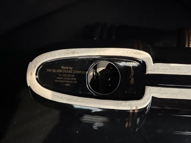 This decorative ceramic pen measures 370 mm in length. The top half comes away to reveal a void that can be used as a desk tidy for pens and other stationery. Black body with gold nib. Made in early 1980's. This unusual piece was designed by the award winning Silver Crane Co for Parker Pens in England.