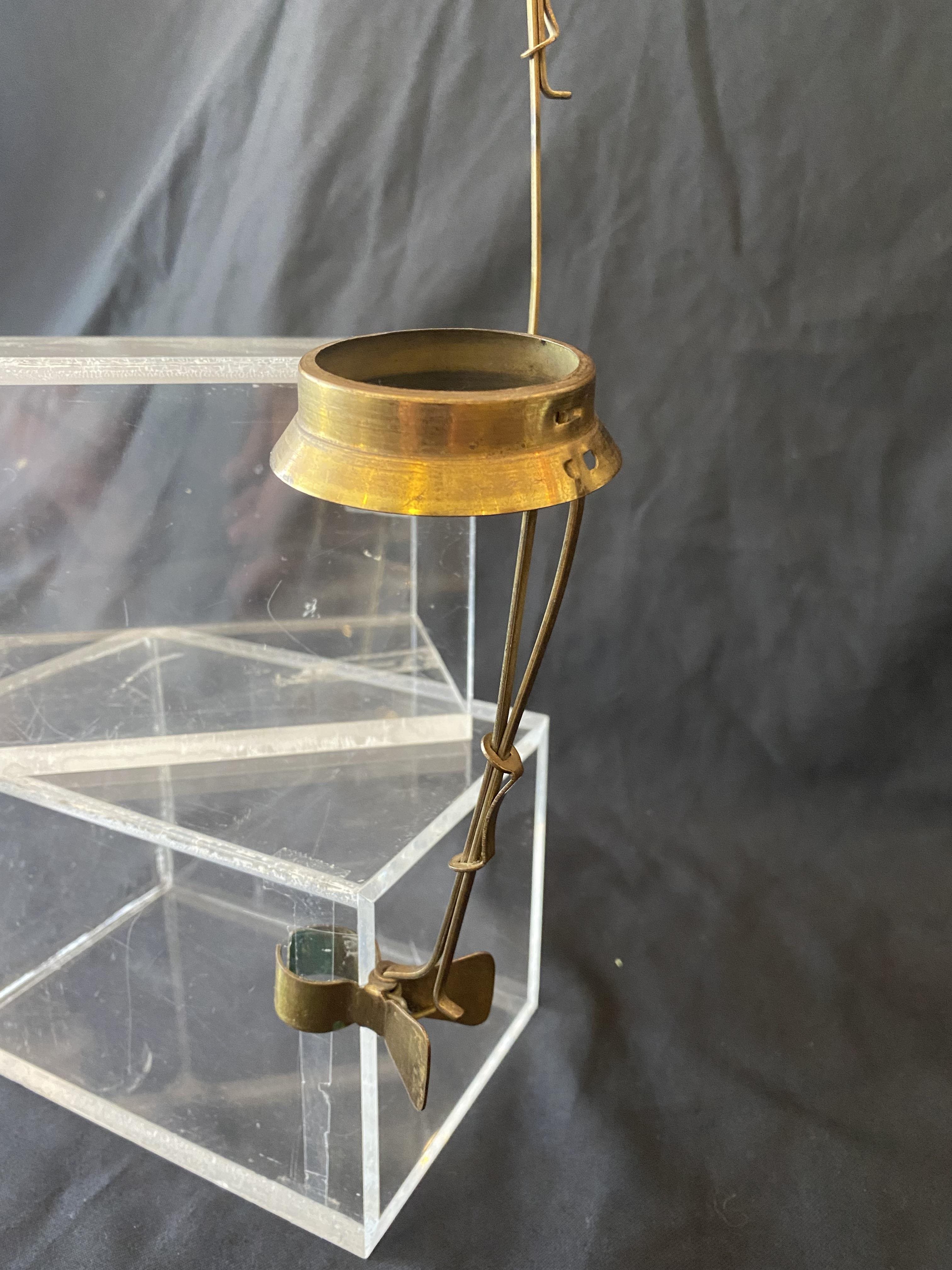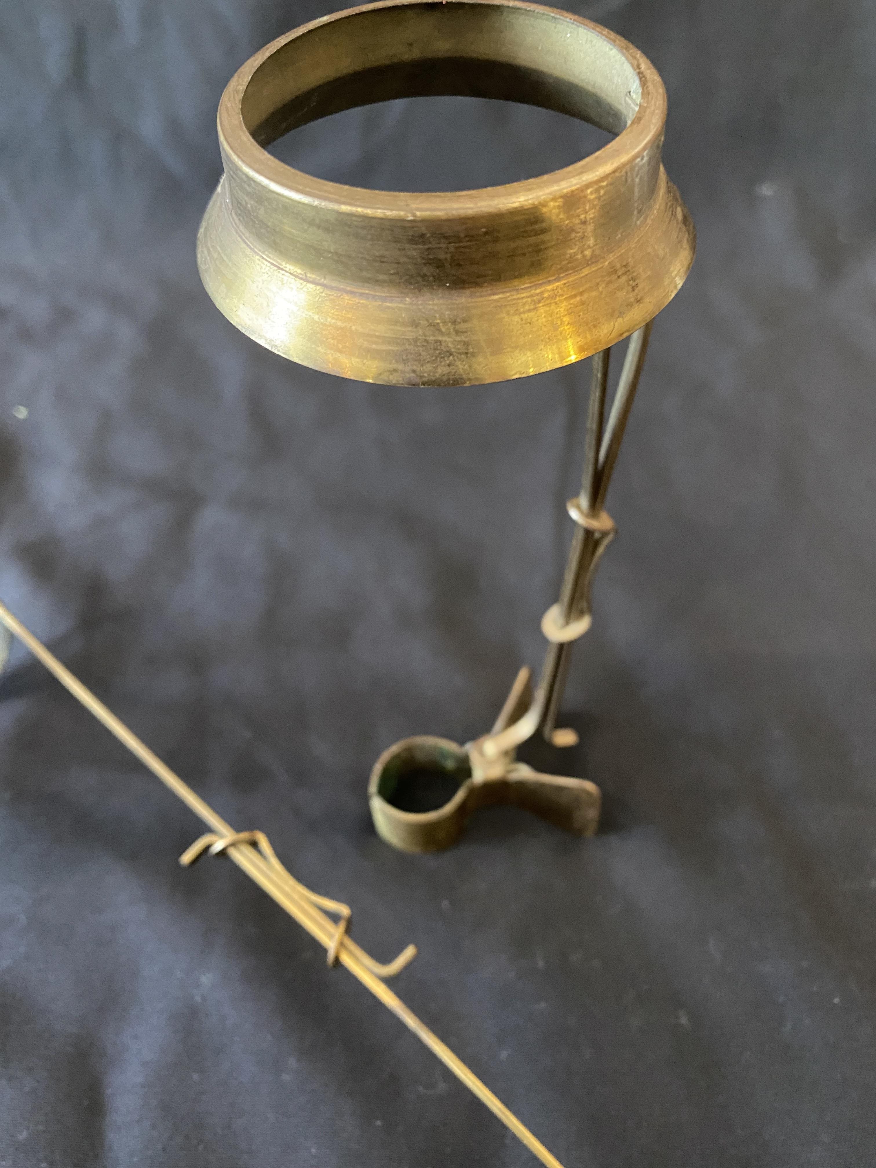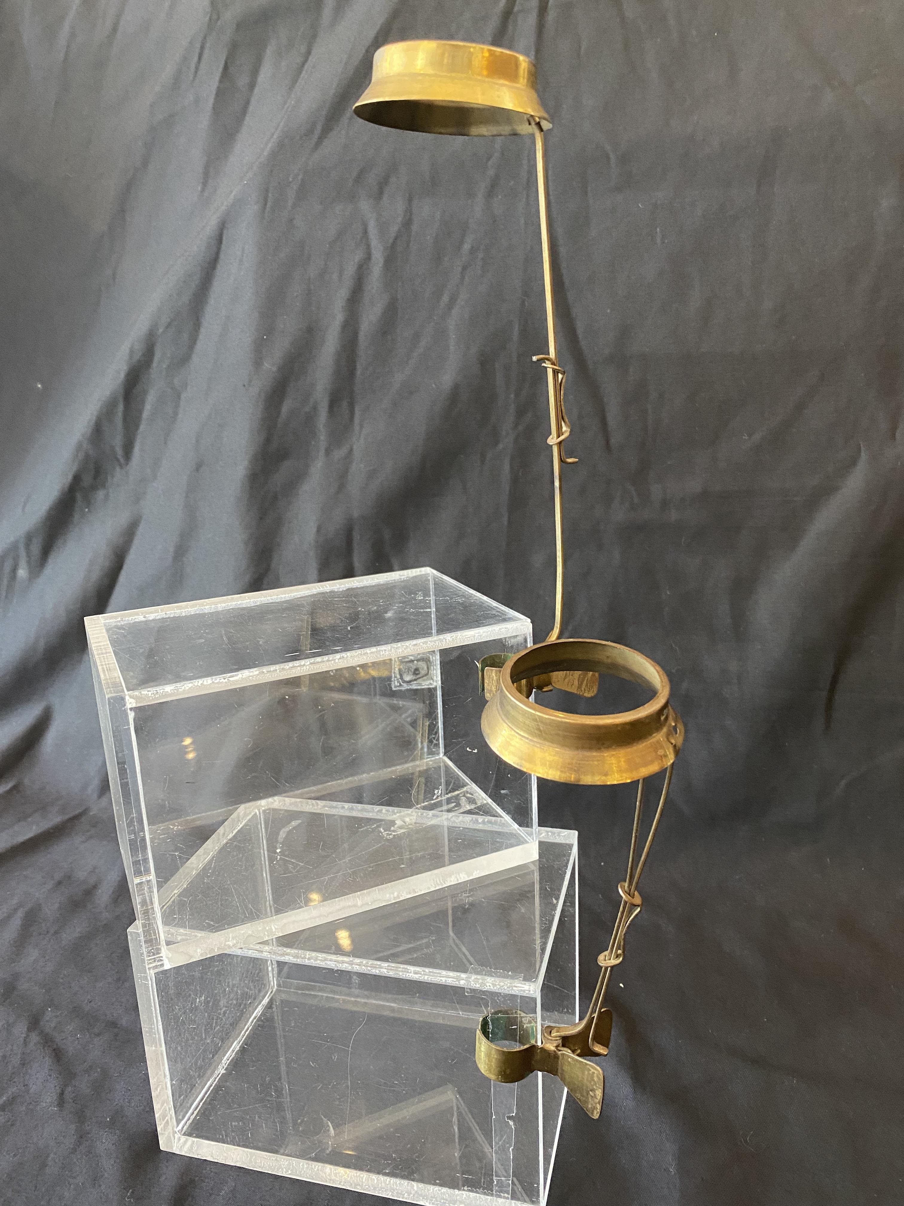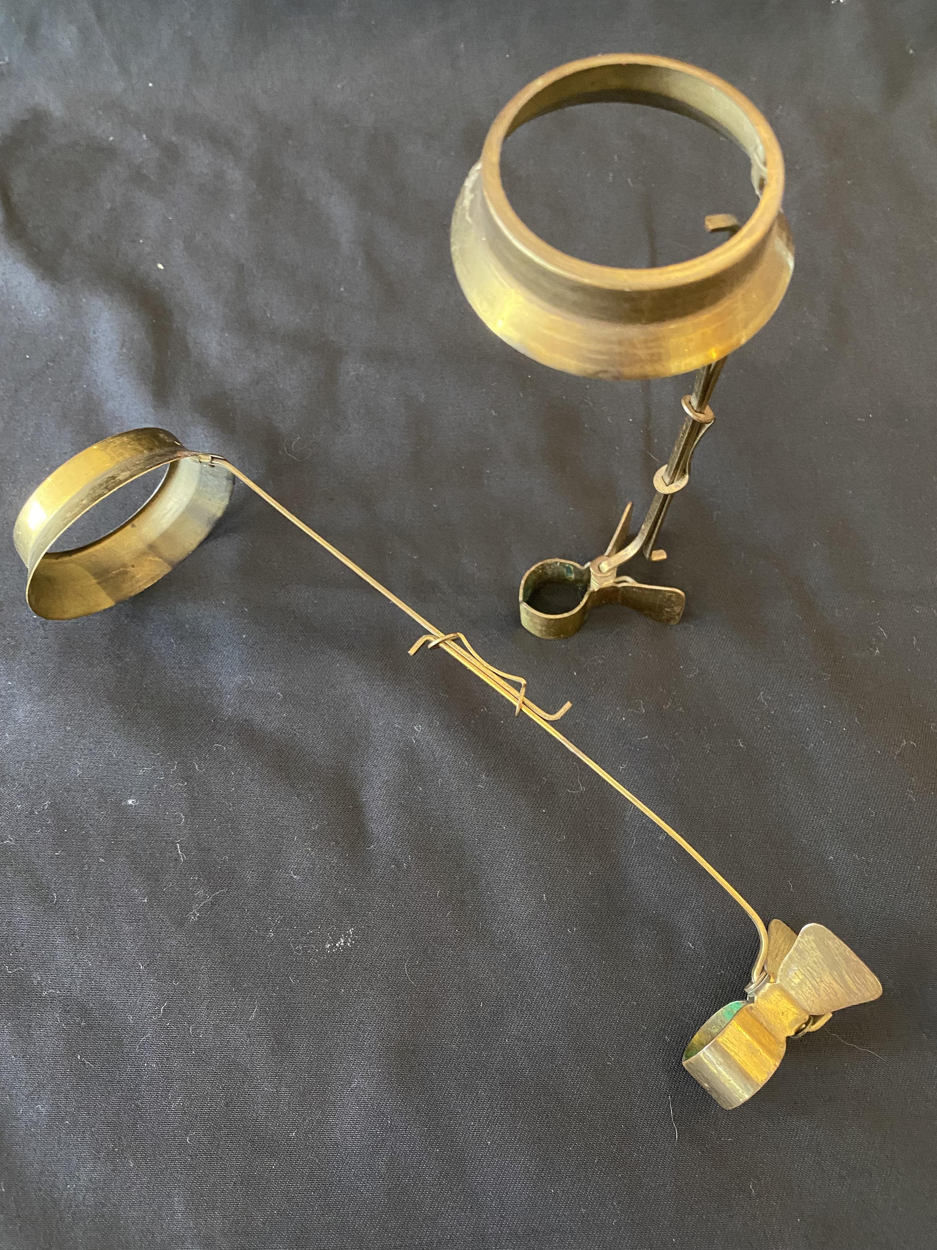 A very unusual pair of candlestick holders that have been designed to clip onto another object. The necks are extendable from an overall length of 140 mm to 220 mm. The diameter of each ring of 42 mm is larger than a modern candle and is perhaps for a religious sized one.