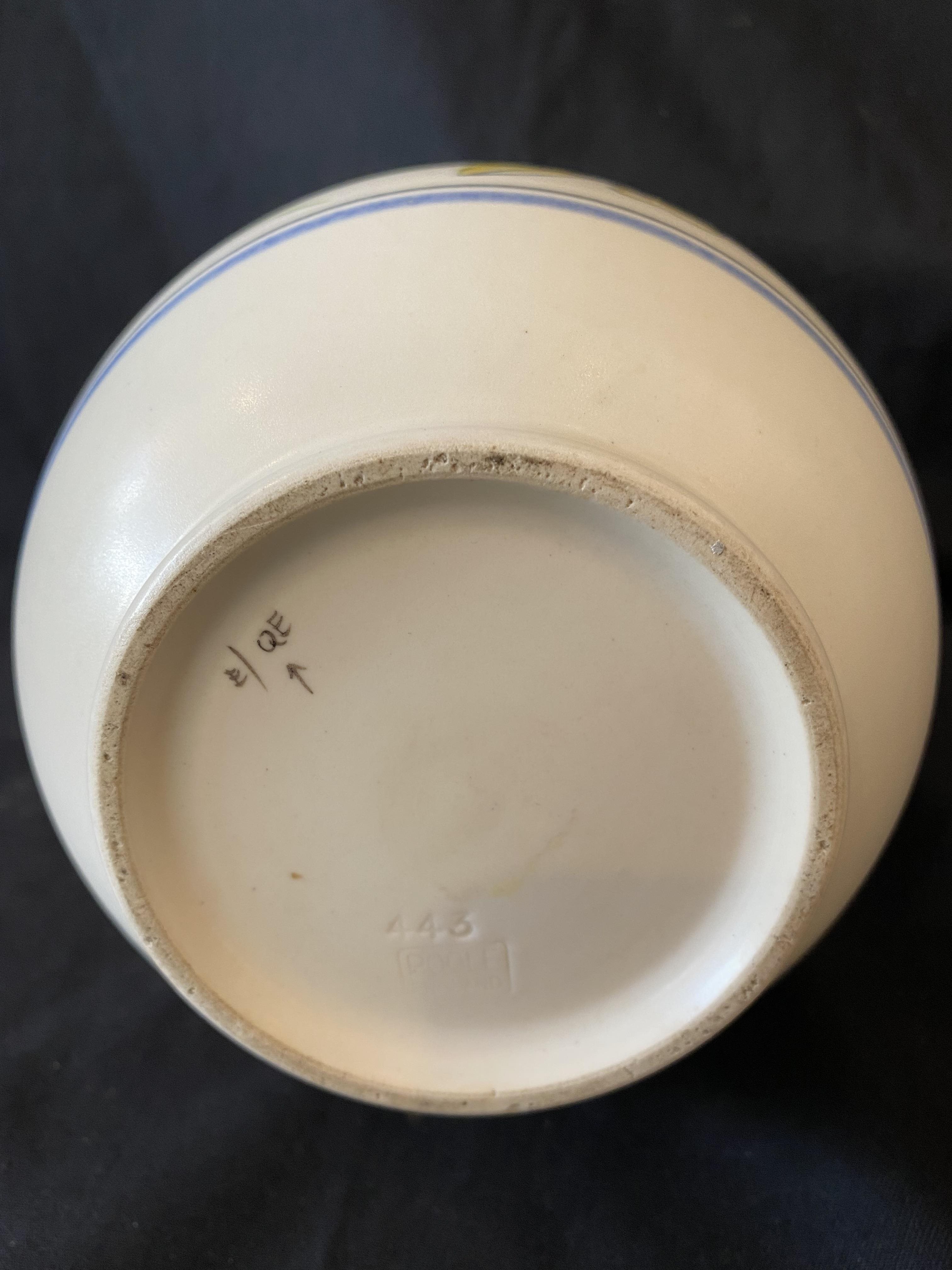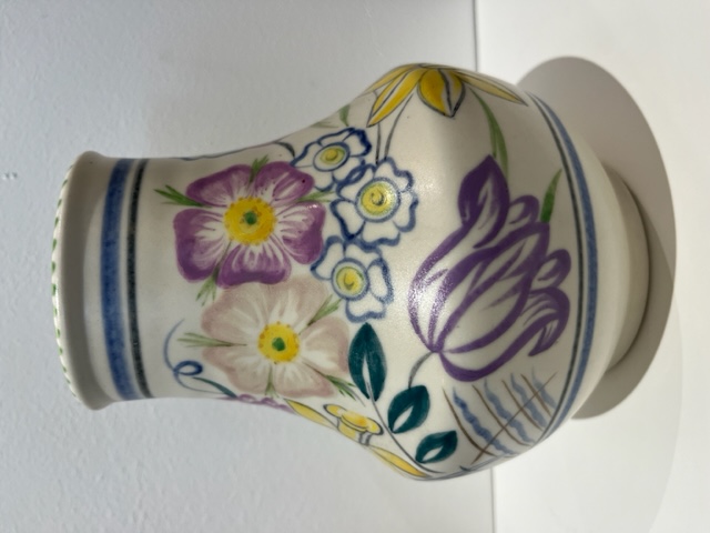 1940's Poole vase with yellow, purple and blue flowers. Impressed making to the base 443. Signed E/QE