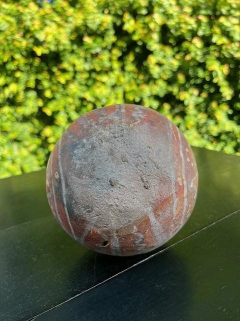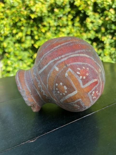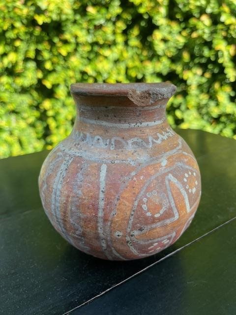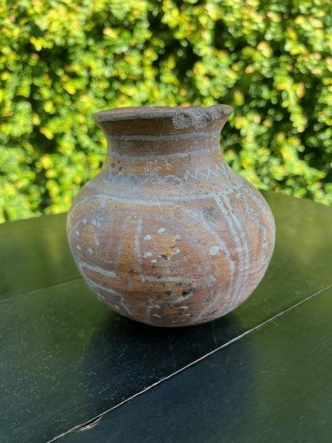 Beautiful red/brown pot or vase with painted decoration. Some damage to the rim but considering its at least a few hundred years old, its doing pretty well!