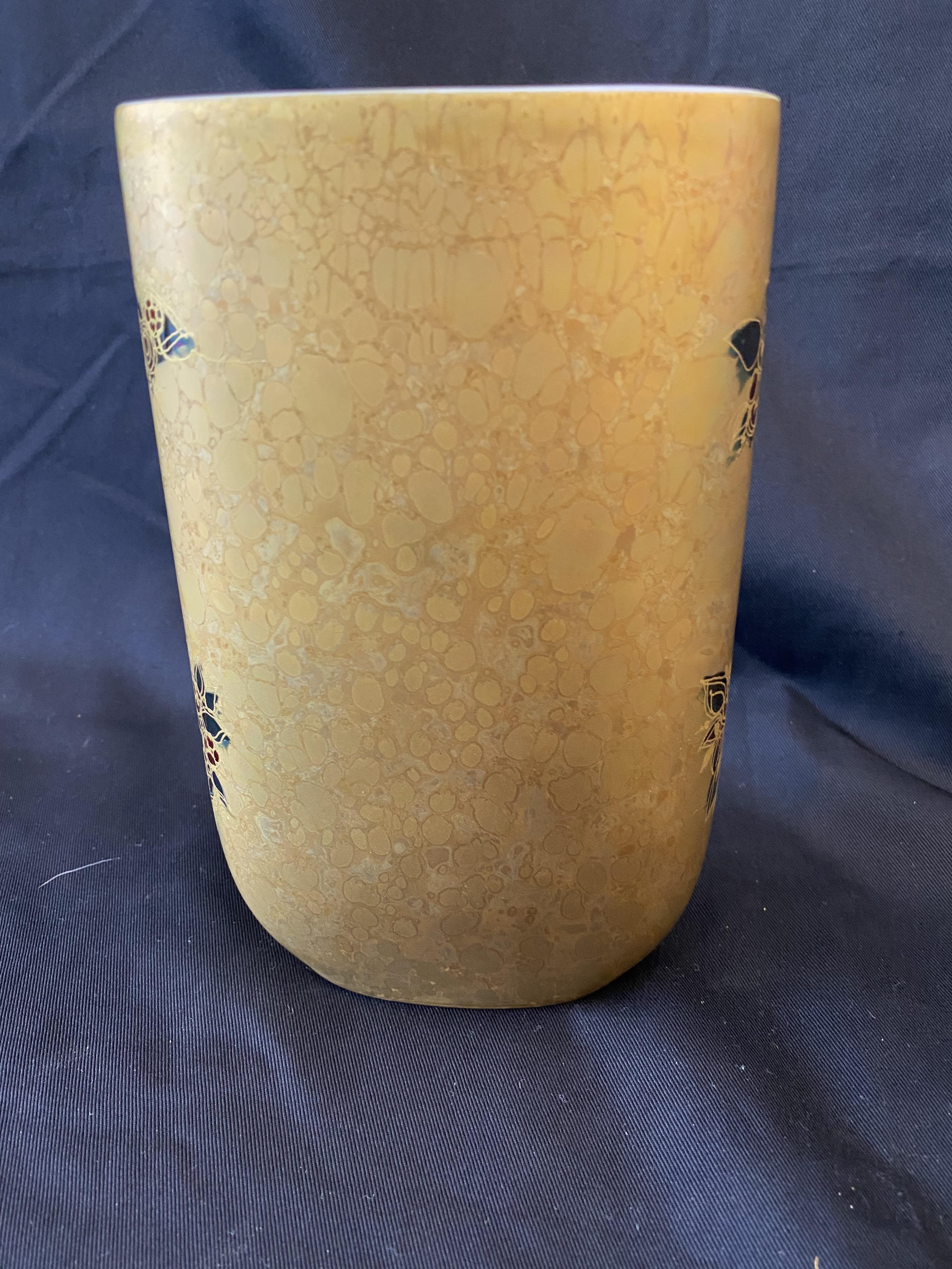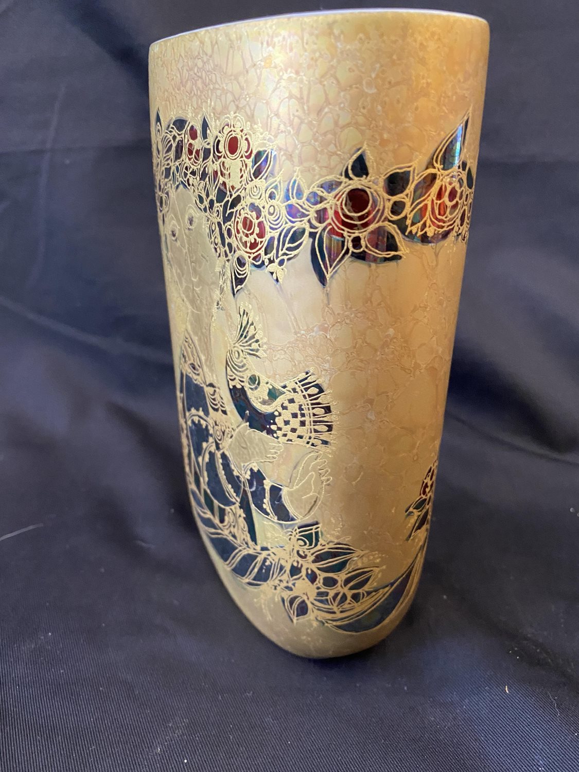 Wiinblad's work is of whimsical round-faced people, dressed in vaguely 19th-century costume. They are often surrounded by natural elements: twining vines, floral wreaths, and fantastical trees. His colors are saturated and strong and are often supplemented with metallic gold or silver.