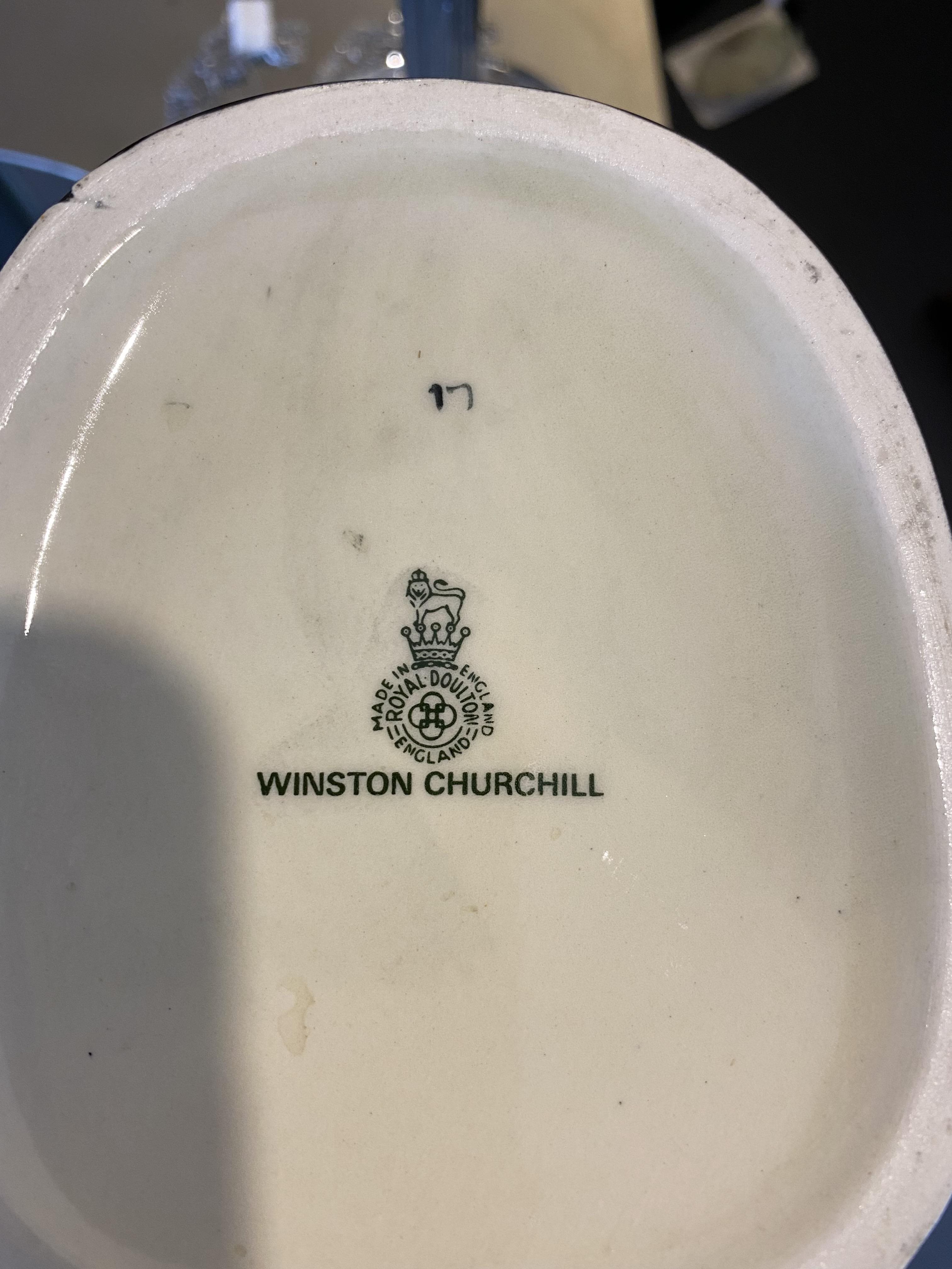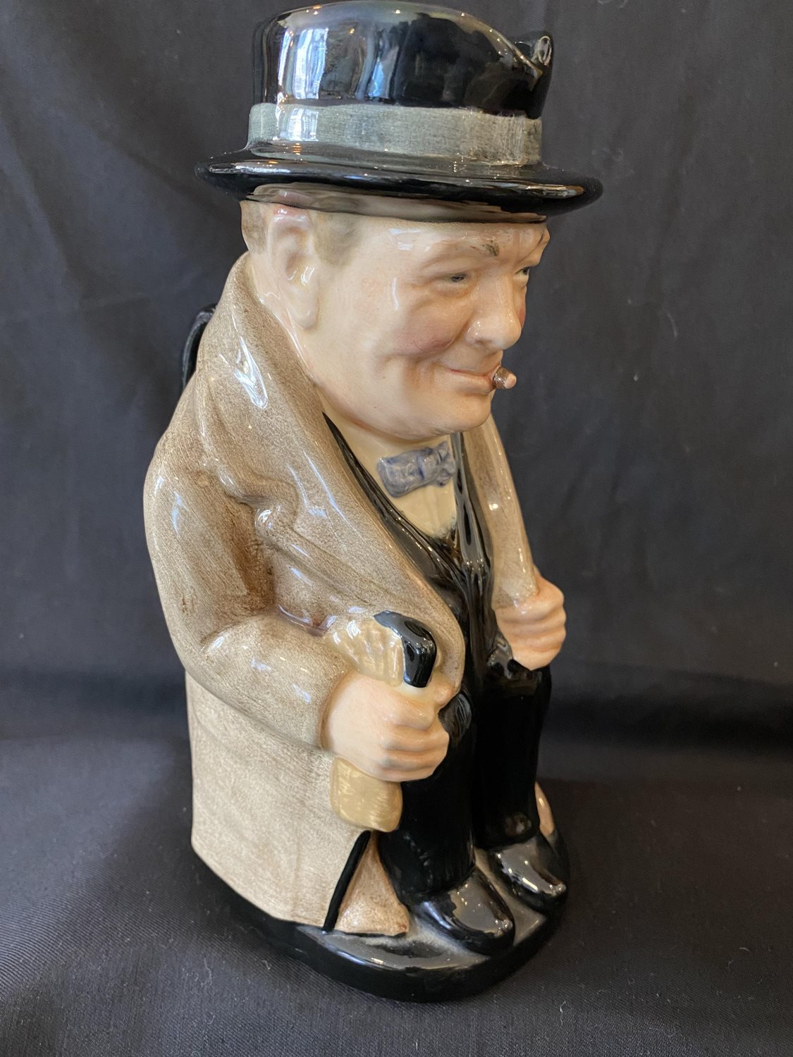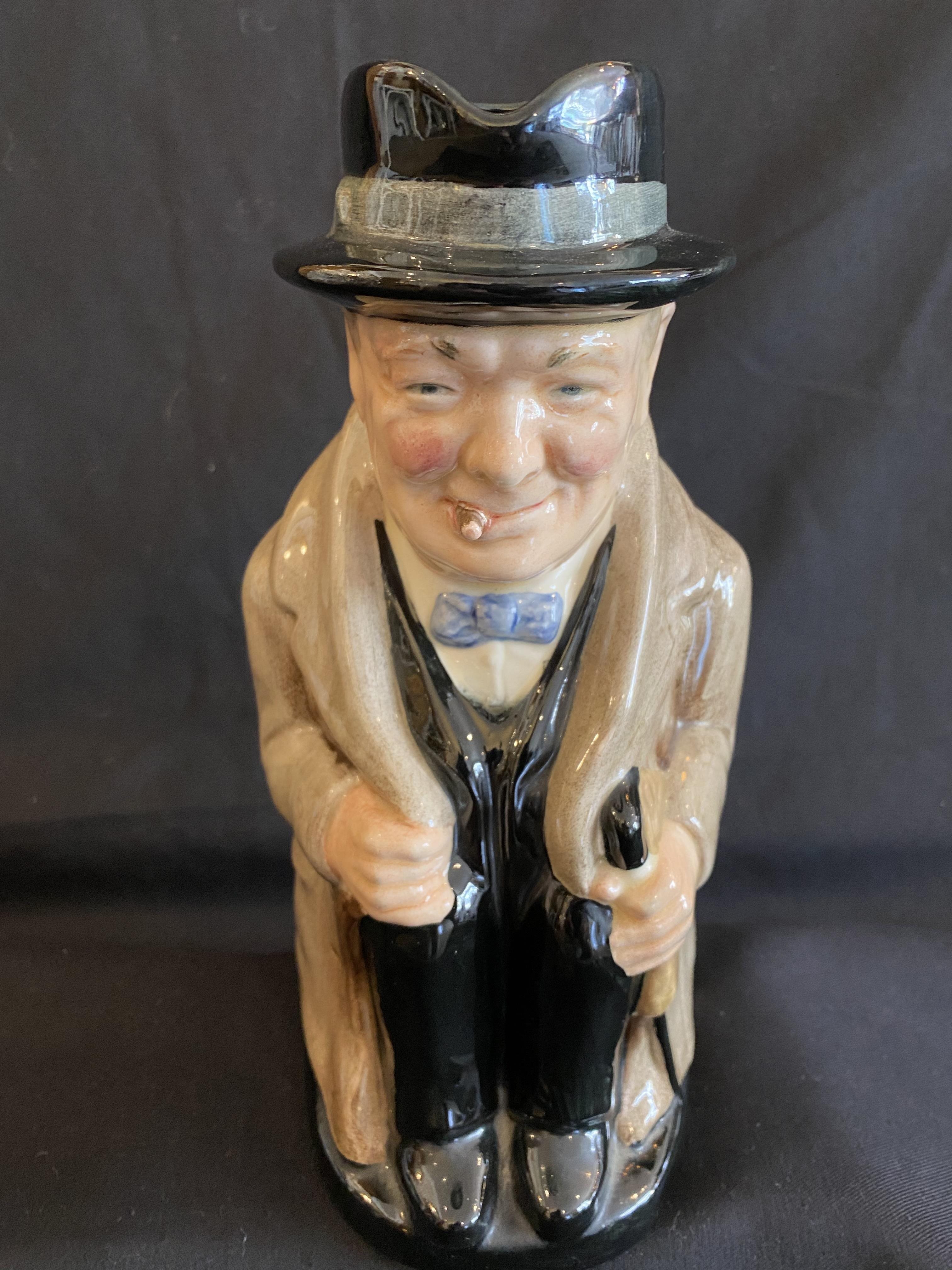 Royal Doultons most popular and successful toby jug, this excellent likeness of Winston Churchill, one of the greatest statesman in world history, reaching the height of his fame as the heroic Prime Minister of Great Britain during World War II, enjoyed a fifty-year production run. Each of the toby’s (large 9, medium 5″, small 4″) was modeled by one of Royal Doulton most prolific modelers, Harry Fenton, in 1940.
