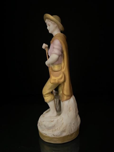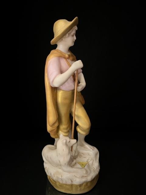 Well modelled and attractive figurine of a Shepherd Boy in golden clothes with a staff and his dog.