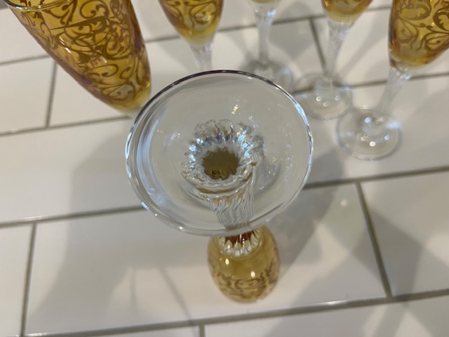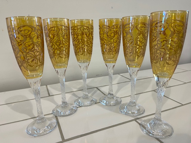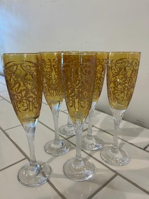 Glorious set of 6 italian etched champagne flutes. Gorgeous stems.