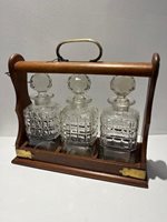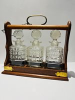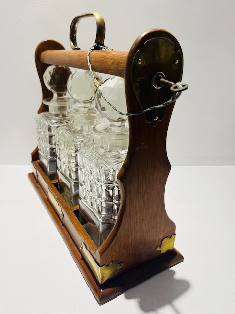 This three-bottle tantalus (decanter caddy), has an oak carry frame that holds matching cut-glass spirit decanters, originally designed so the bottles were